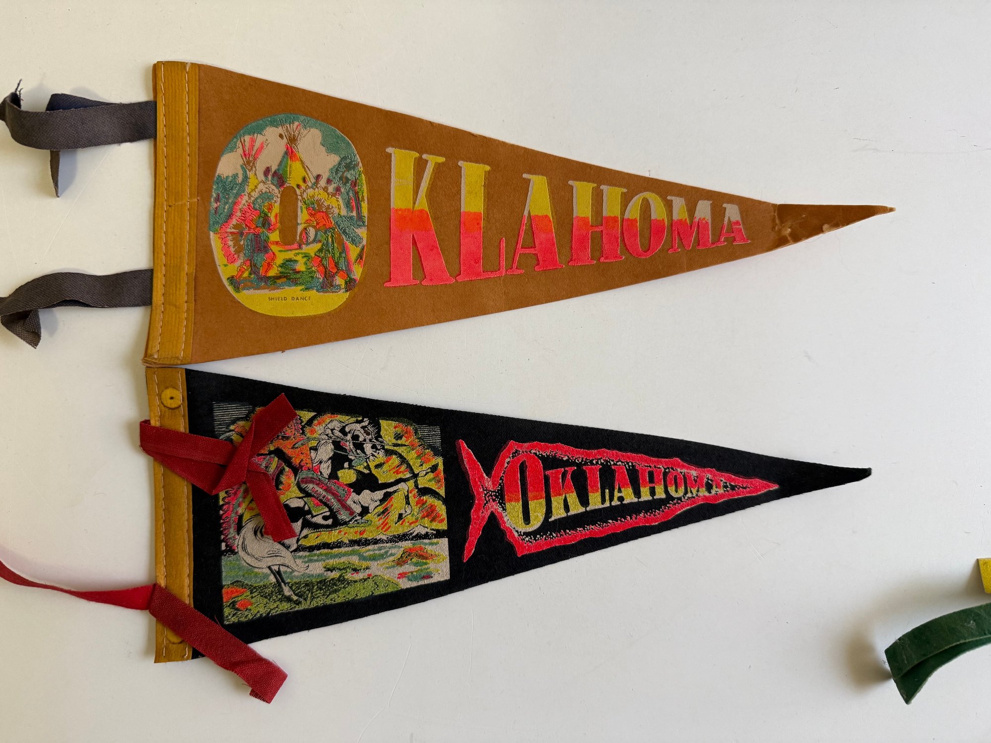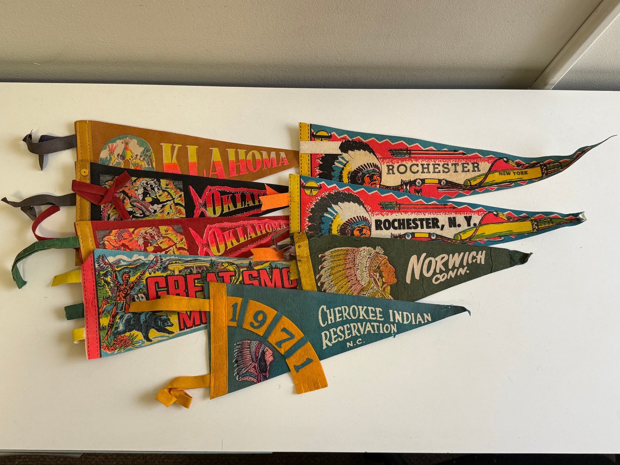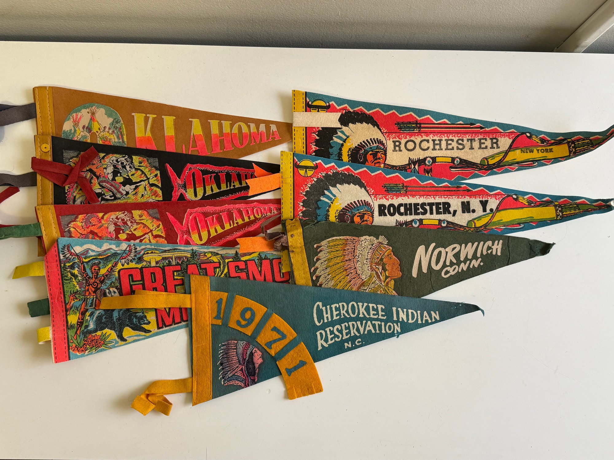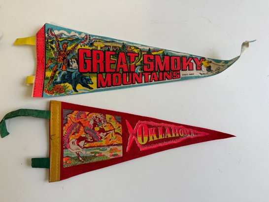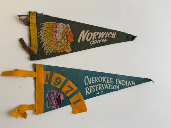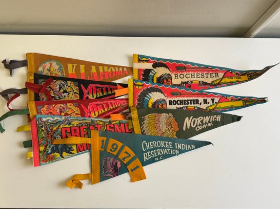 Vintage felt pennants featuring Native Americans. Sizes vary, the longest is approximately 14” long