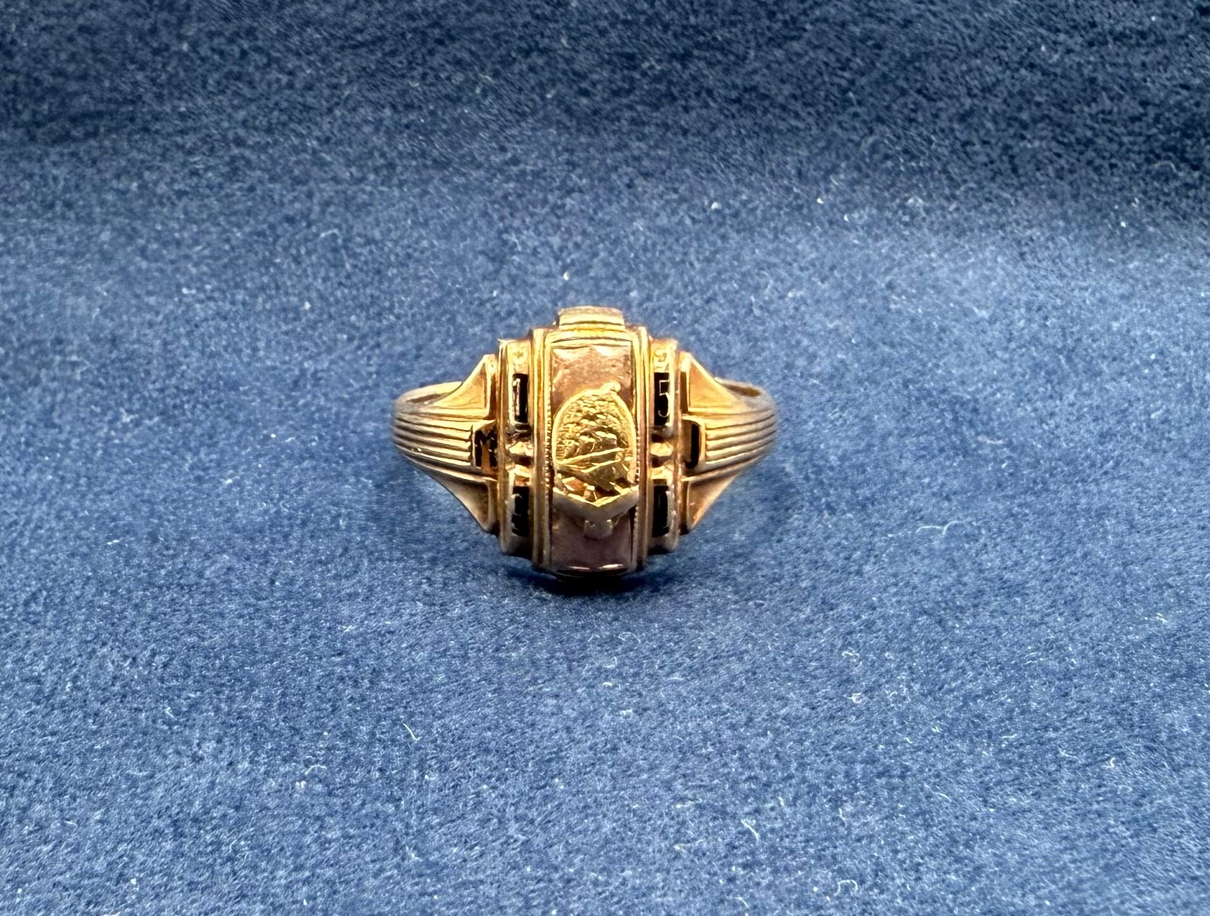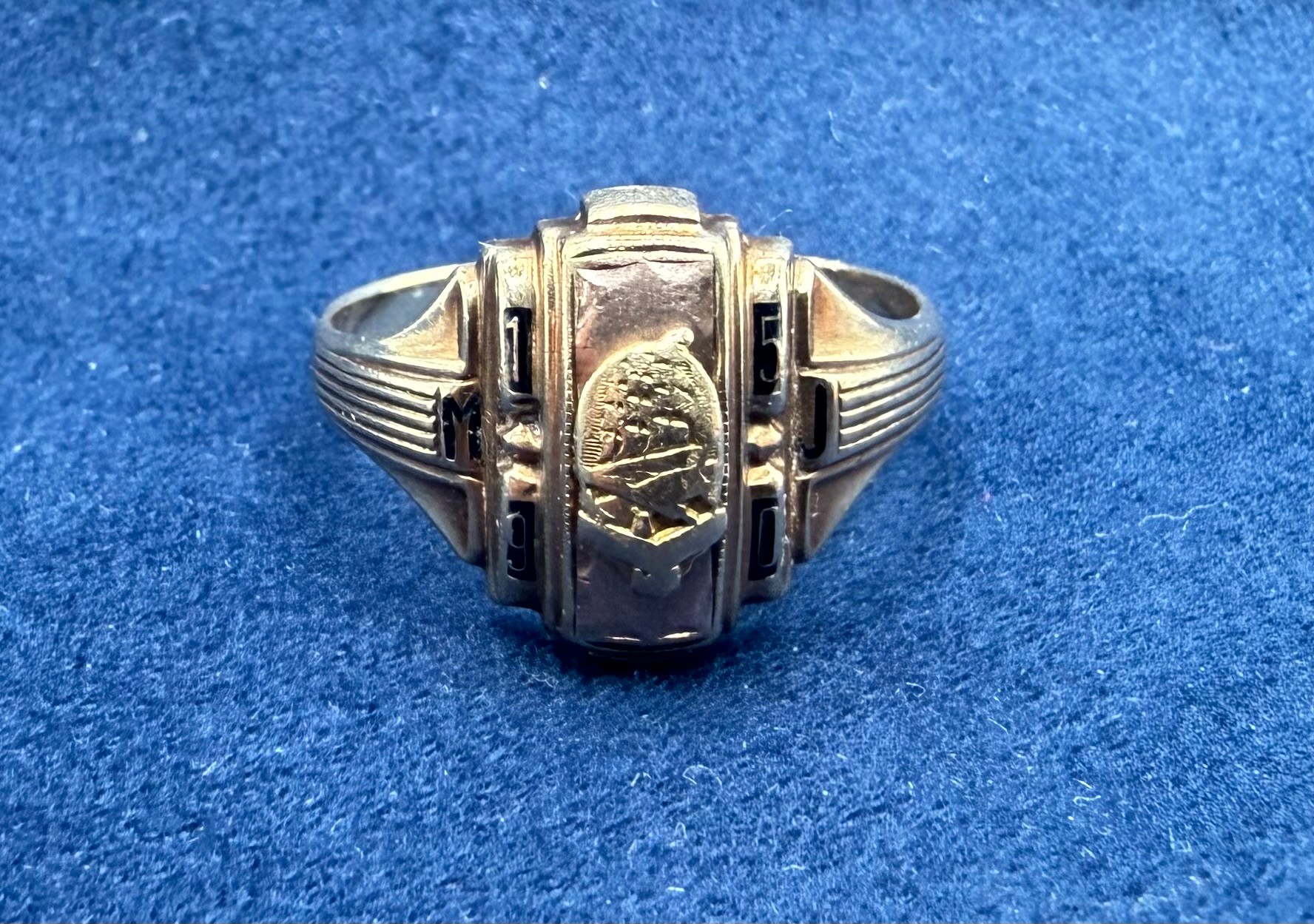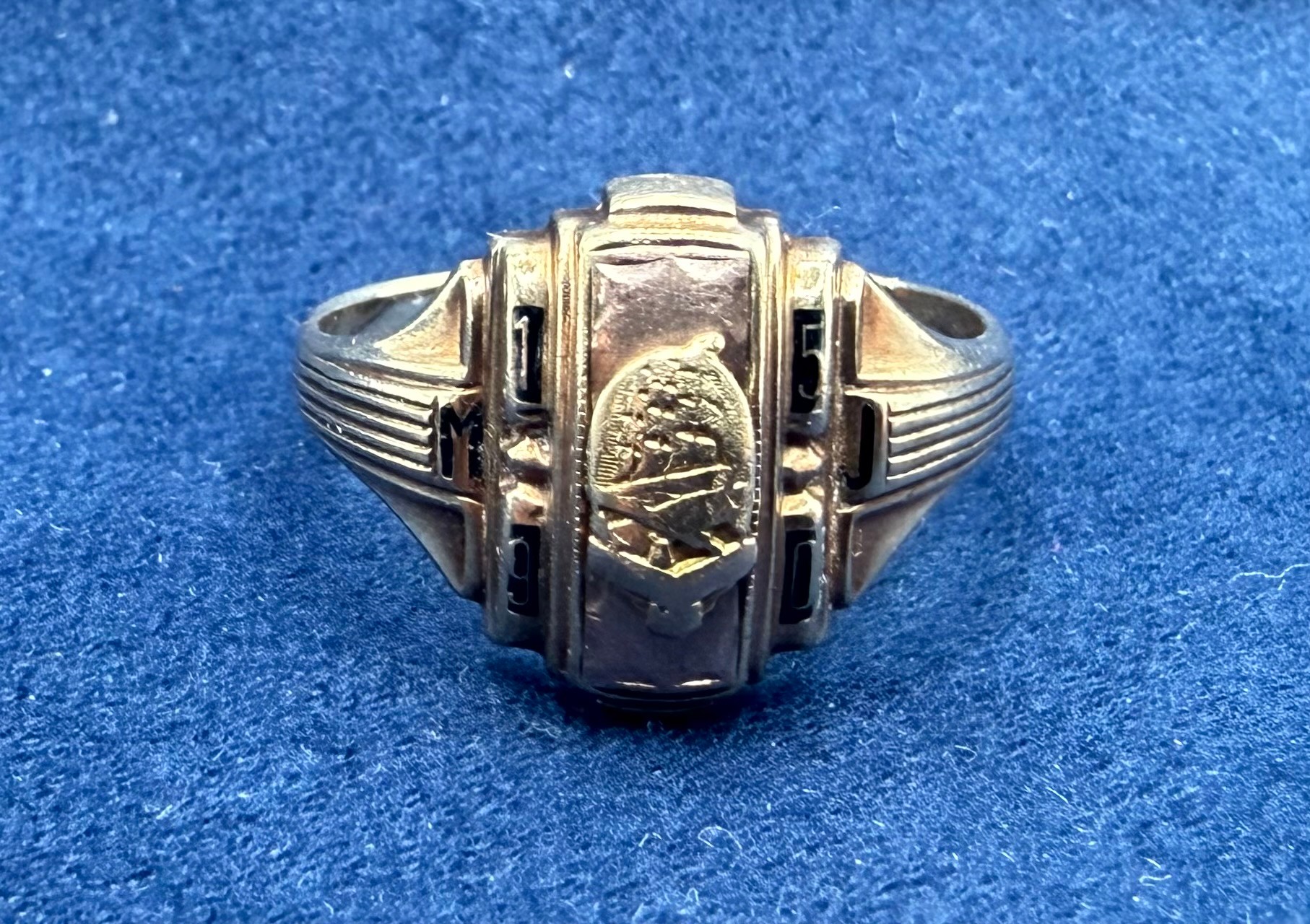 3.59g, size 7-1/2, has the year 1950 and letters M&J on the face, marked “Josten 10k”, see photographs for more details
