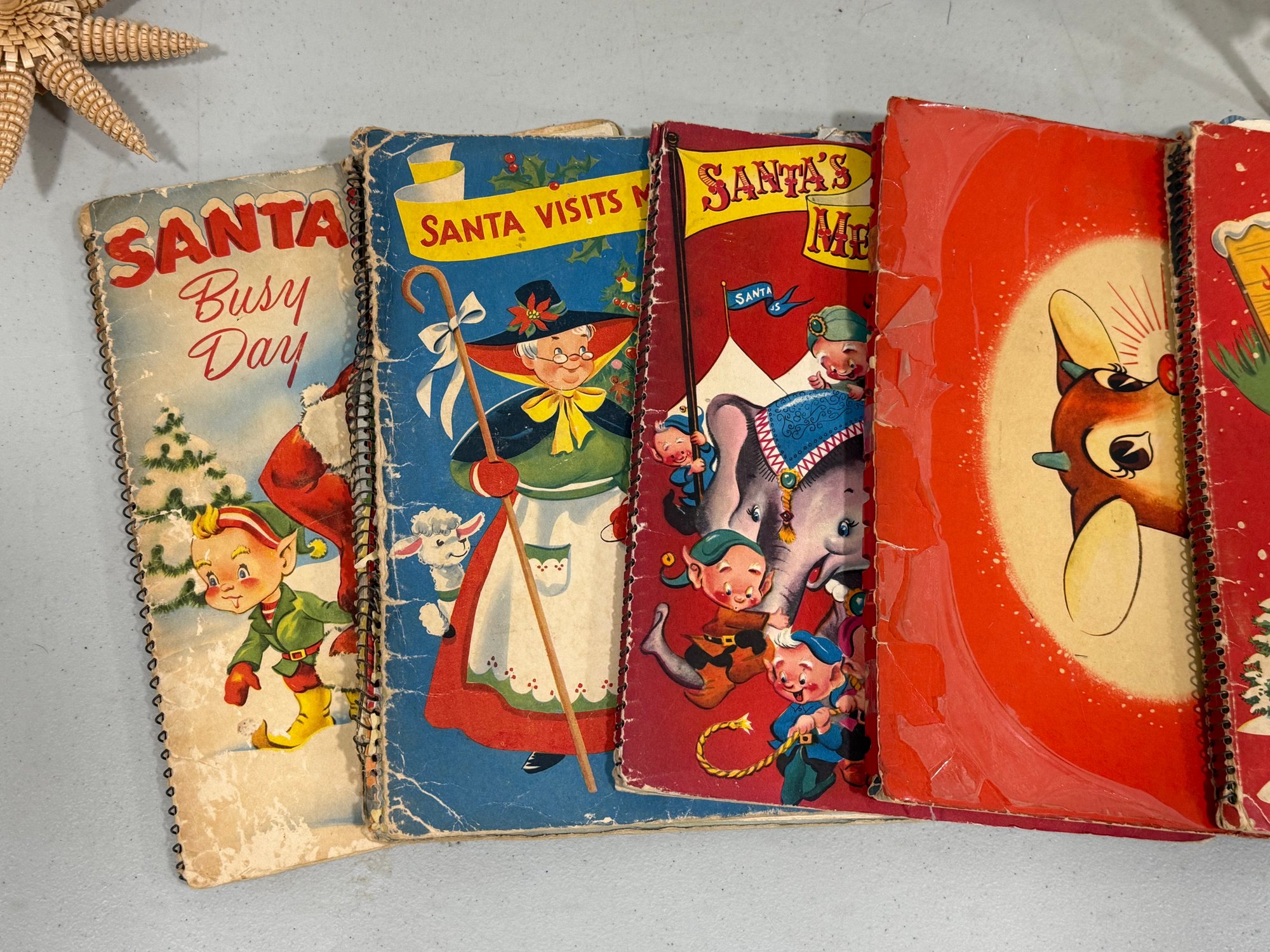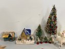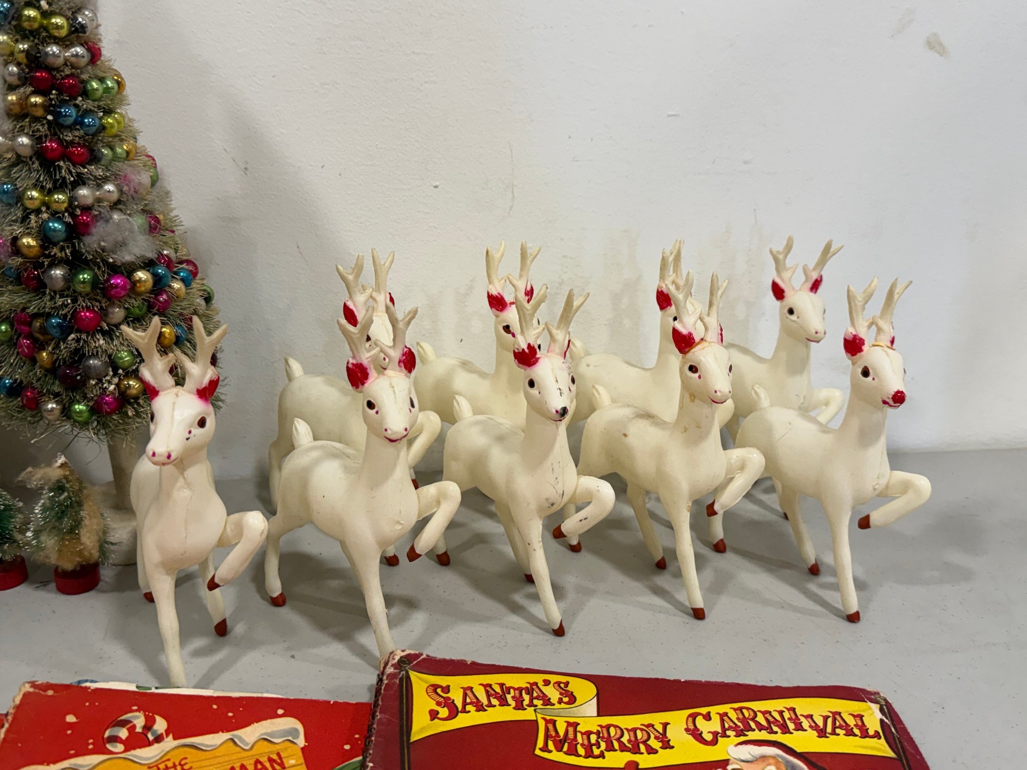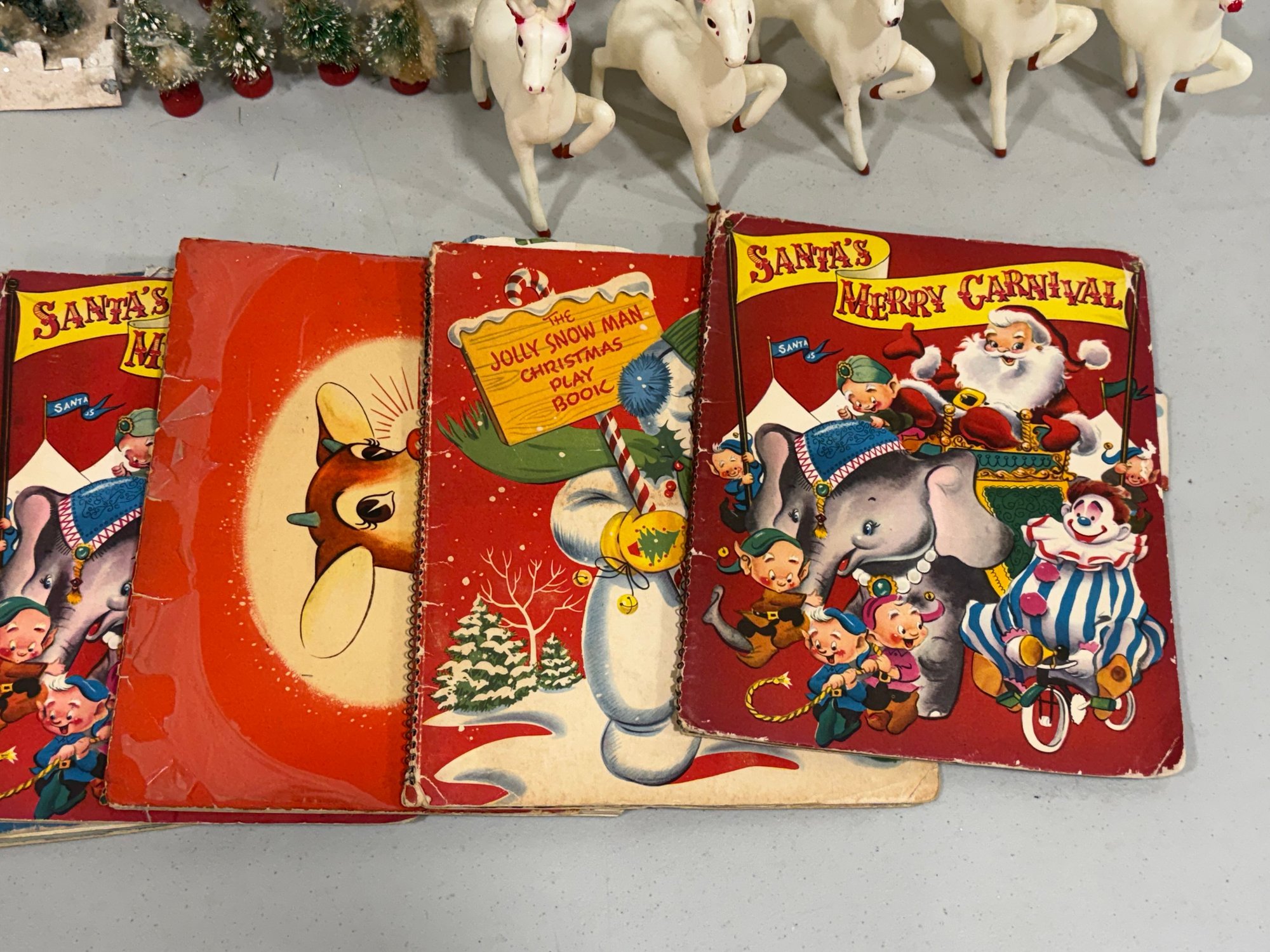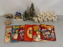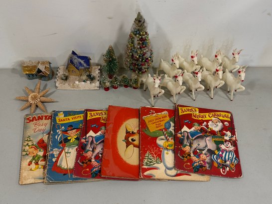 Includes everything shown. The tallest tree measures 14". Deer are marked "Japan" with a clover mark. The books have vibrant color and graphics, unfortunately they are not in great condition. Please review the photographs for more details