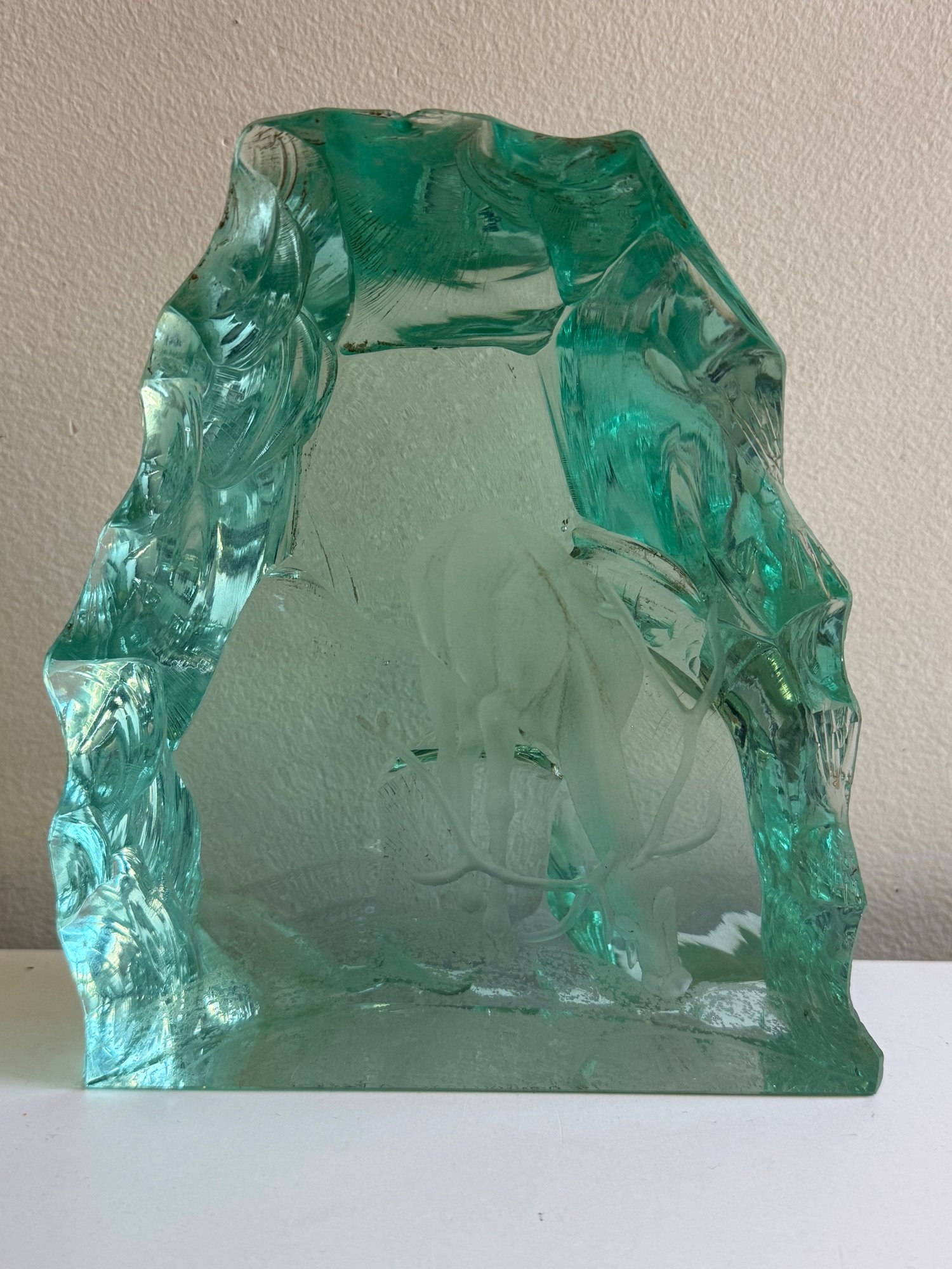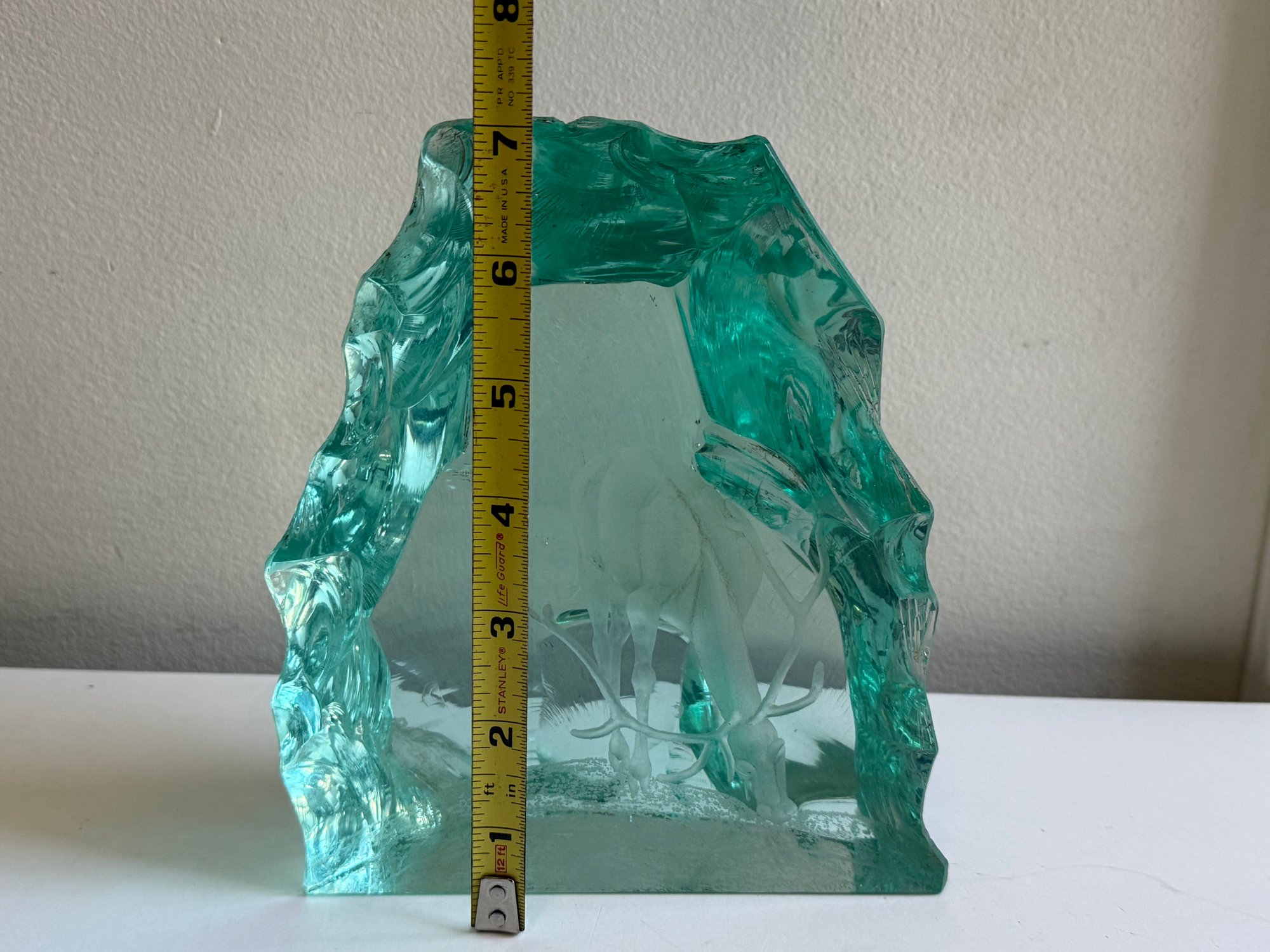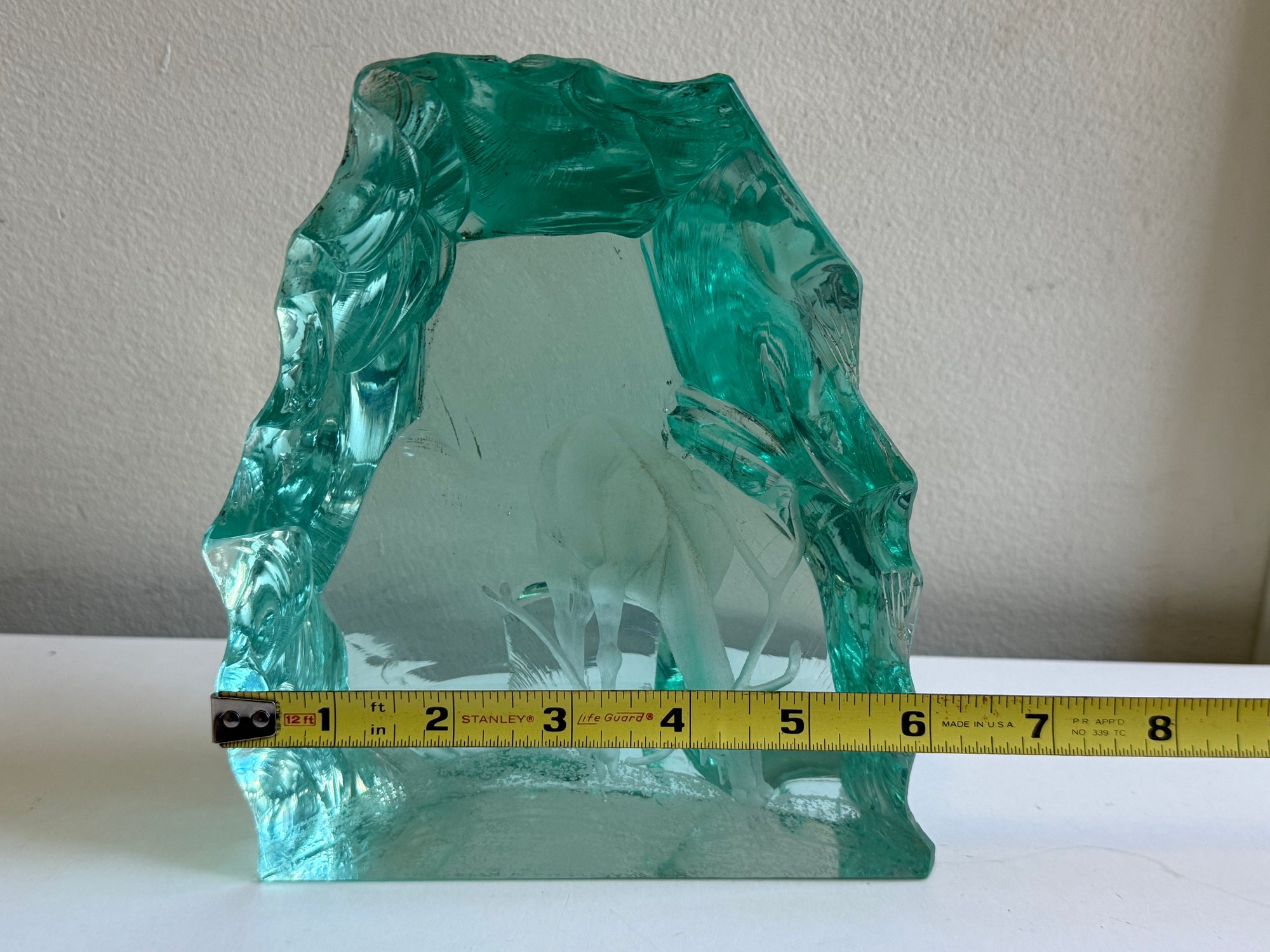 Stands 7” tall and is 6” wide. Please review the photographs for more details.