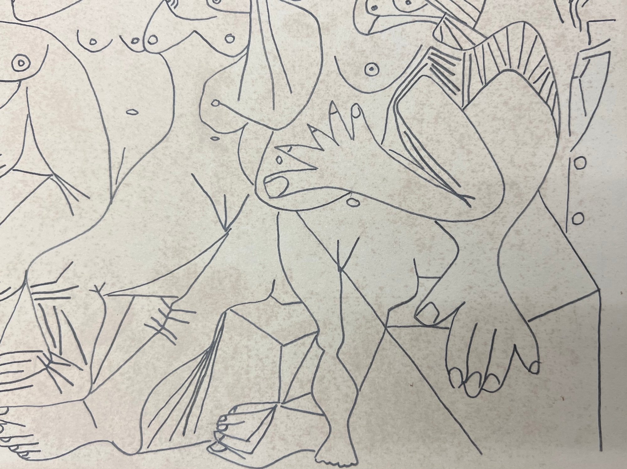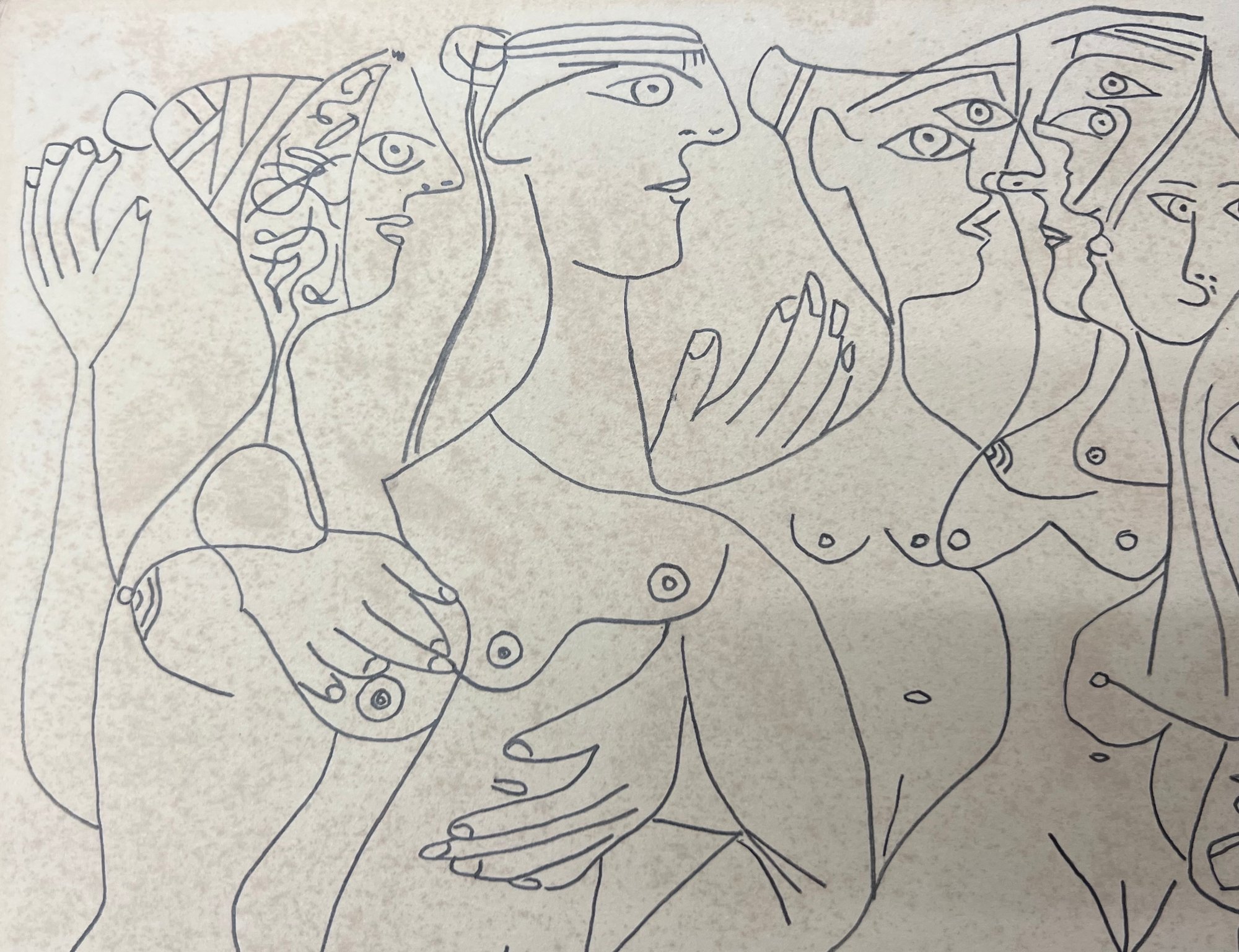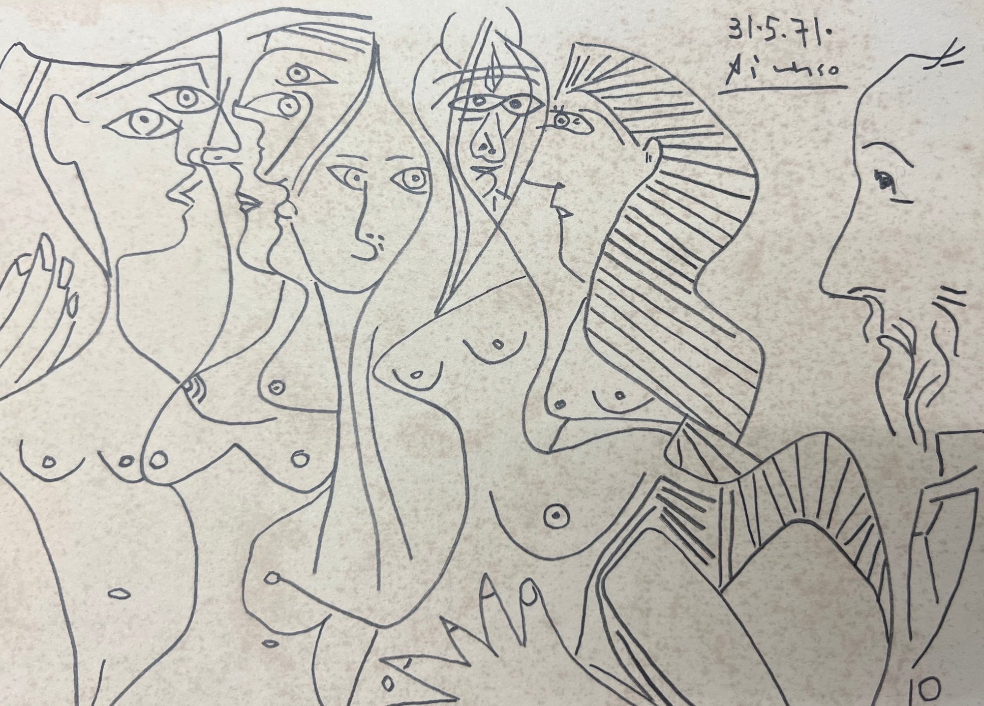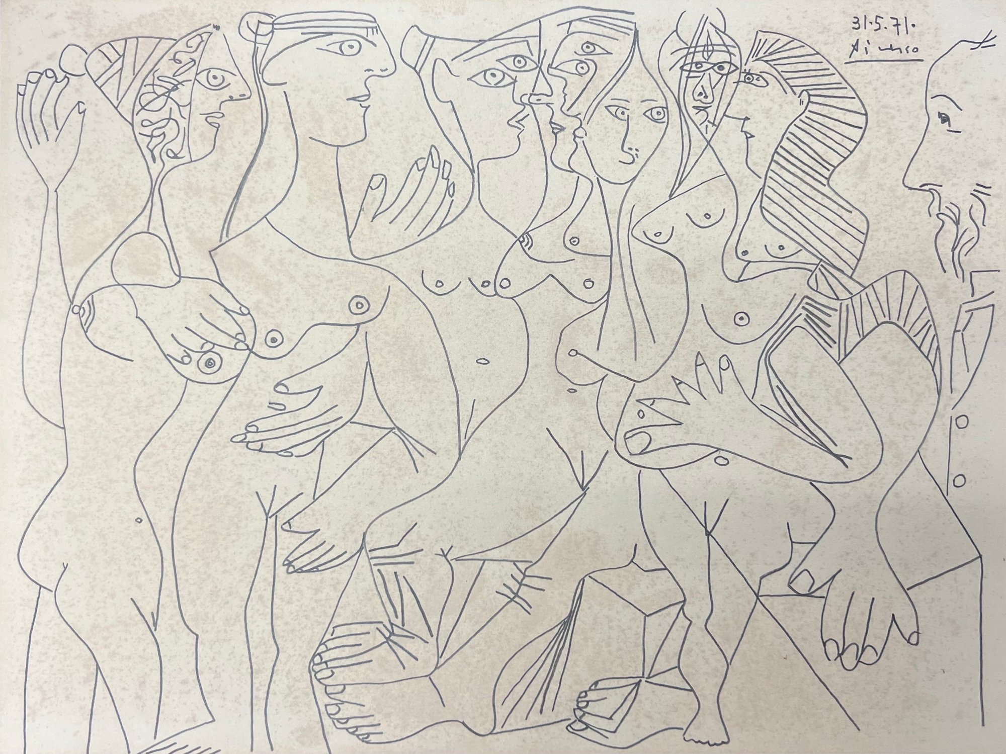 "Pablo Picasso (Spanish, 1881-1973) Manner of/ Attributed: Cubist Figures. Pencil on heavy paper, signed and date (31.5.71.) in pencil upper right. Unframed. The drawing offered comprises part of the ""Pacific Palisades Collection""; so named for their Southern California location of acquisition from London, England based art dealer Bill Ferrari during the years spanning 2004-2008.