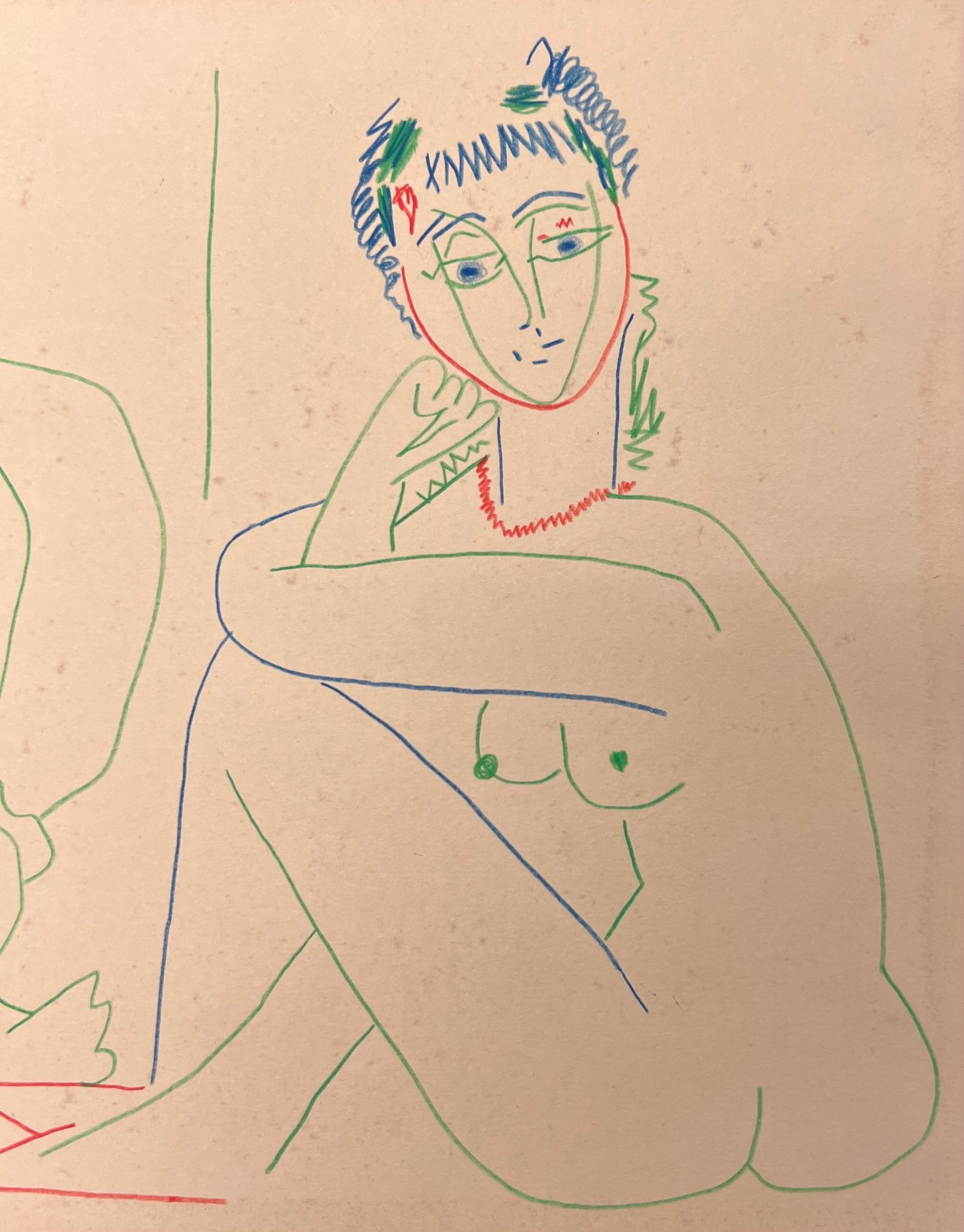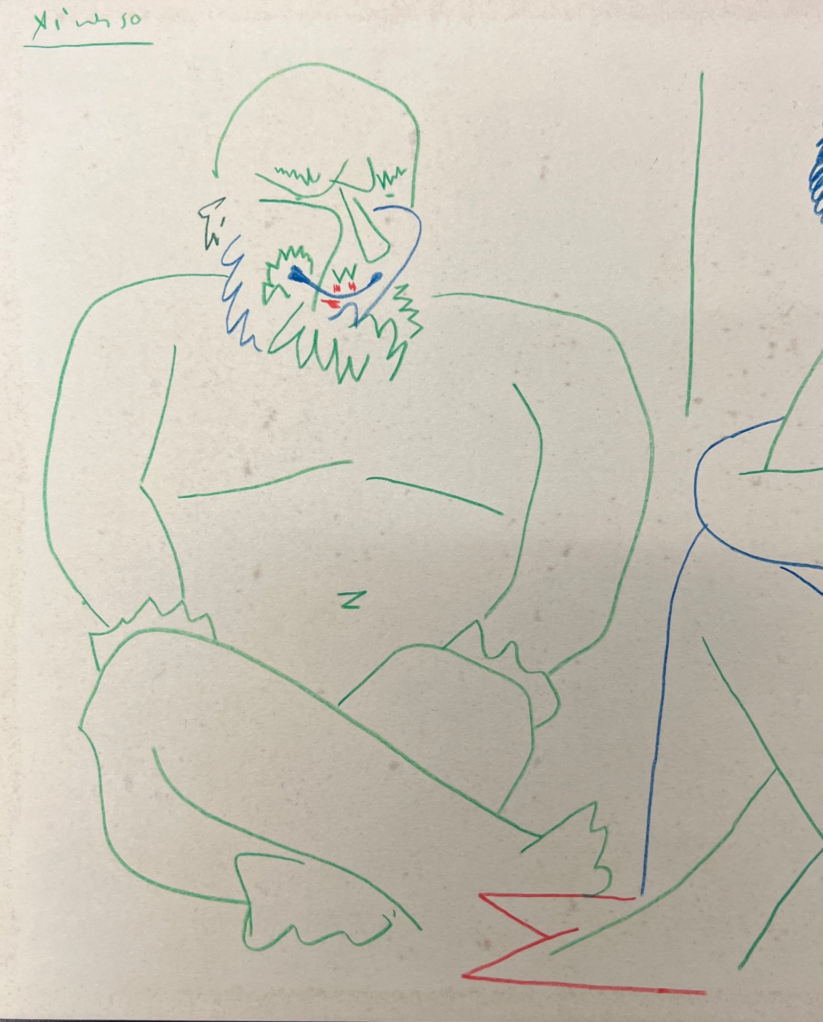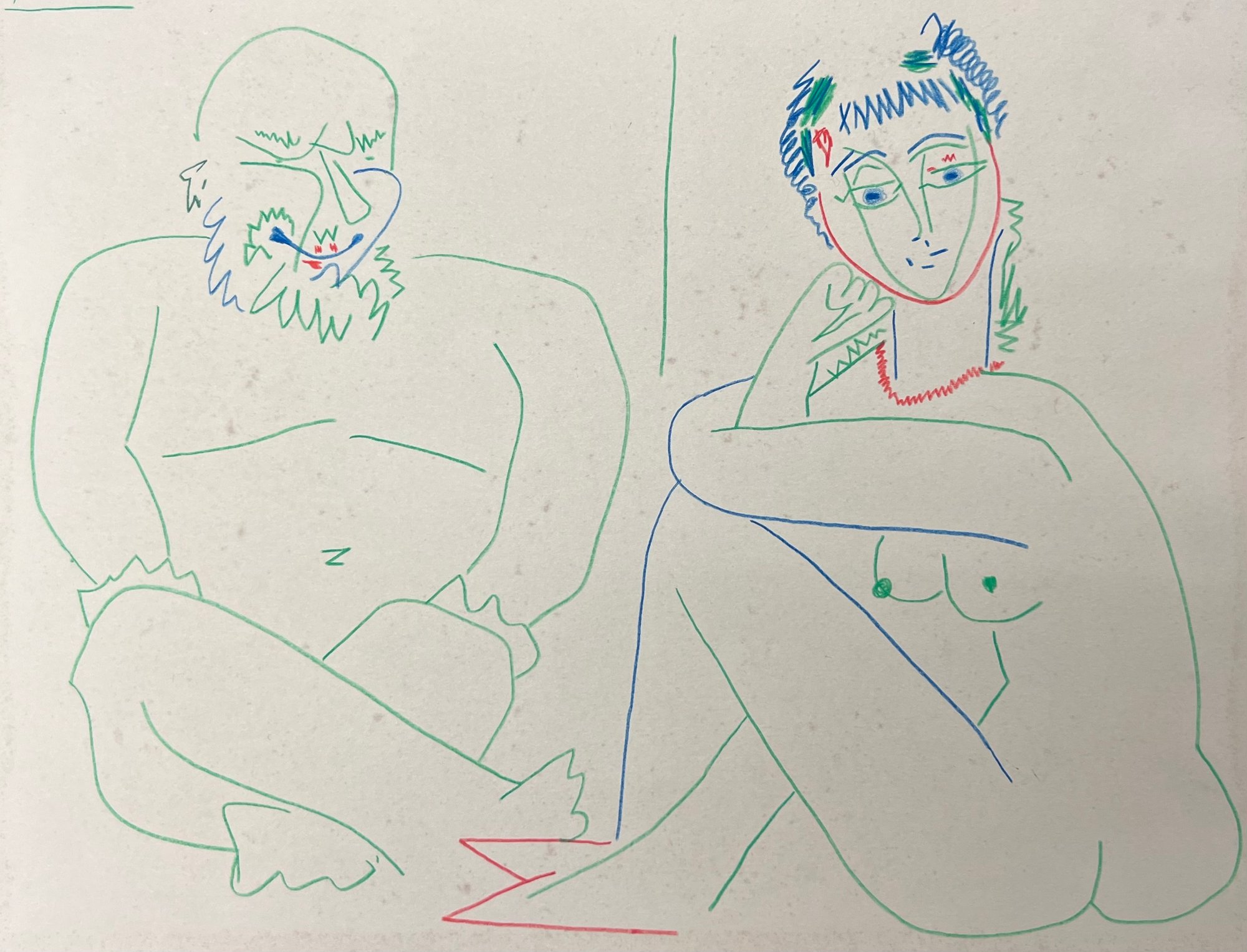 "Pablo Picasso (Spanish, 1881-1973) Manner of/ Attributed: Deux Personnages Assis. Crayon on heavy paper, signed upper left. Unframed. The drawing offered comprises part of the ""Pacific Palisades Collection""; so named for their Southern California location of acquisition from London, England based art dealer Bill Ferrari during the years spanning 2004-2008.