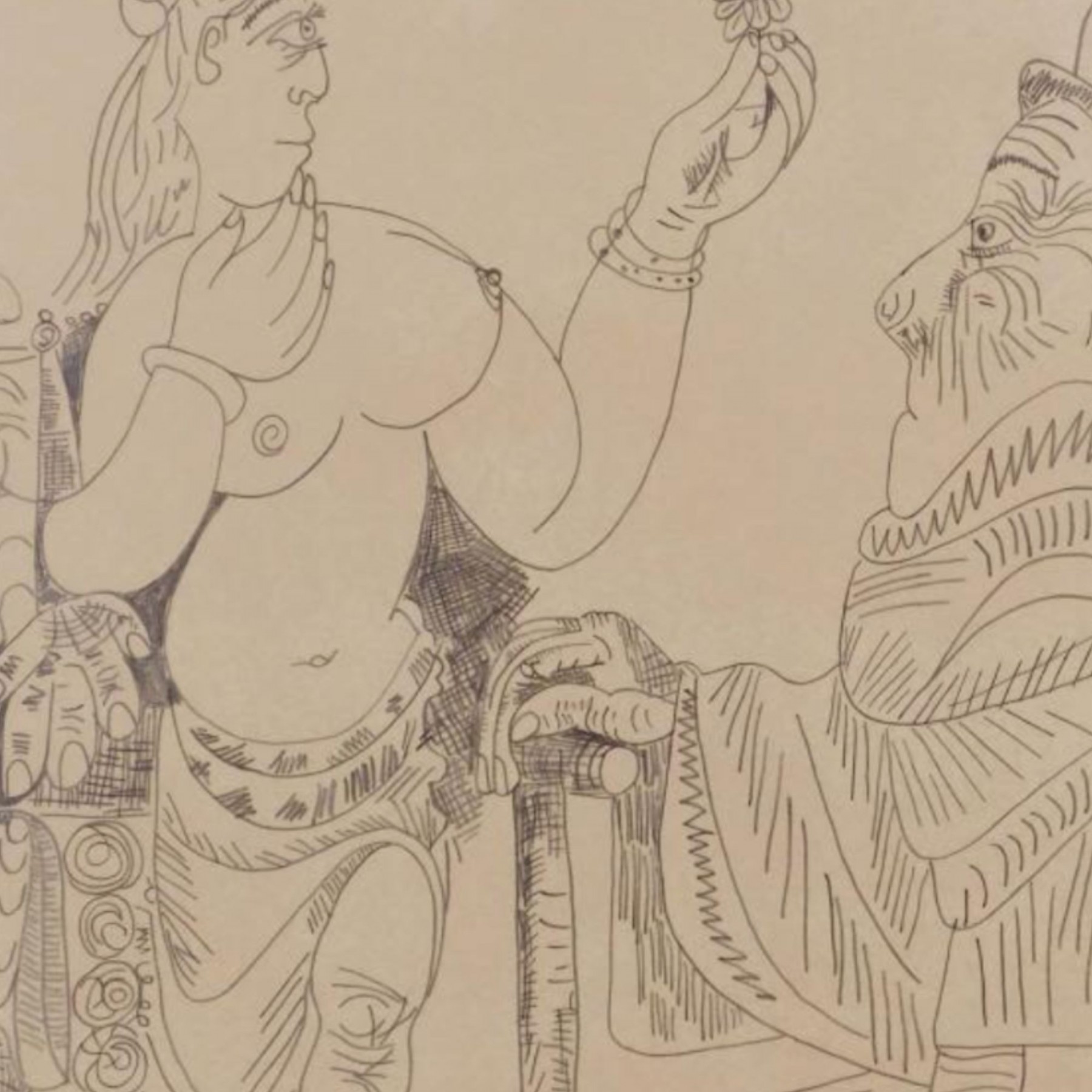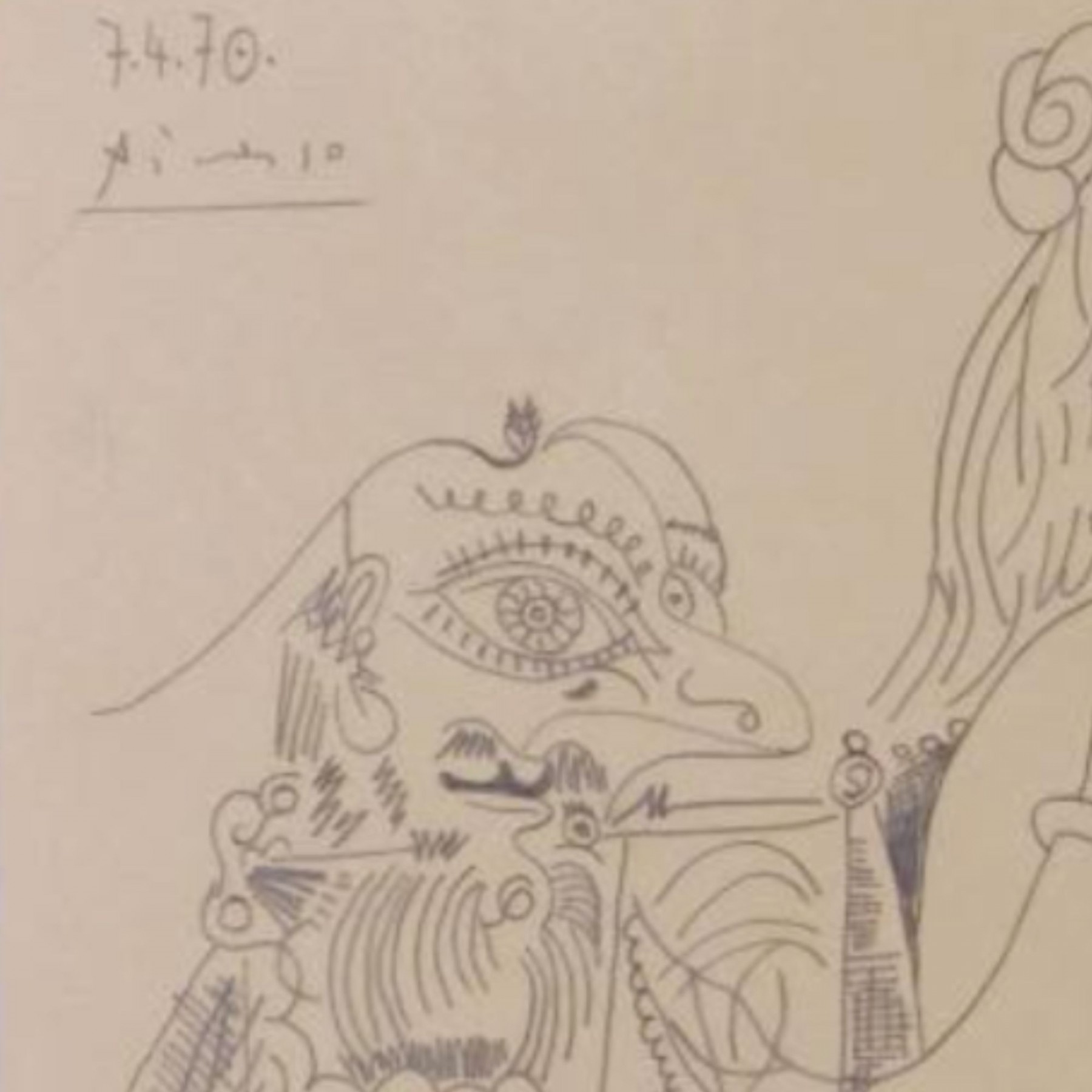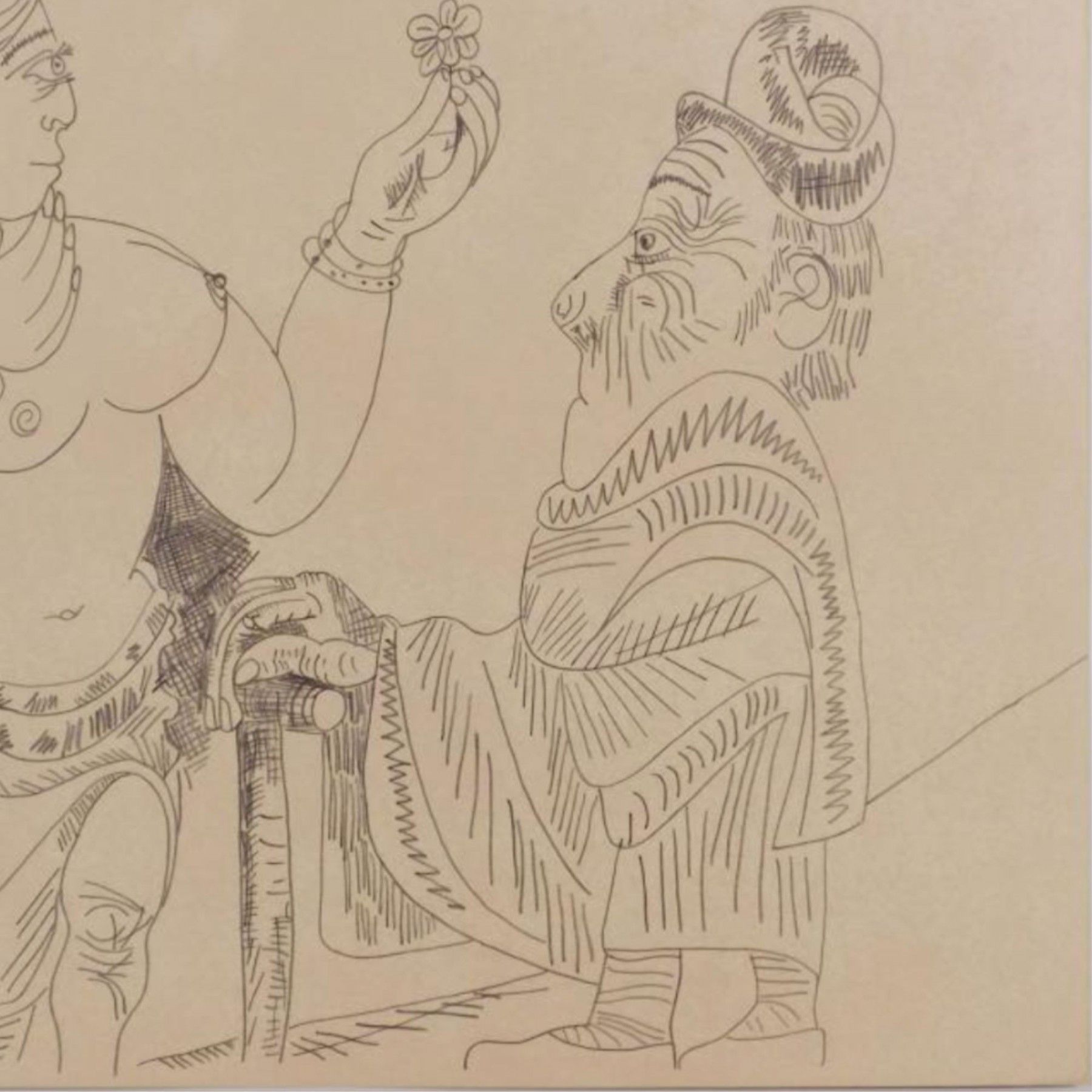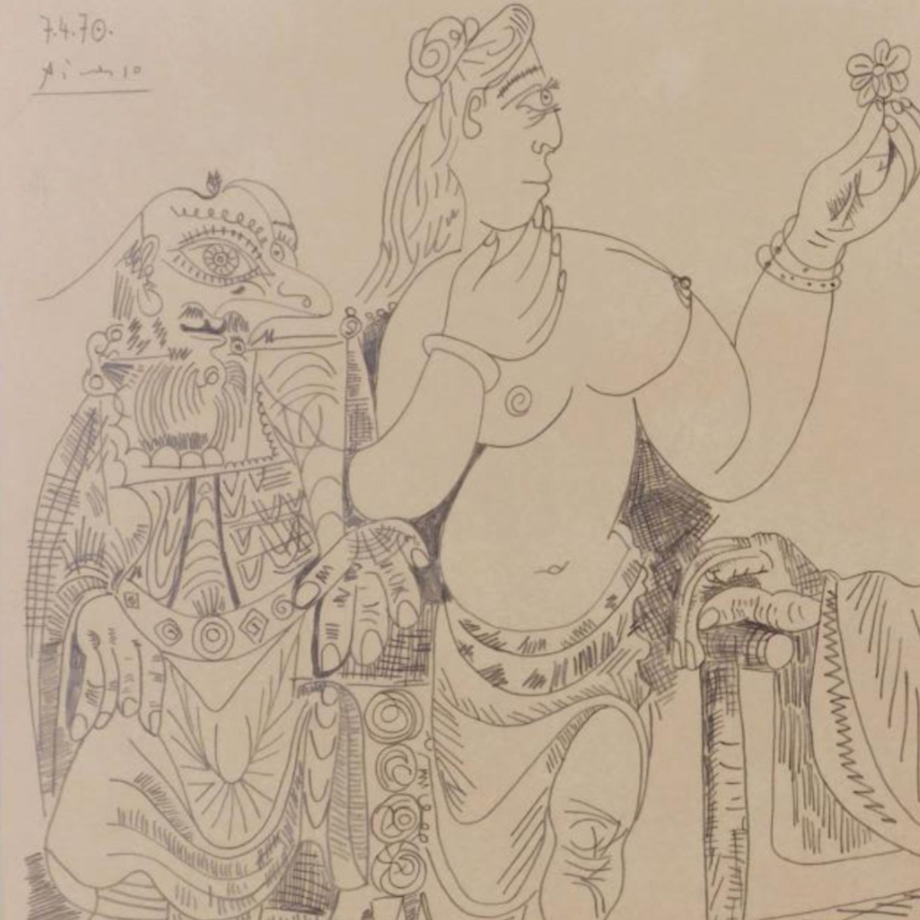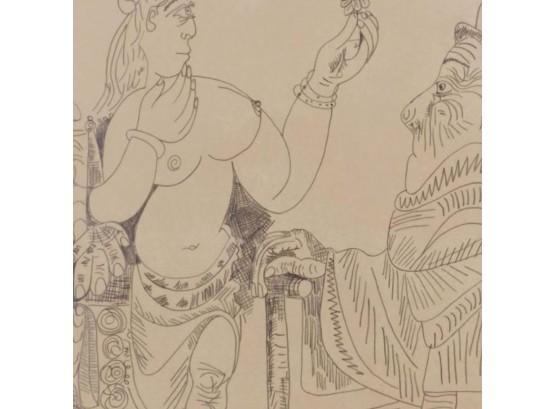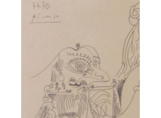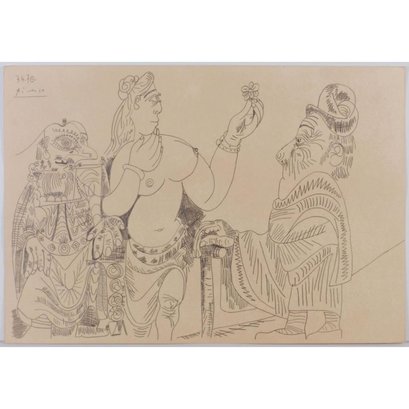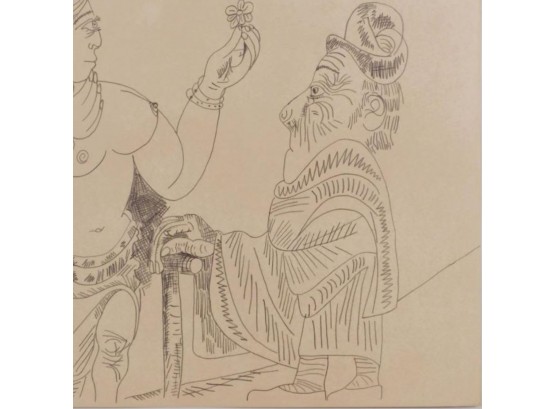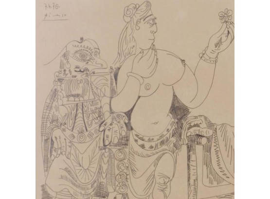 "Pablo Picasso (Spanish, 1881-1973) Manner of/ Attributed: Nu et Deux Hommes. Pencil on heavy paper, signed and date (7.4.70.) upper left, in pencil. Unframed. The drawing offered comprises part of the ""Pacific Palisades Collection""; so named for their Southern California location of acquisition from London, England based art dealer Bill Ferrari during the years spanning 2004-2008.