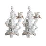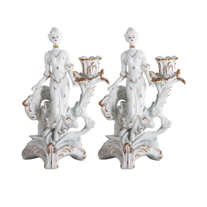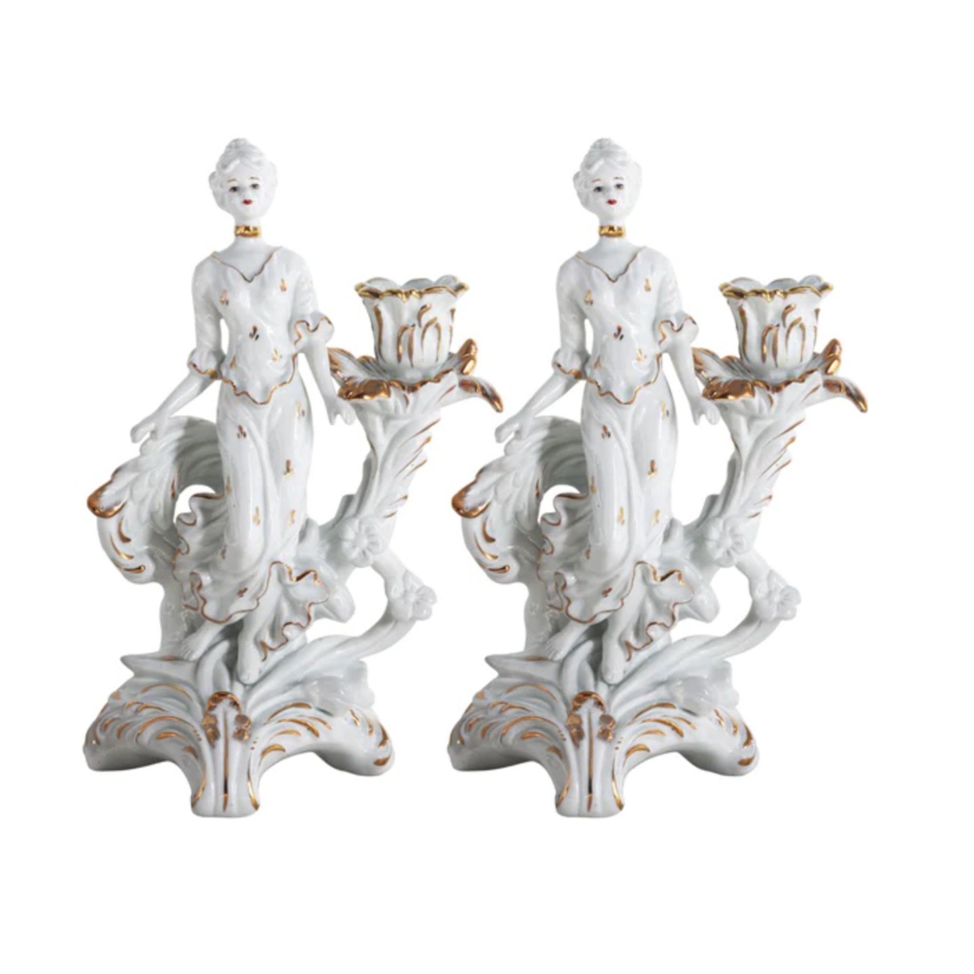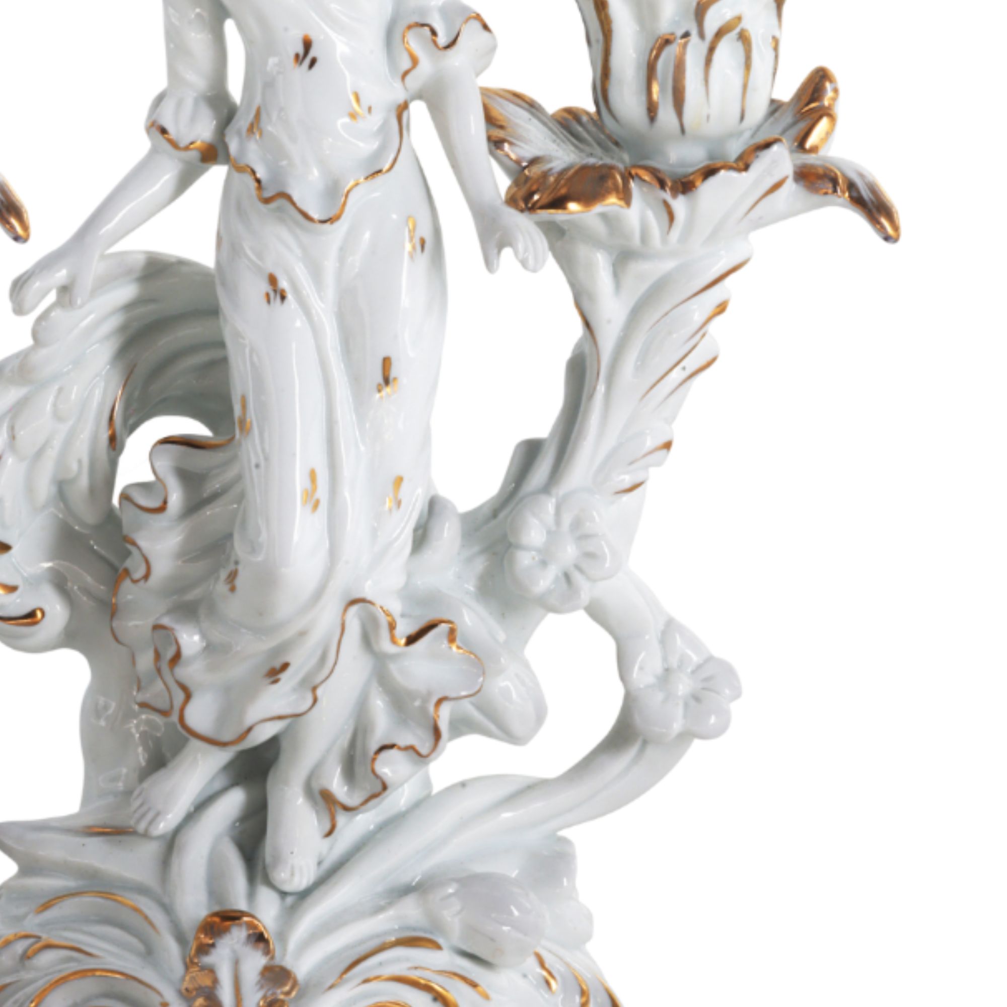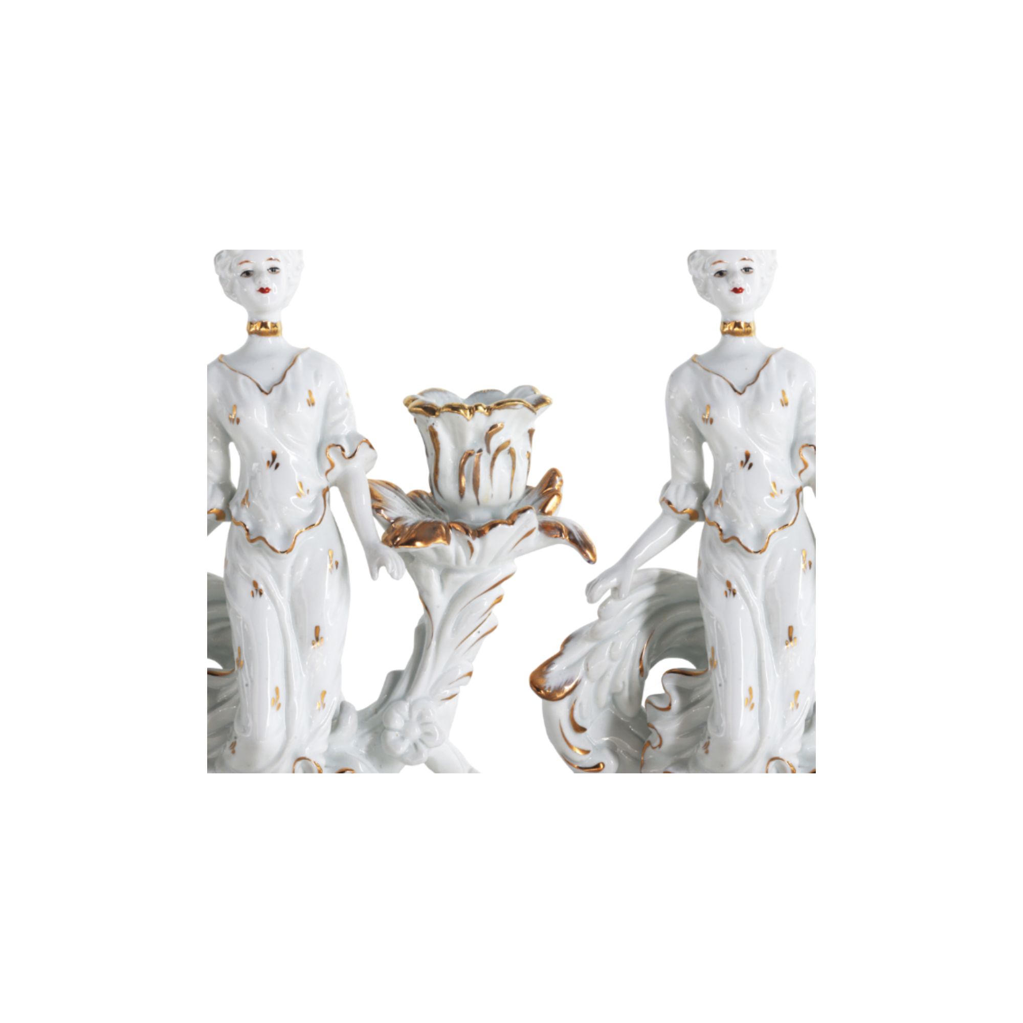 A pair of incredibly unique hand-painted porcelain candlestick holders. Both elegant and functional, this set will instantly set your table apart. Done in a classical Rococo style, each candlestick holder incorporates a female figure. The dreamy figures cast a beautiful, candlelit glow, creating a special atmosphere for romantic occasions. The perfect accompaniment to any high-end dining experience, this set is sure to become a beloved family heirloom.