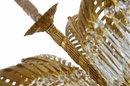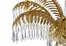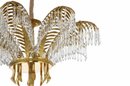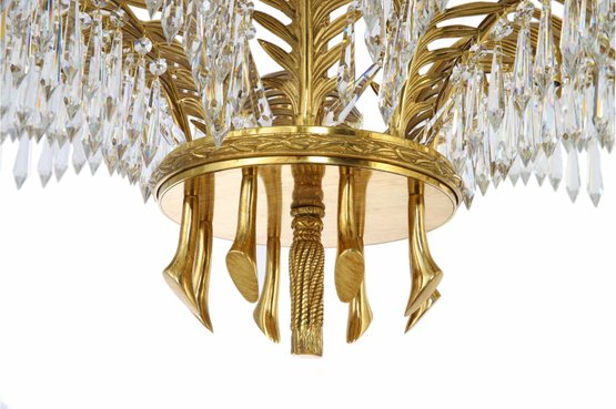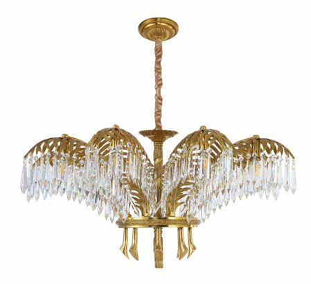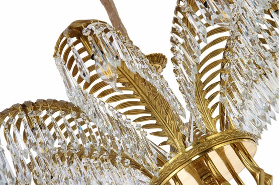 Behold a chandelier that encapsulates the very essence of quintessential Art Deco design, a seamless marriage of brass and crystal. The chandelier's arms, elegantly sculpted to mimic the grace of palm leaves, are adorned with cascading pendant crystals that capture and reflect the light in a mesmerizing dance. Its column, reminiscent of a timeless rope motif, exudes a sense of classic elegance, while the chandelier's crowning glory is an exquisitely ornate canopy.