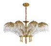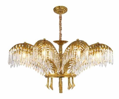 The pendant crystals that grace the chandelier's palm leaf arms infuse an ethereal quality, casting a shimmering radiance that transforms any space into a realm of enchantment. The rope-inspired column, reminiscent of the classical design, adds a touch of nostalgia, grounding the piece in a sense of enduring tradition.