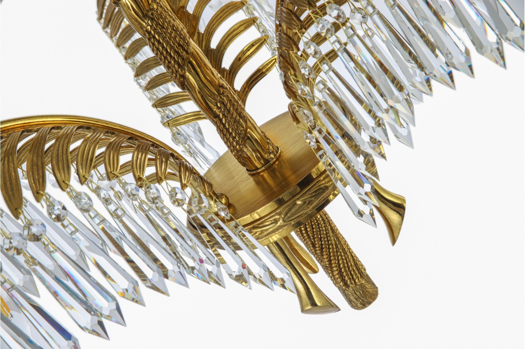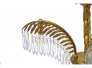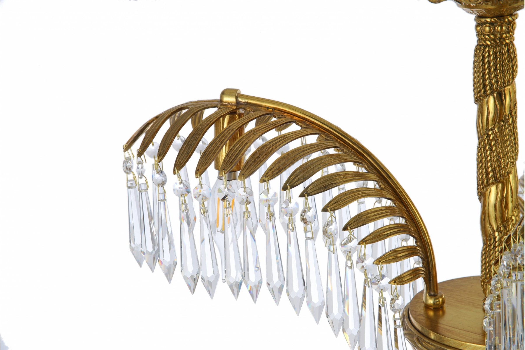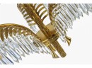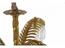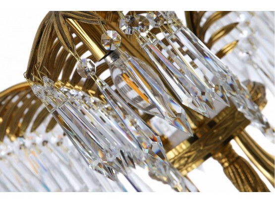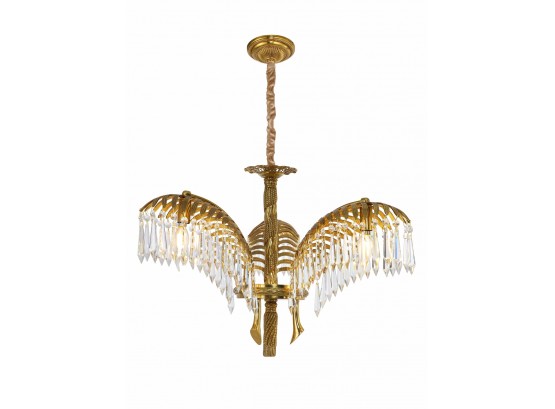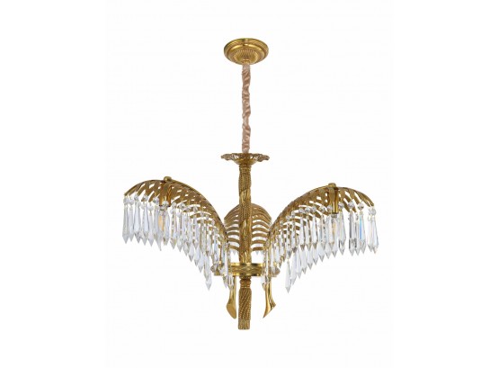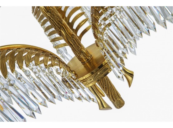 This chandelier is crafted in a quintessential art deco style incorporating brass and crystal. The arms of the chandelier are modeled after palm leaves and has hanging pendant crystals adorning them. The chandeliers column is reminiscent of a classic rope design and sits underneath a highly ornate canopy.