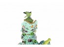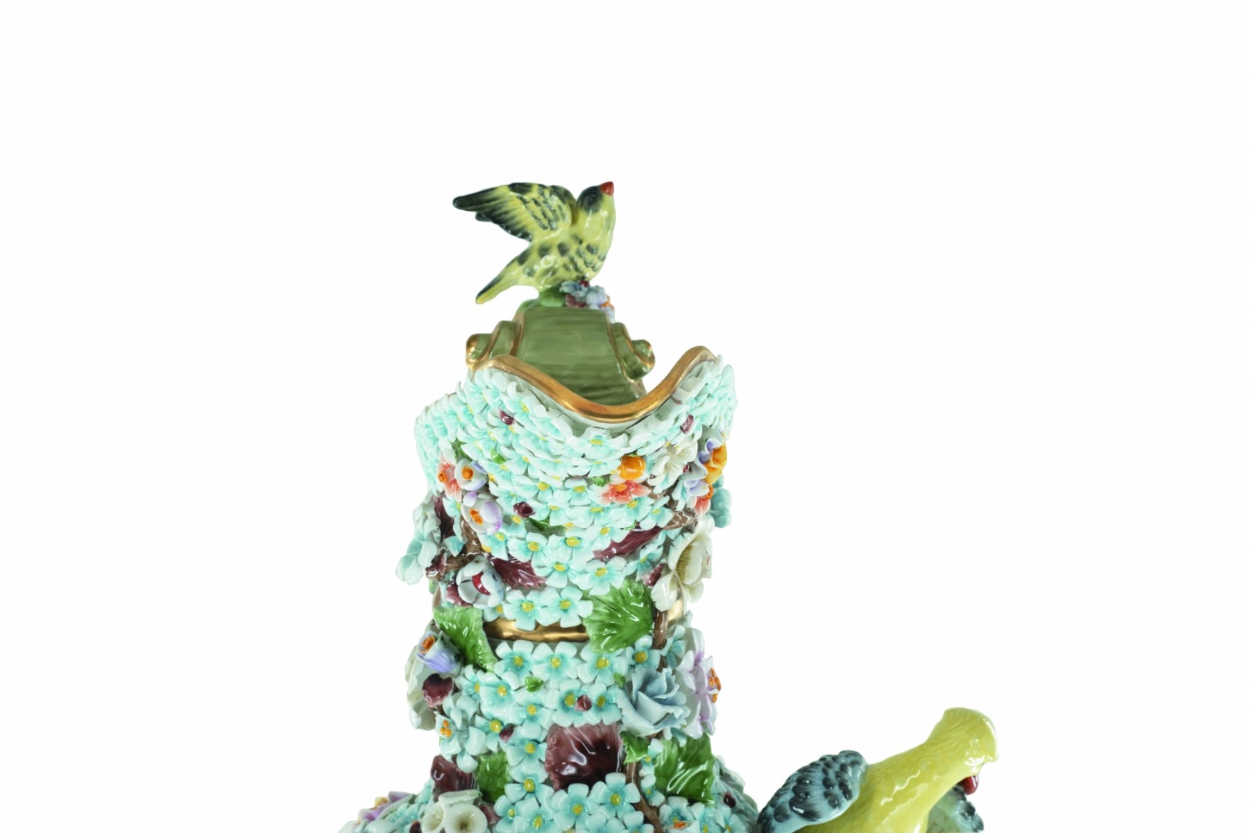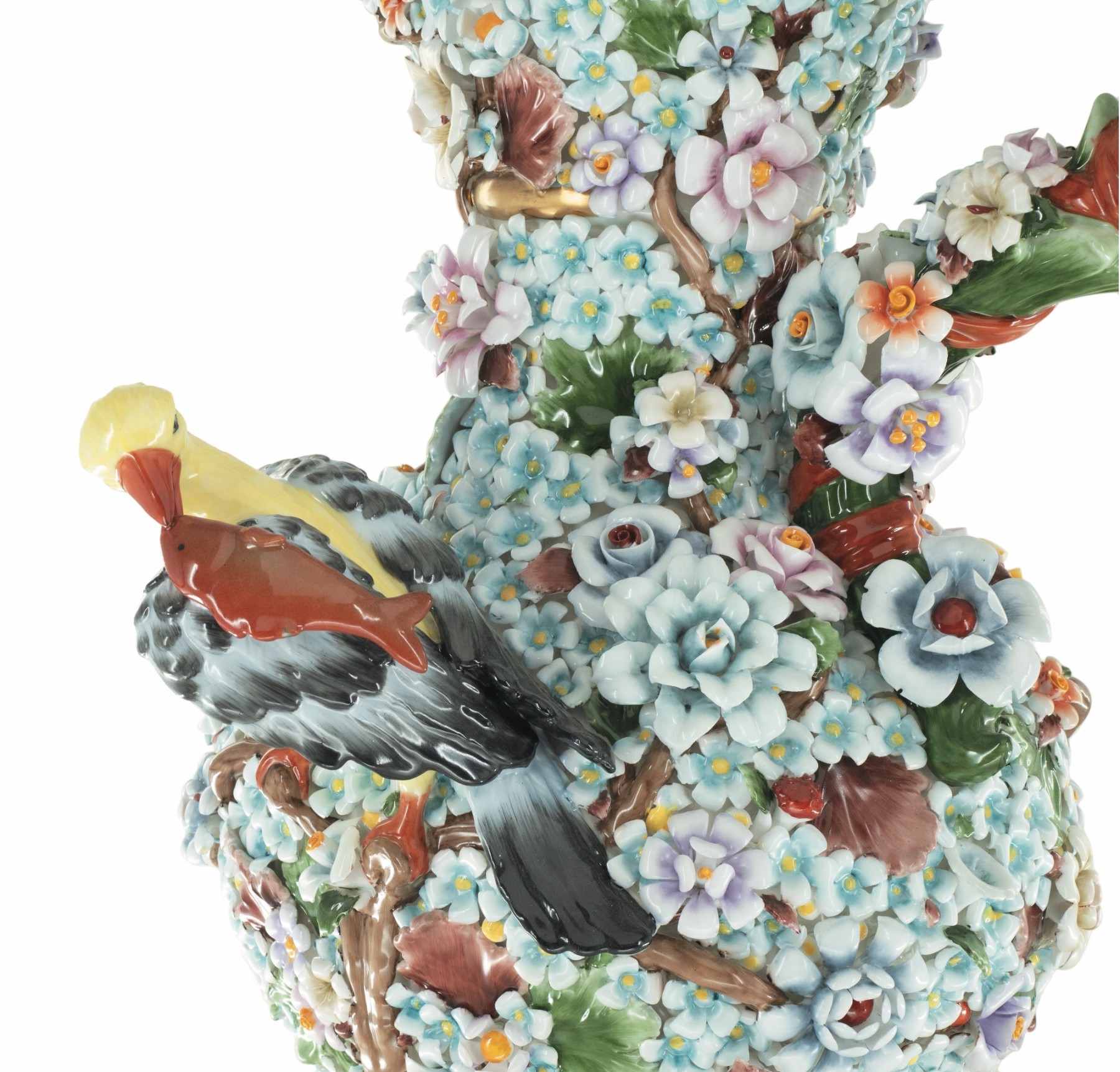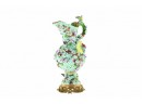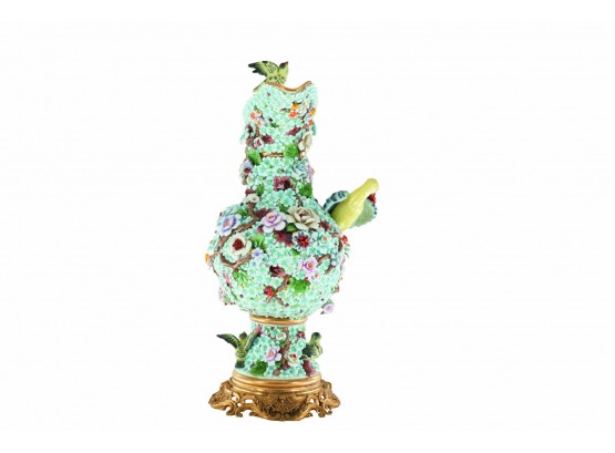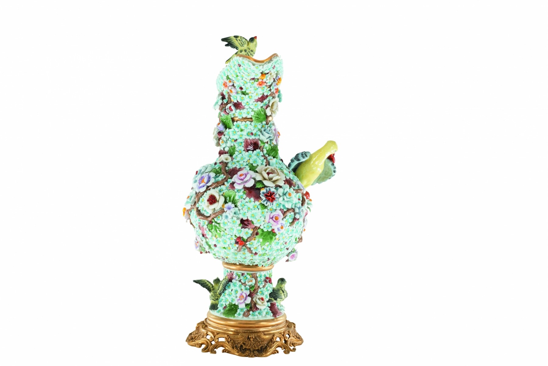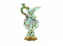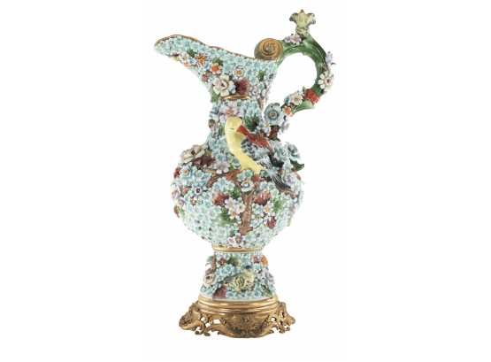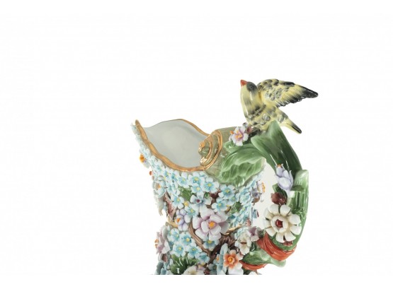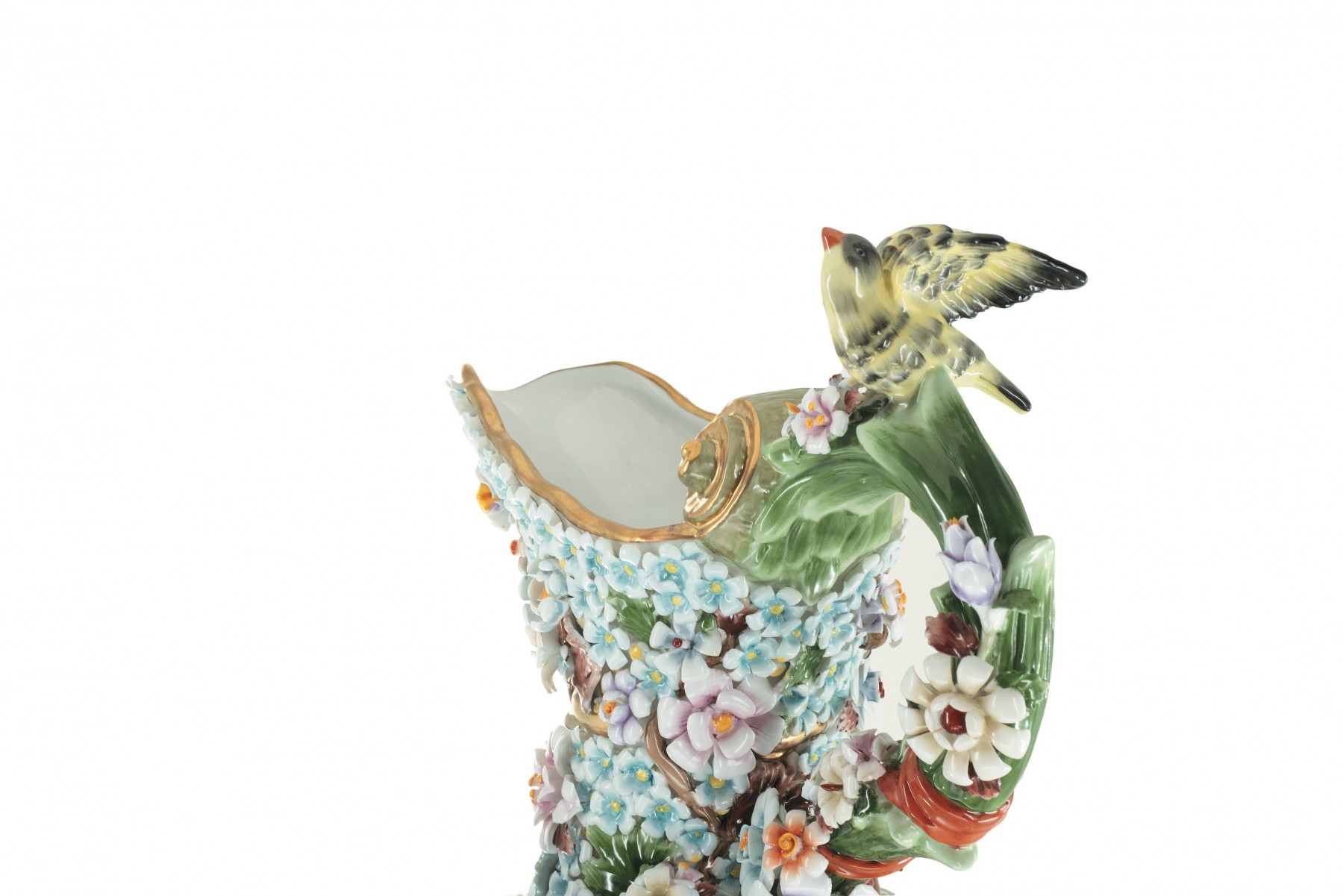 The pitcher depicts a captivating scene of a bird holding a fish in its mouth, exuding a sense of movement and dynamism. Crafted with meticulous attention to detail, it is adorned with delicate porcelain flowers throughout its surface, creating a tapestry of beauty and intricacy. Each flower is meticulously hand-painted, showcasing the skill and artistry of 20th-century craftsmanship.