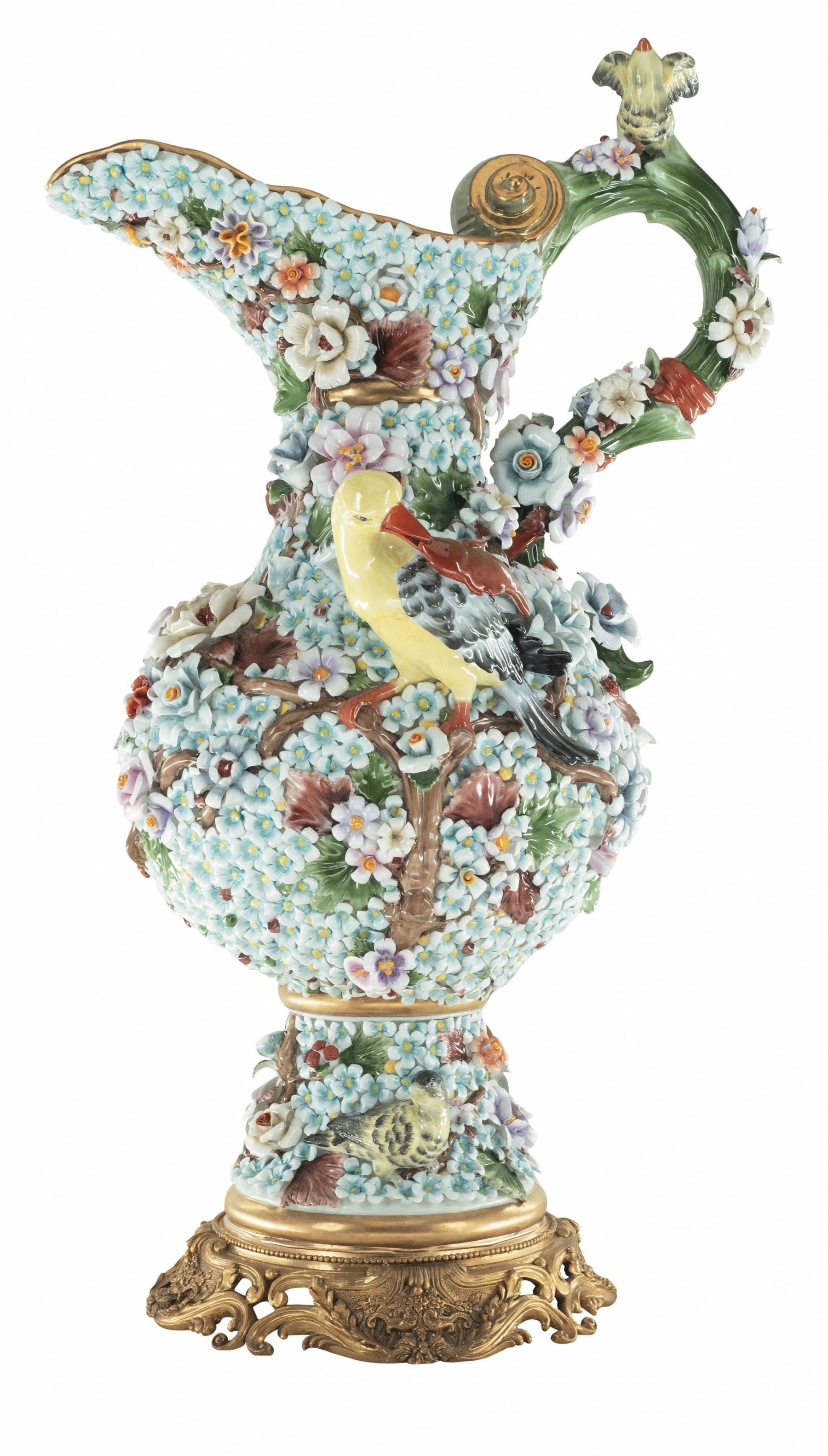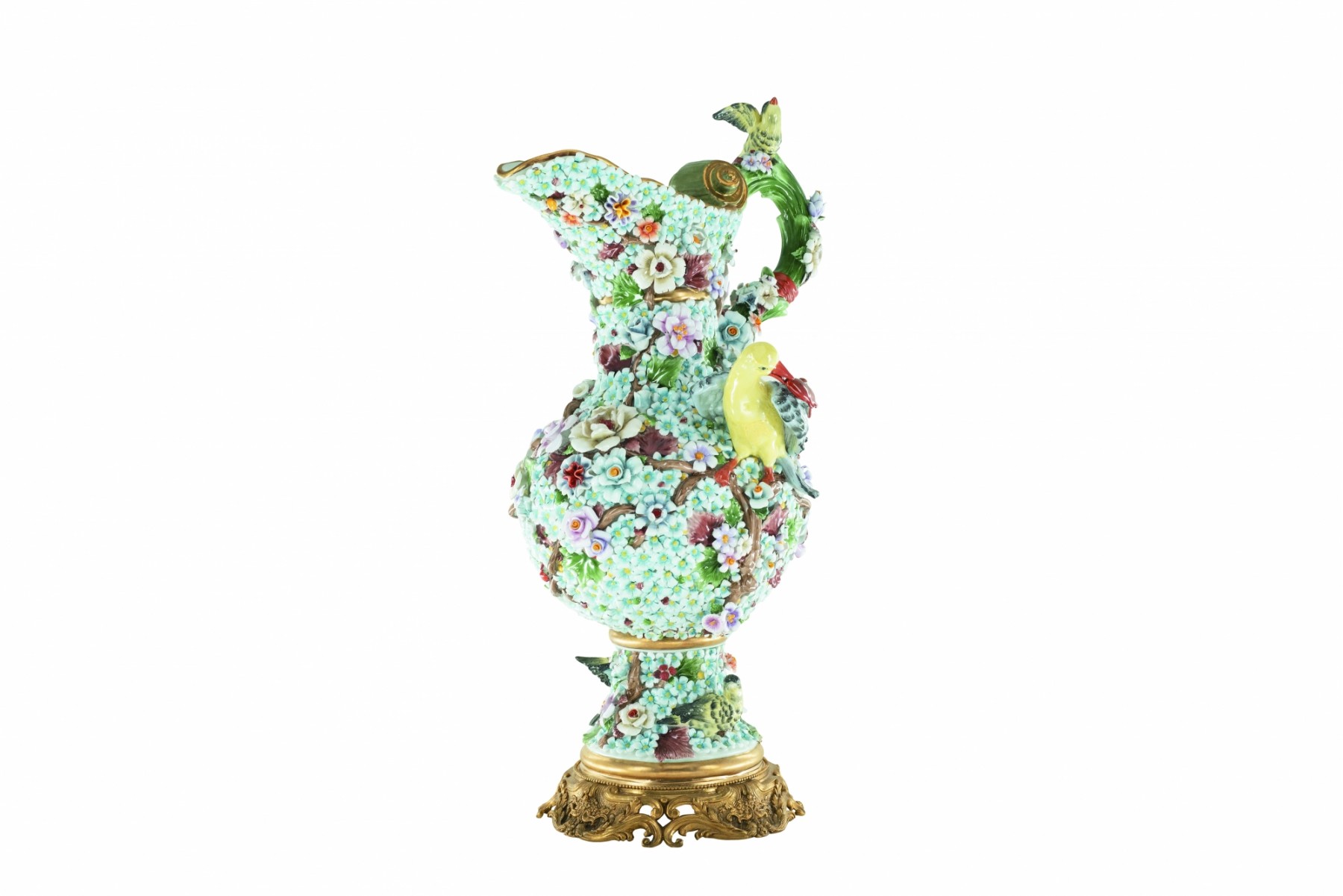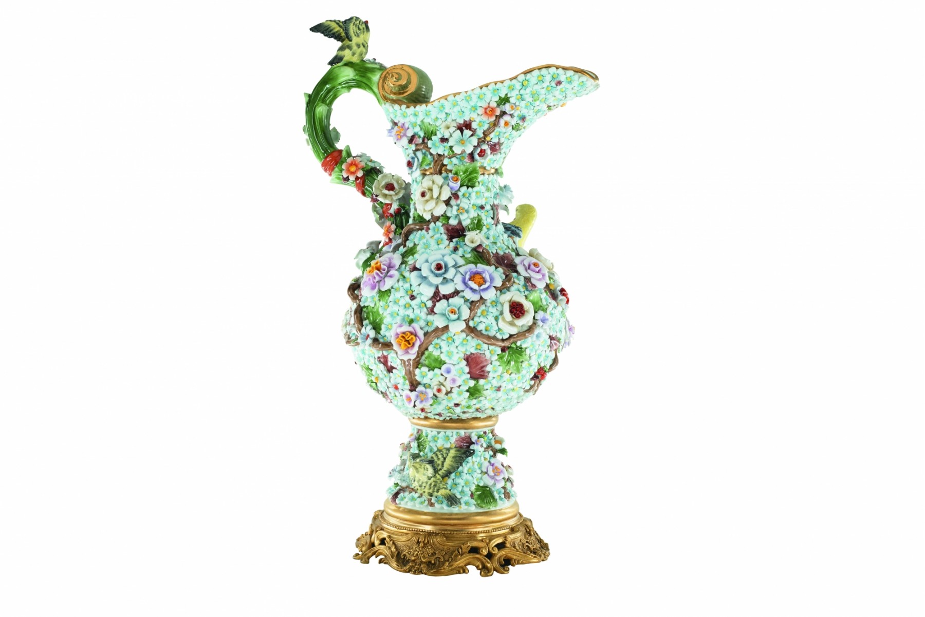 The combination of porcelain and bronze materials adds to the allure of this pitcher. The porcelain flowers delicately decorate the surface, while the bronze base provides stability and a touch of sophistication. This harmonious fusion of materials perfectly captures the essence of the Rococo style, evoking a sense of luxury and refinement.