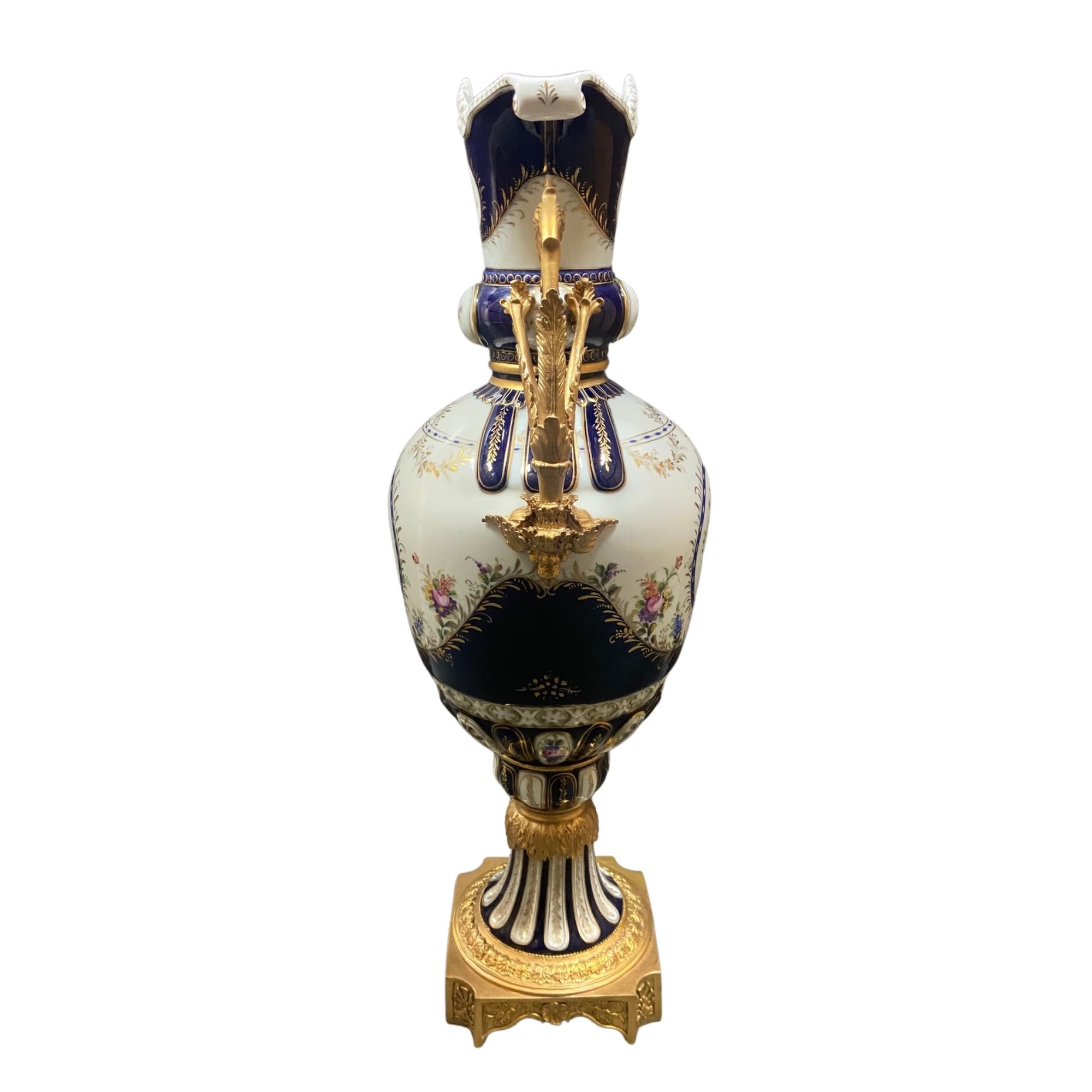 Journey through time with this Rococo-styled vase, a paragon of meticulous craftsmanship and artistry. Its poised presence on an ornate bronze base echoes the grandeur of an era where every detail was a labor of love, every brushstroke a whisper of passion.