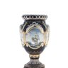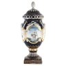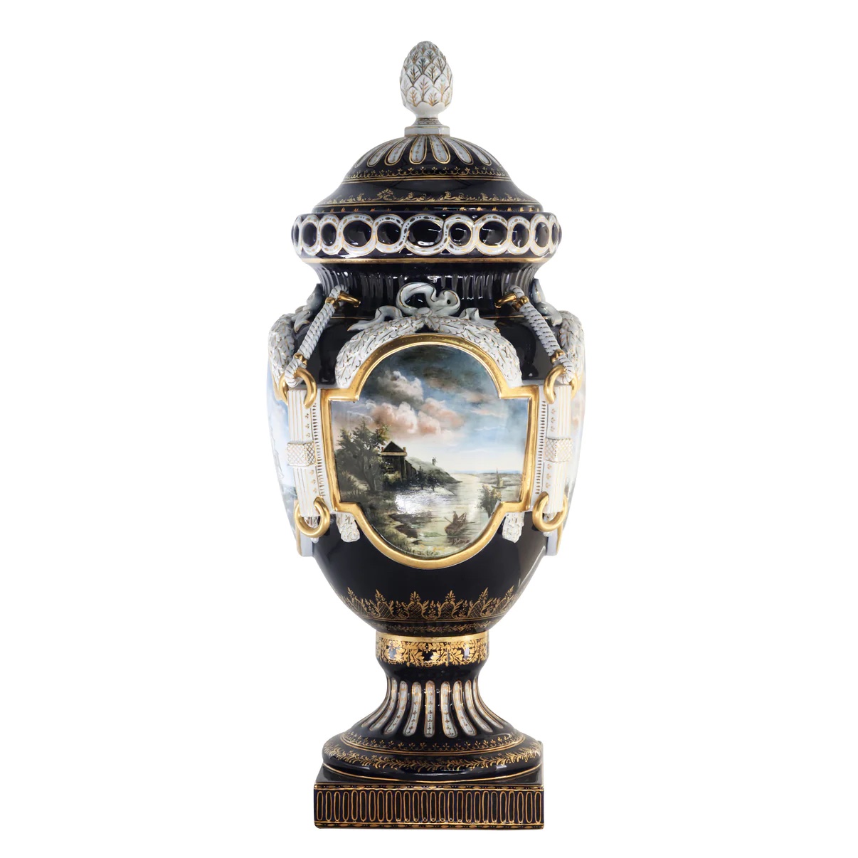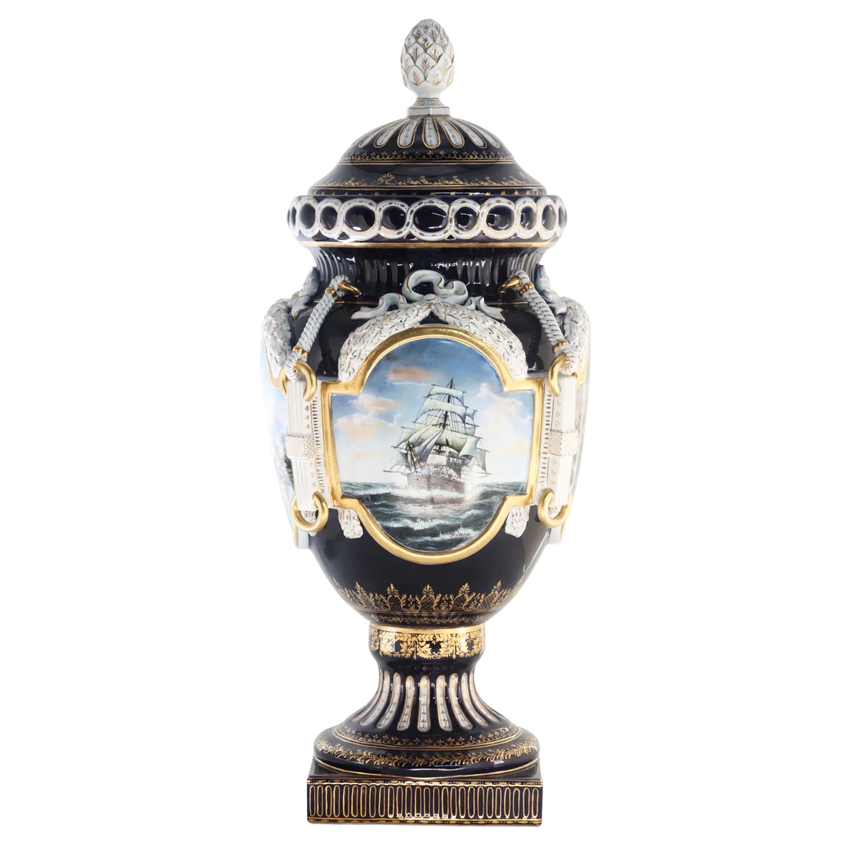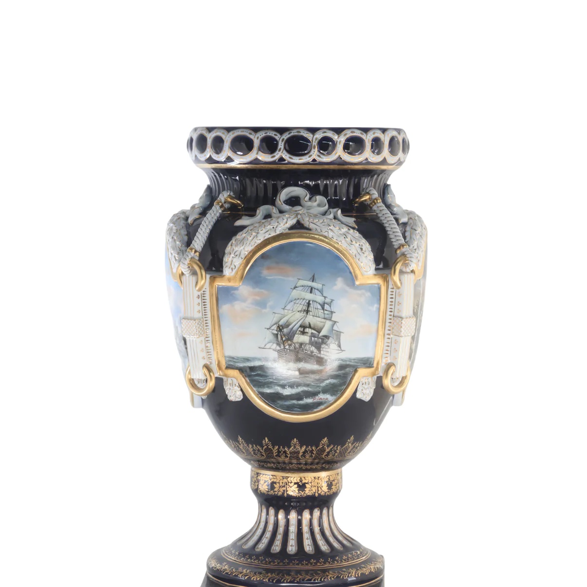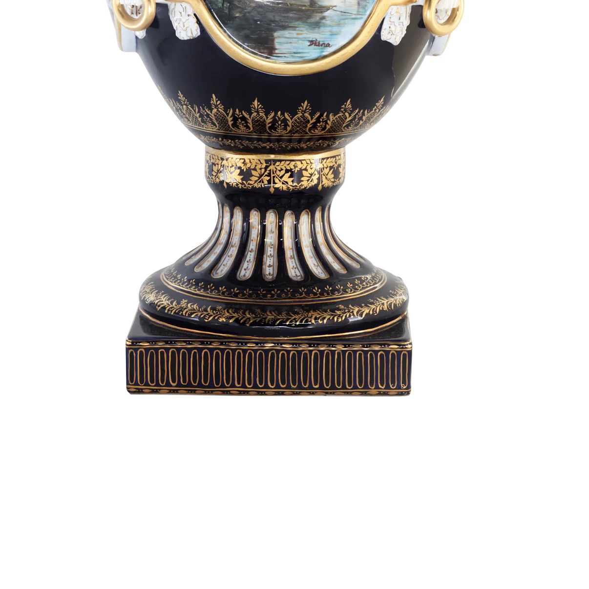 Up for auction is an exceptional porcelain vase. The vase’s body sits on top of a flared stem, and a square base. This piece is highlighted by the incredibly detailed ring handles. The dark color of the vase is striking and sophisticated, creating a vivid backdrop for the piece’s hand painted motif. Depicting a classical Rococo scene, this vase shows nautical landscapes, executed in shades of blue, and green. It’s completely painted by hand and composed of porcelain. The vase has never been used and measures 32 inches in height.