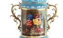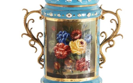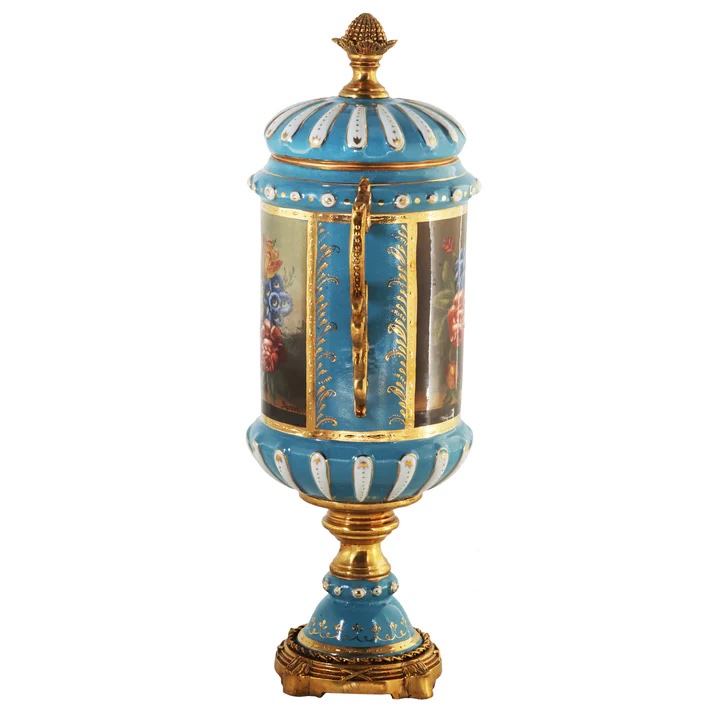 Introducing the Hand-Painted Baroque Floral Motif Jar in Blue, the jar sits gracefully atop an ornate bronze flared stem, accentuated by a circular base, ensuring stability and visual appeal. What truly sets incredibly detailed bronze branch handles, adding an air of classical elegance to each piece.