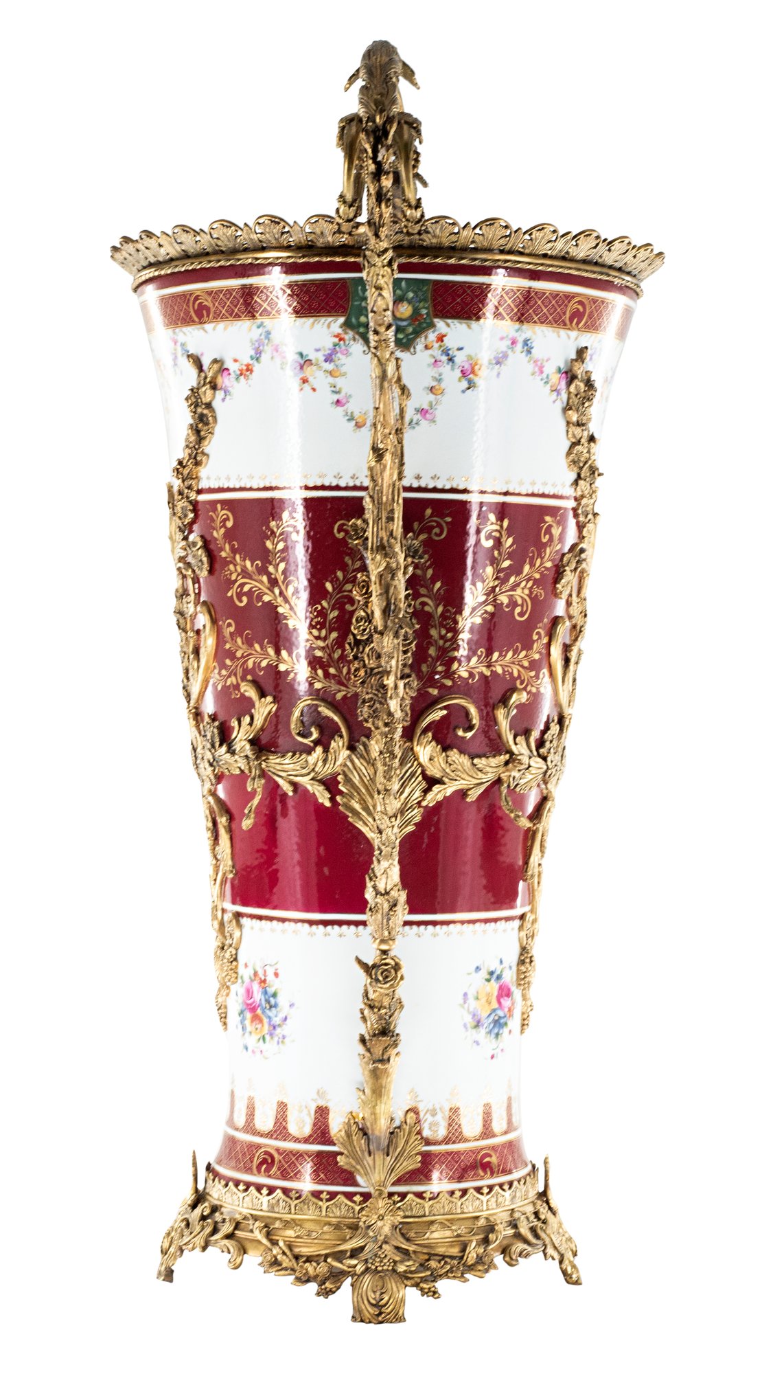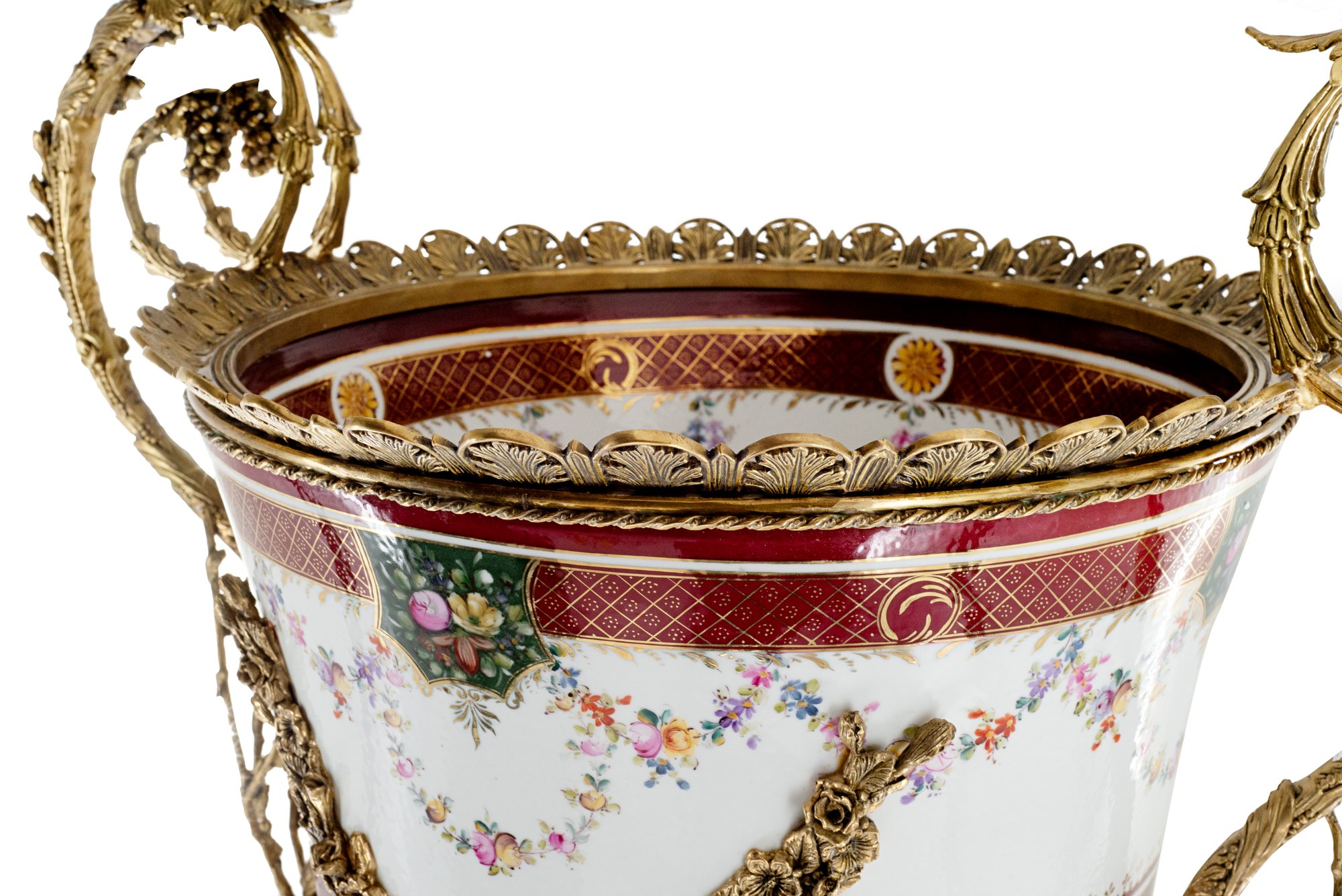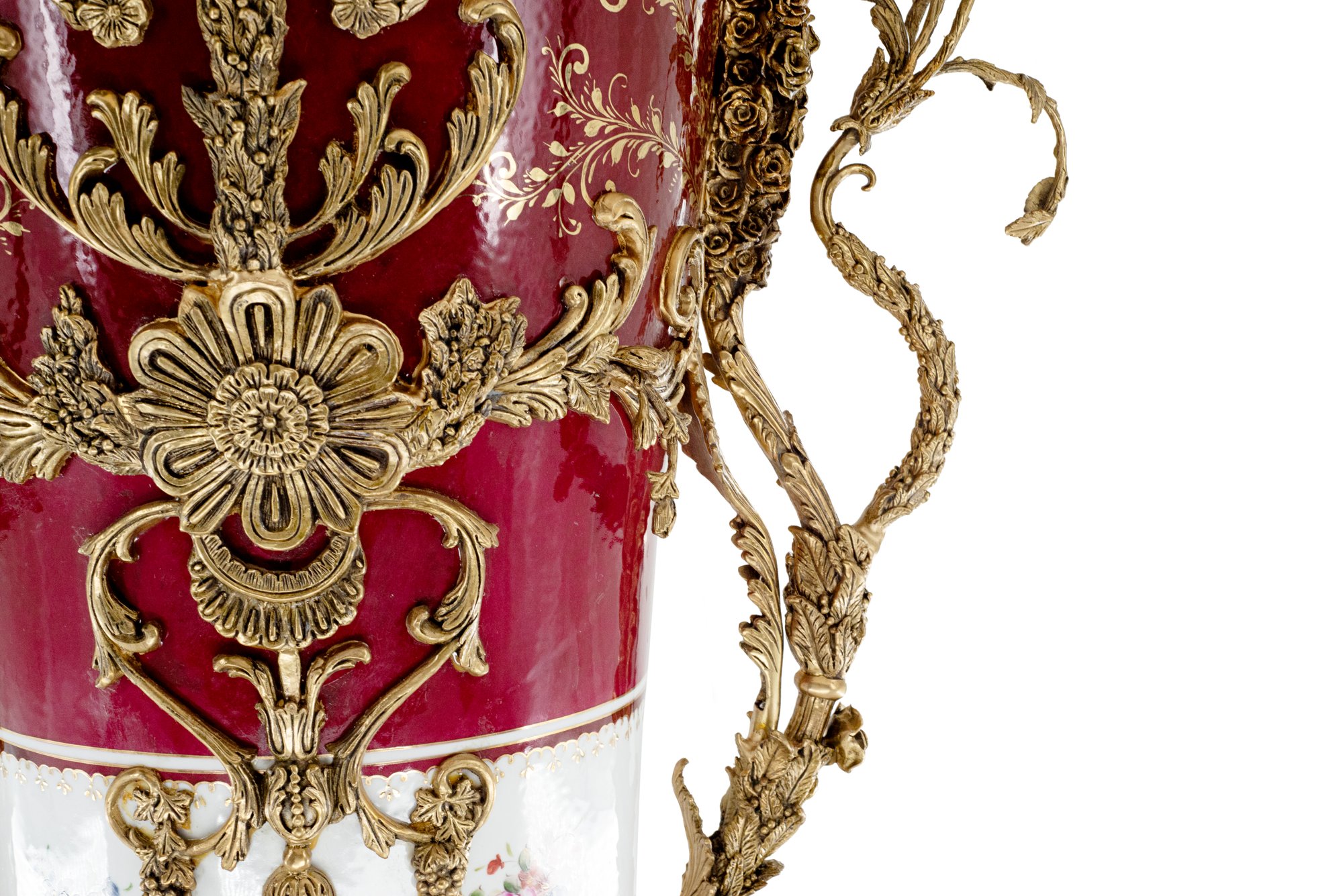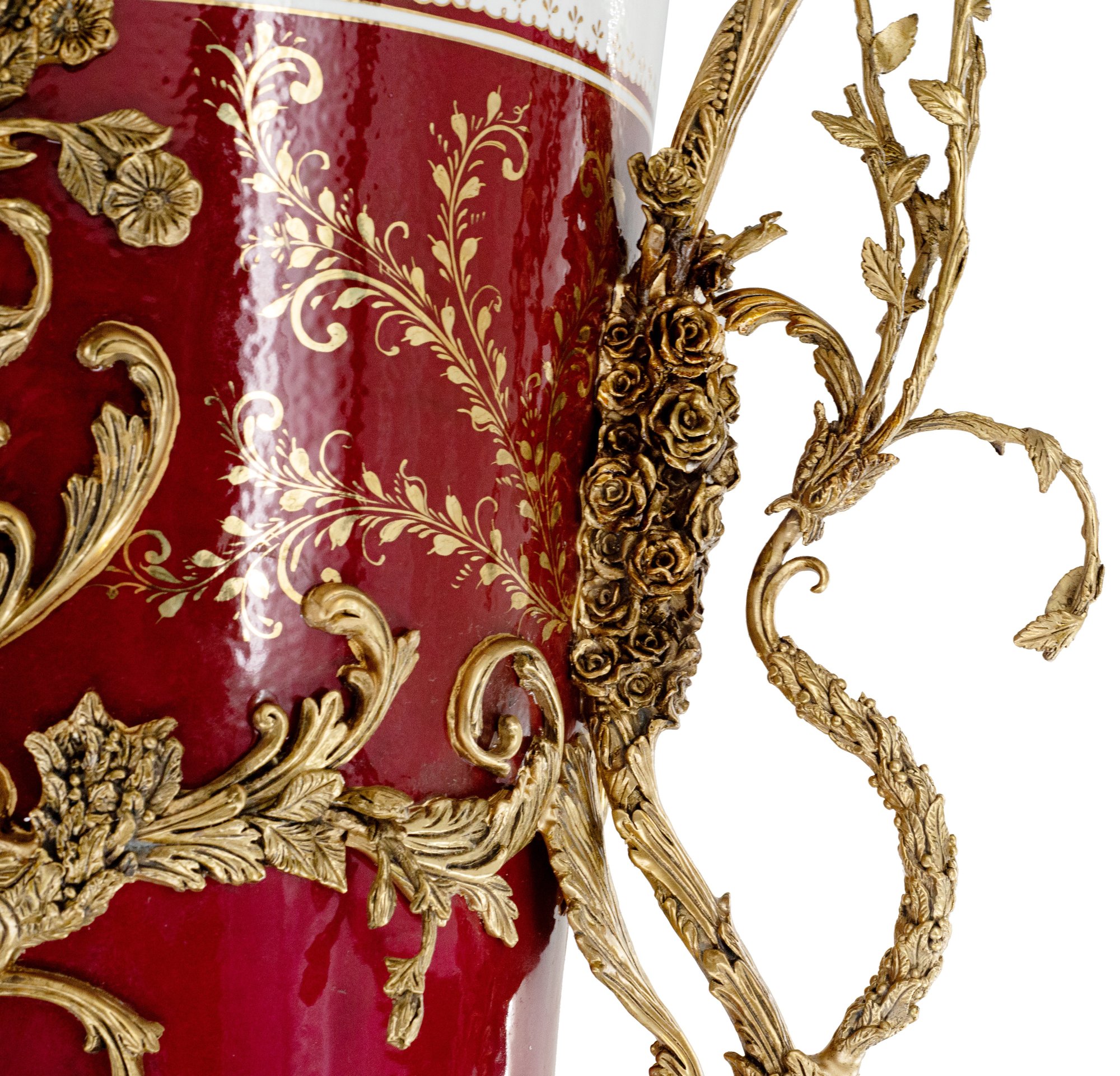 Introducing a breathtaking large vase that seamlessly blends artistry and elegance. Crafted from the finest porcelain, this vase stands as a testament to meticulous craftsmanship, adorned with intricate bronze elements that add a touch of sophistication.
