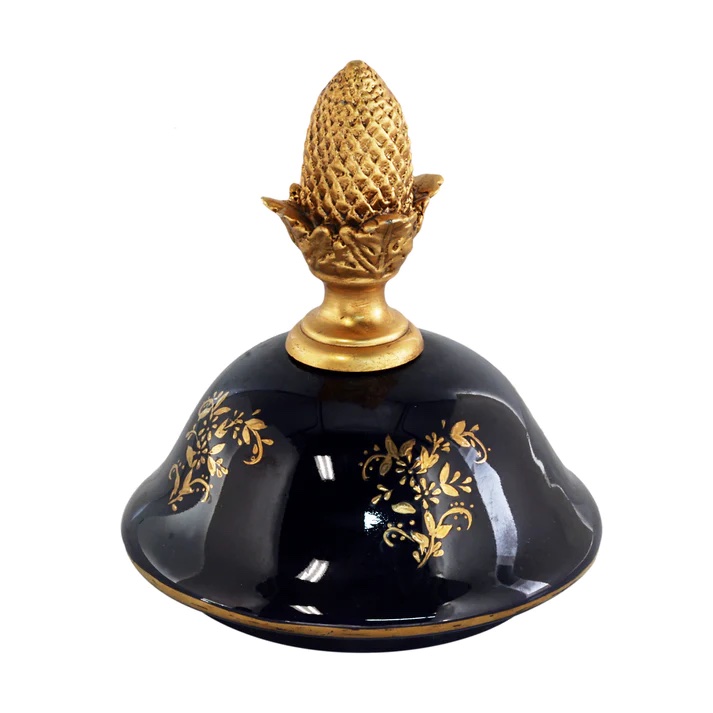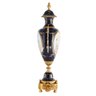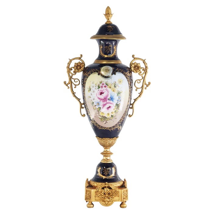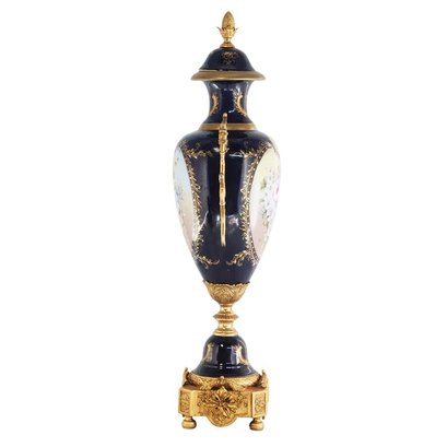 An exceptional porcelain covered jar. The jar's body sits on top of an ornate bronze flared stem, and a square base. This piece is highlighted by the incredibly detailed bronze floral handles. The dark blue color of the vase is striking and sophisticated, creating a vivid backdrop for the piece’s hand-painted Rococo style motif.