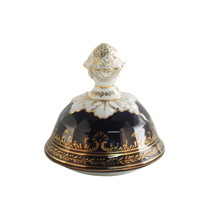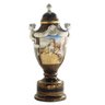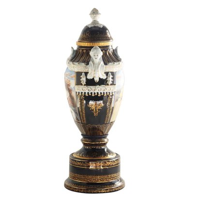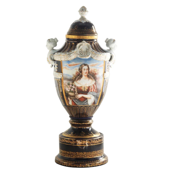 The dark blue color of the vase is nothing short of striking and sophisticated. It creates a vivid backdrop for the hand-painted motifs that adorn its surface. Each side of the vase depicts classical Rococo scenes, where society scenes harmoniously coexist with the beauty of nature. Executed in shades of red, blue, and yellow, these scenes come to life through meticulous hand-painting.