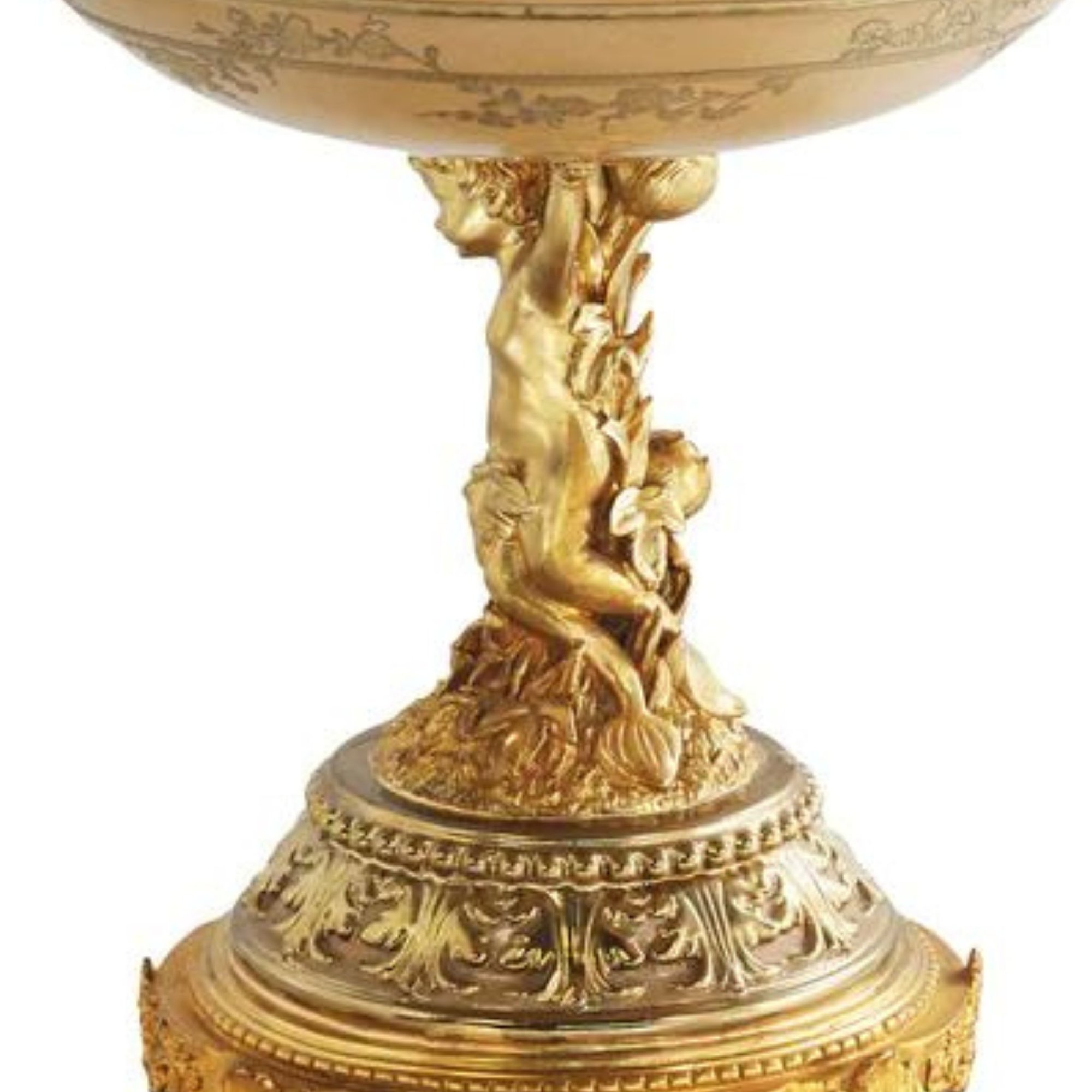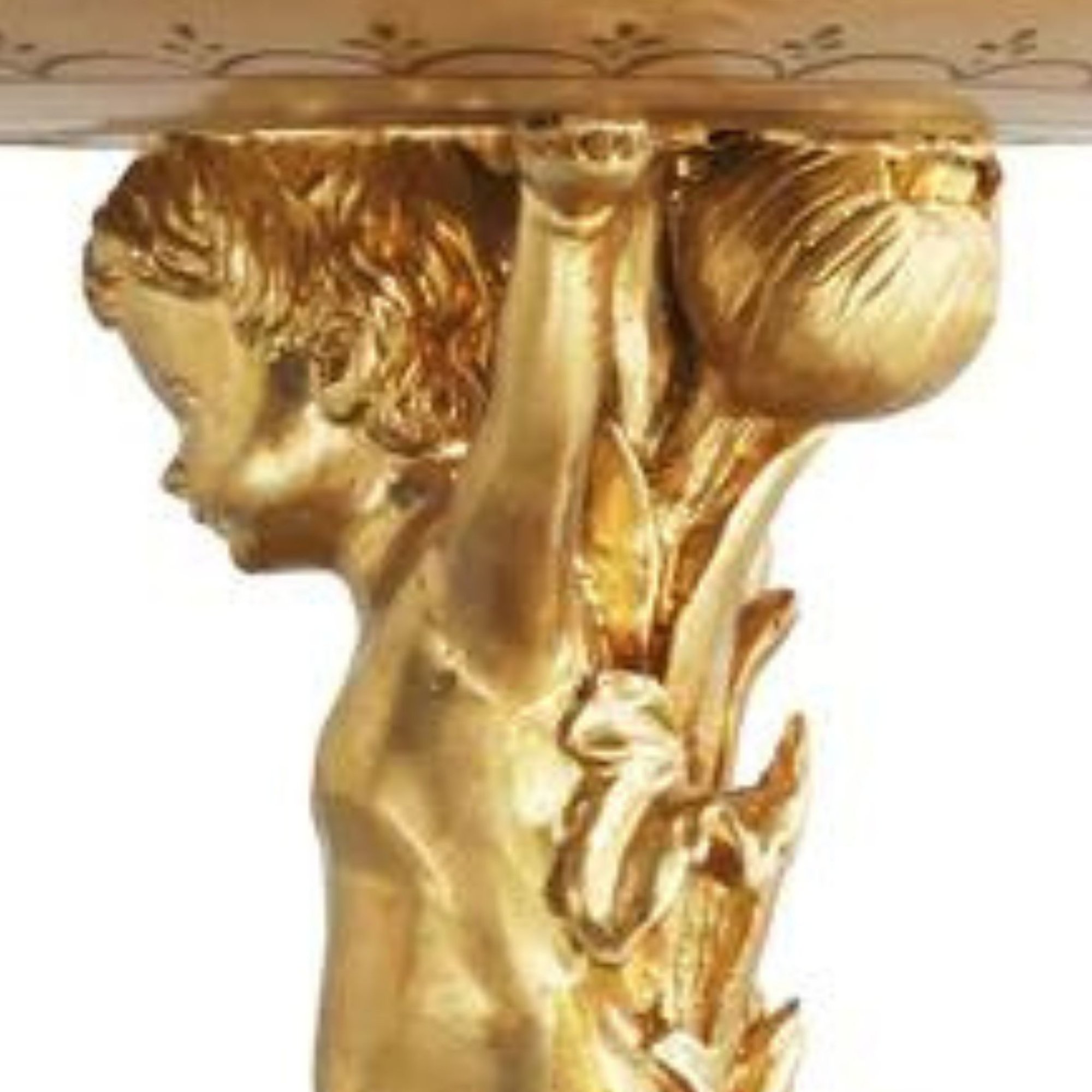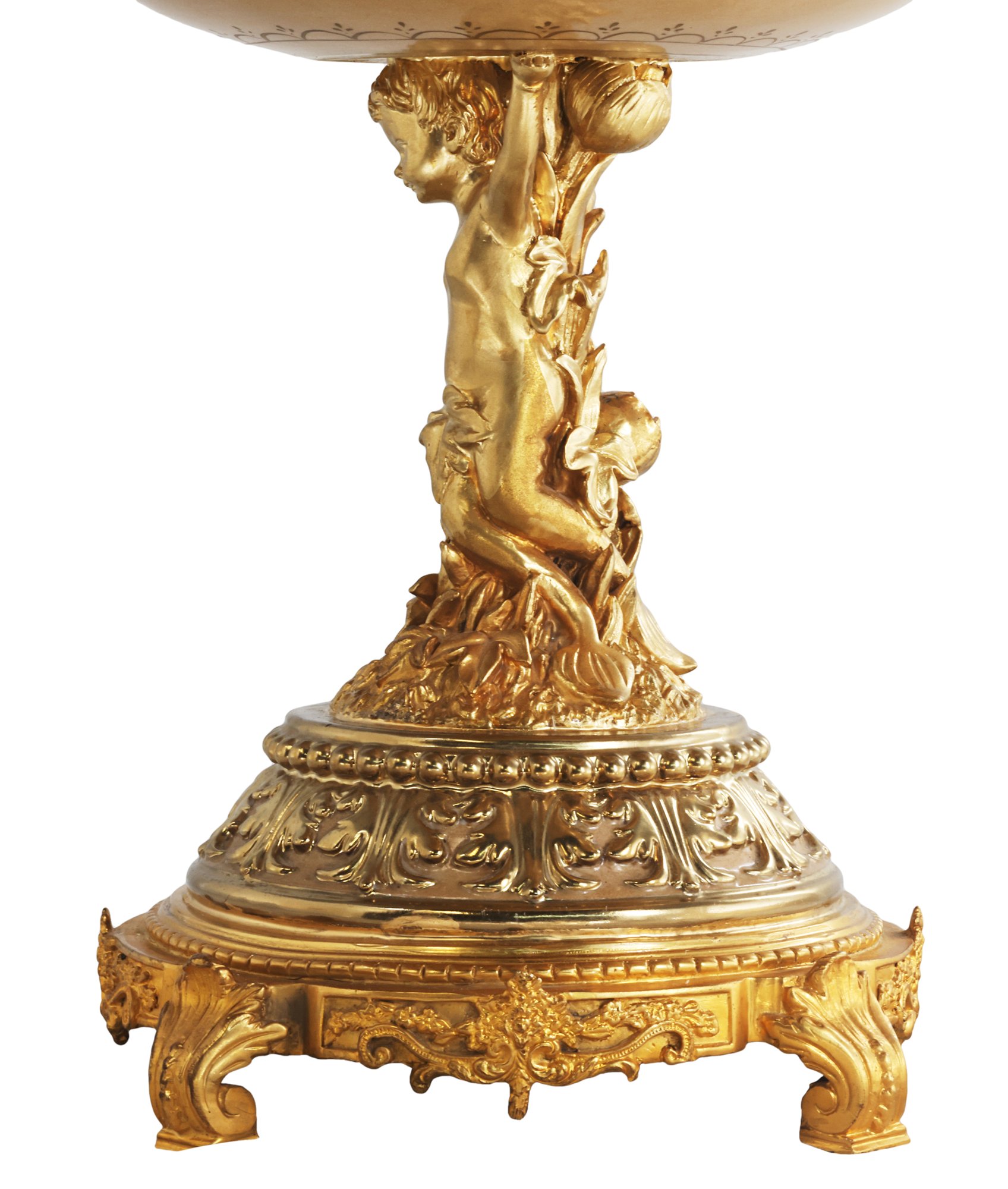 The cherub stem connects to a bronze vase adorned with scroll legs, adding a touch of whimsy and sophistication to the design. The natural elements on the base tie in seamlessly with the piece's floral motif, creating a harmonious blend that resonates with both traditional and contemporary aesthetics.
