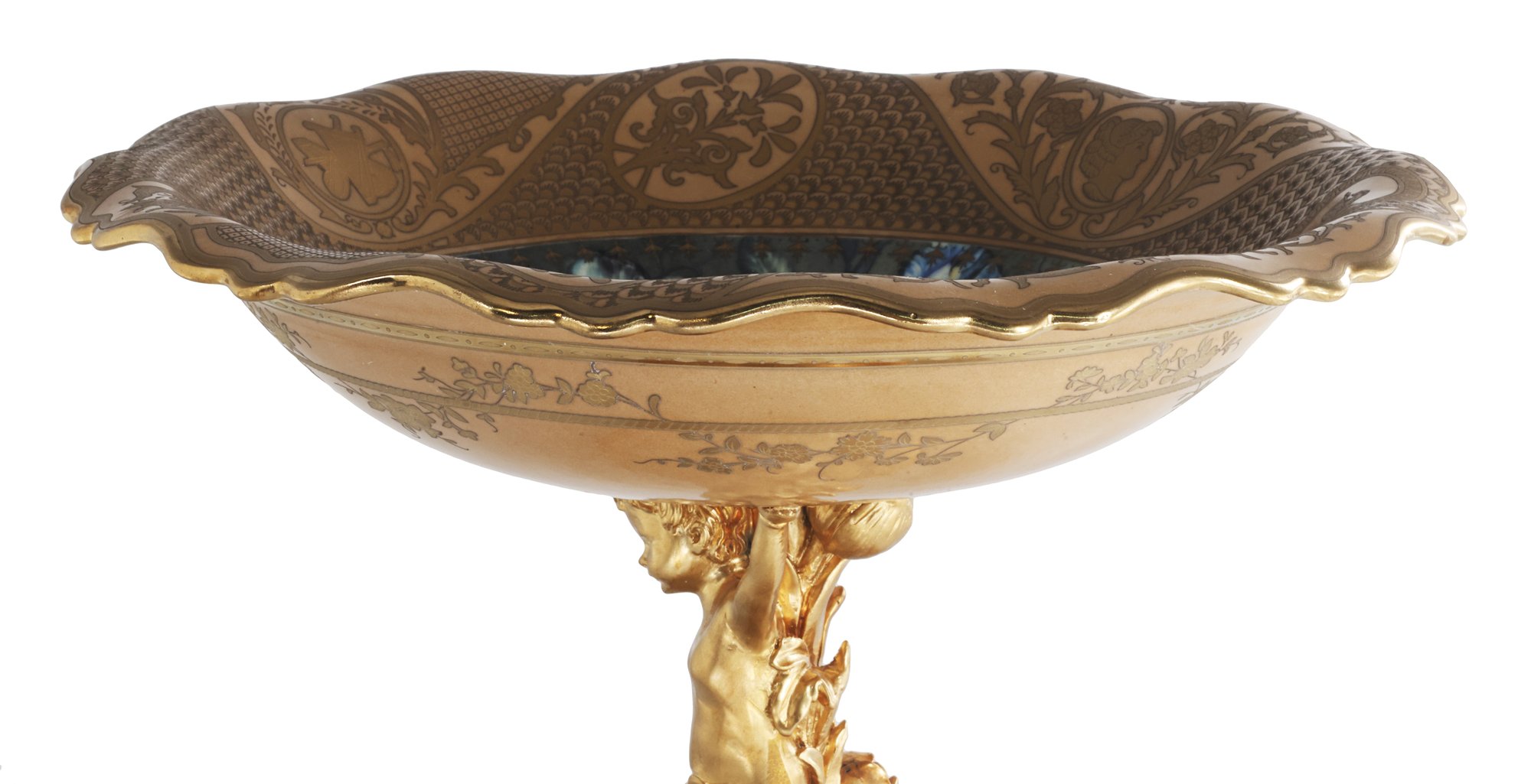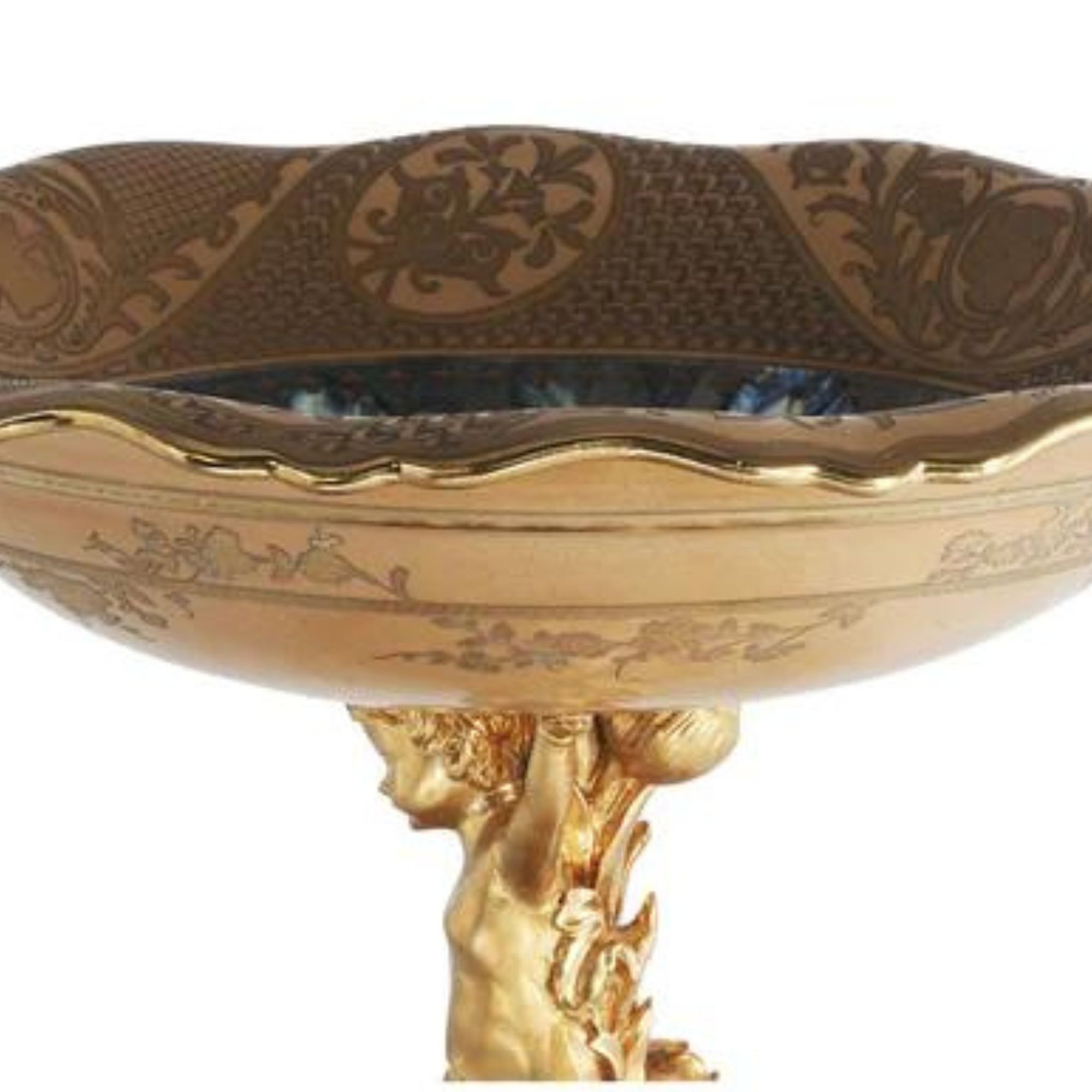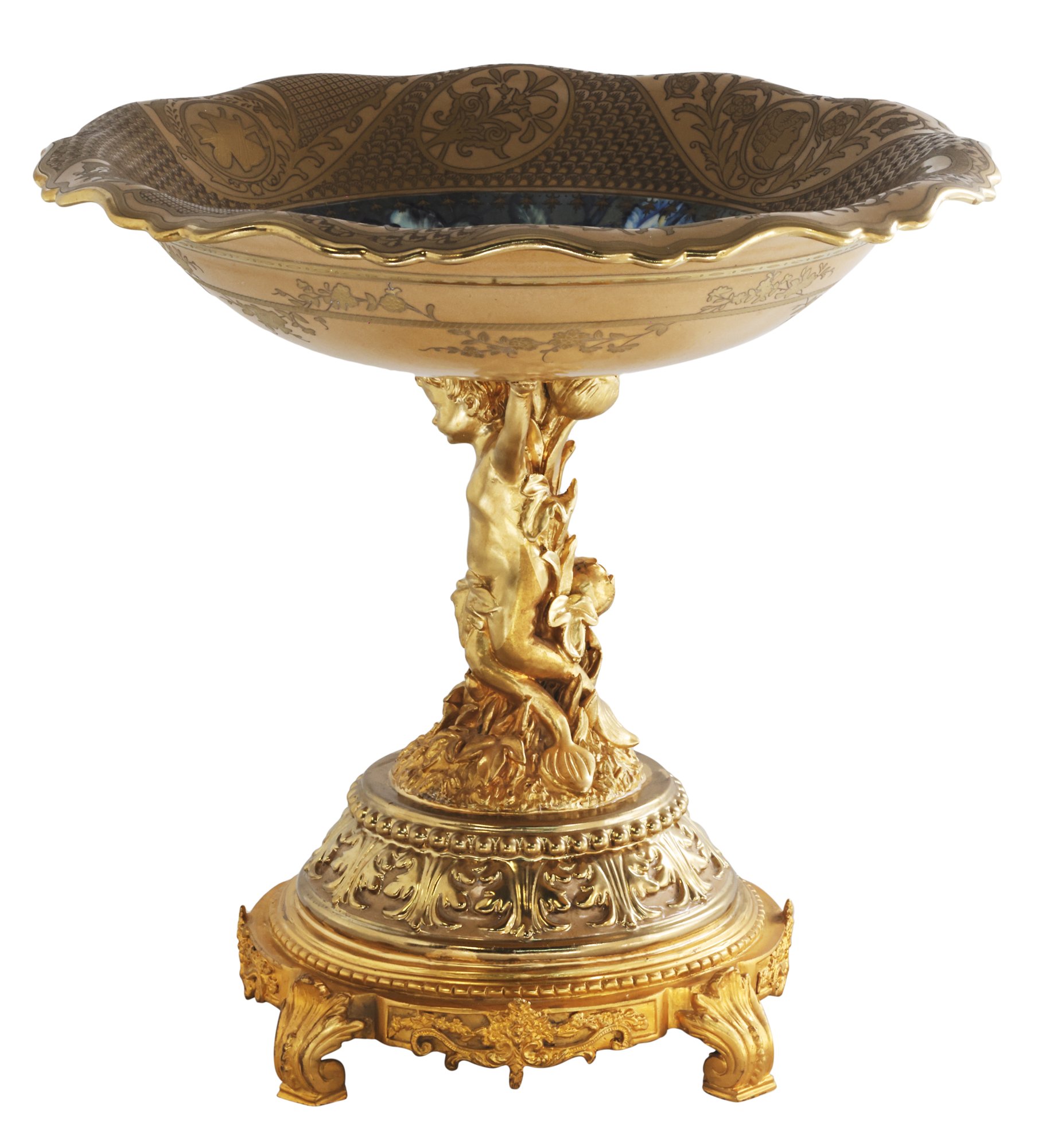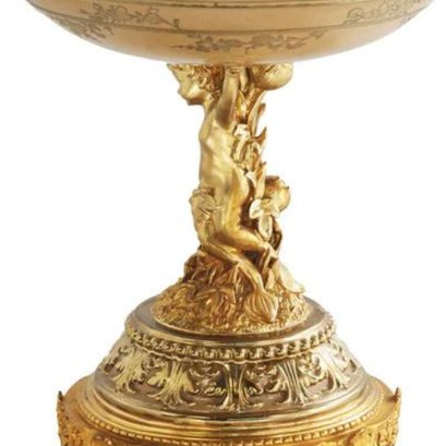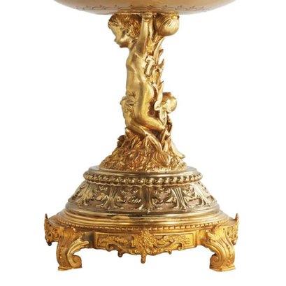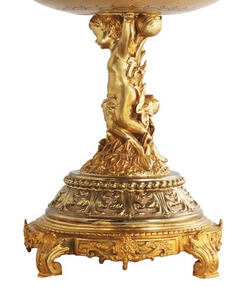 Introducing a breathtaking hand-painted porcelain bowl, held aloft by an incredibly detailed bronze cherub stem. This exquisite piece is more than just a decorative item; it's a work of art that embodies timeless romance and elegance.