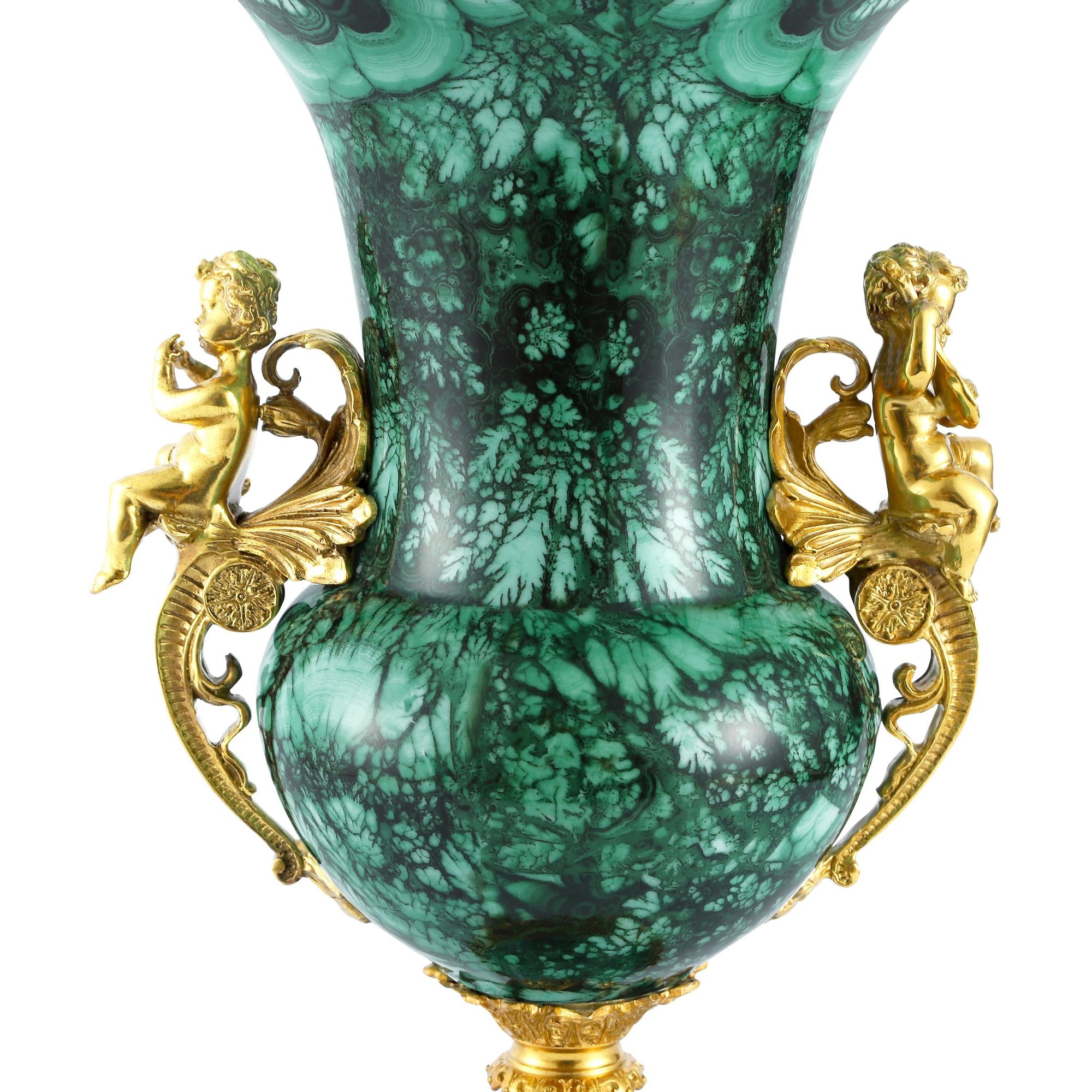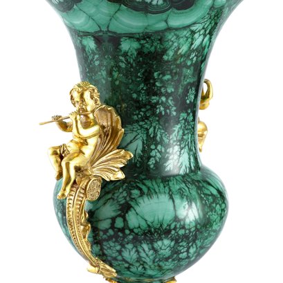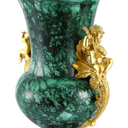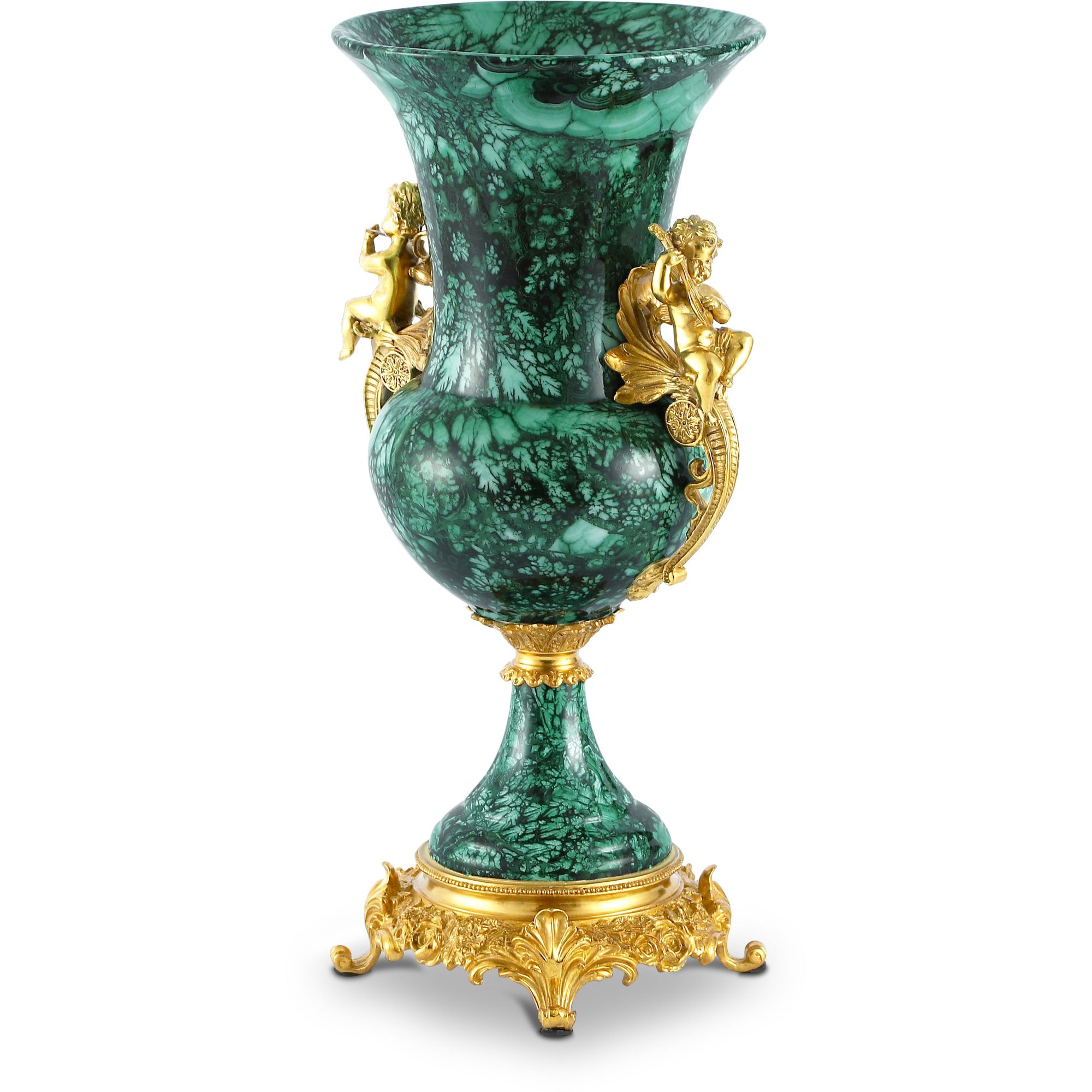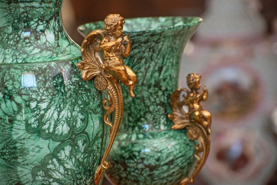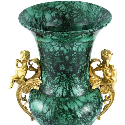 This classic green vase stands as a centerpiece of beauty and refinement. Its meticulously detailed circular base, supported by ornate legs, gives it a regal and dignified aura. The flared stem adds a touch of grandeur, while natural elements adorning the handles bring an organic and harmonious aspect to the overall design. These natural elements serve as a reminder of the eternal connection between art and nature.