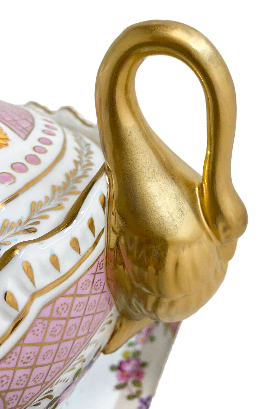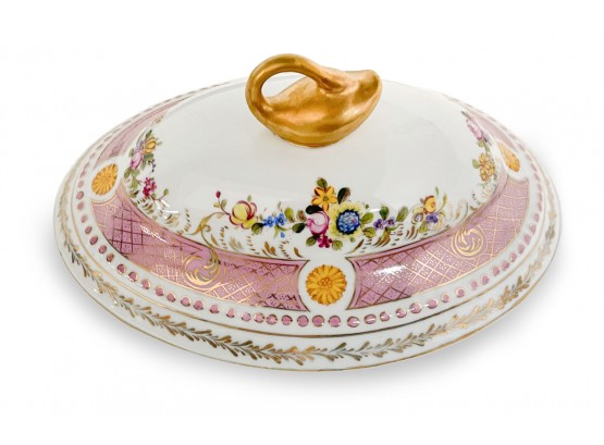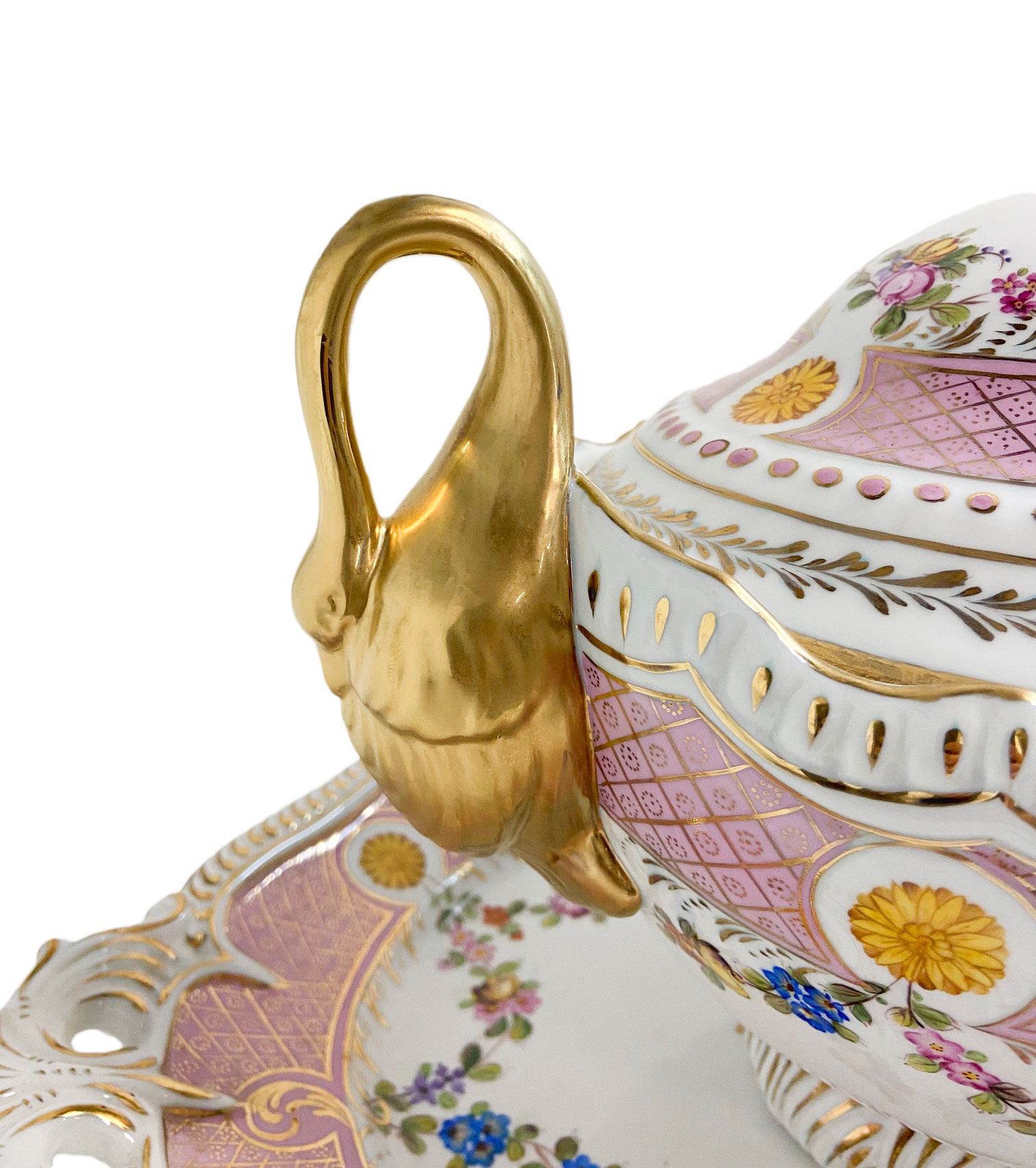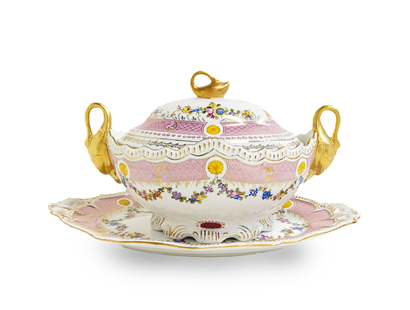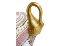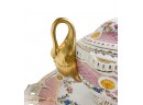 This is a stunning porcelain Tureen Set that is sure to impress with its exquisite craftsmanship and elegant design. This remarkable piece is enhanced by the intricate gold swan handles, adding a touch of regal charm and sophistication.