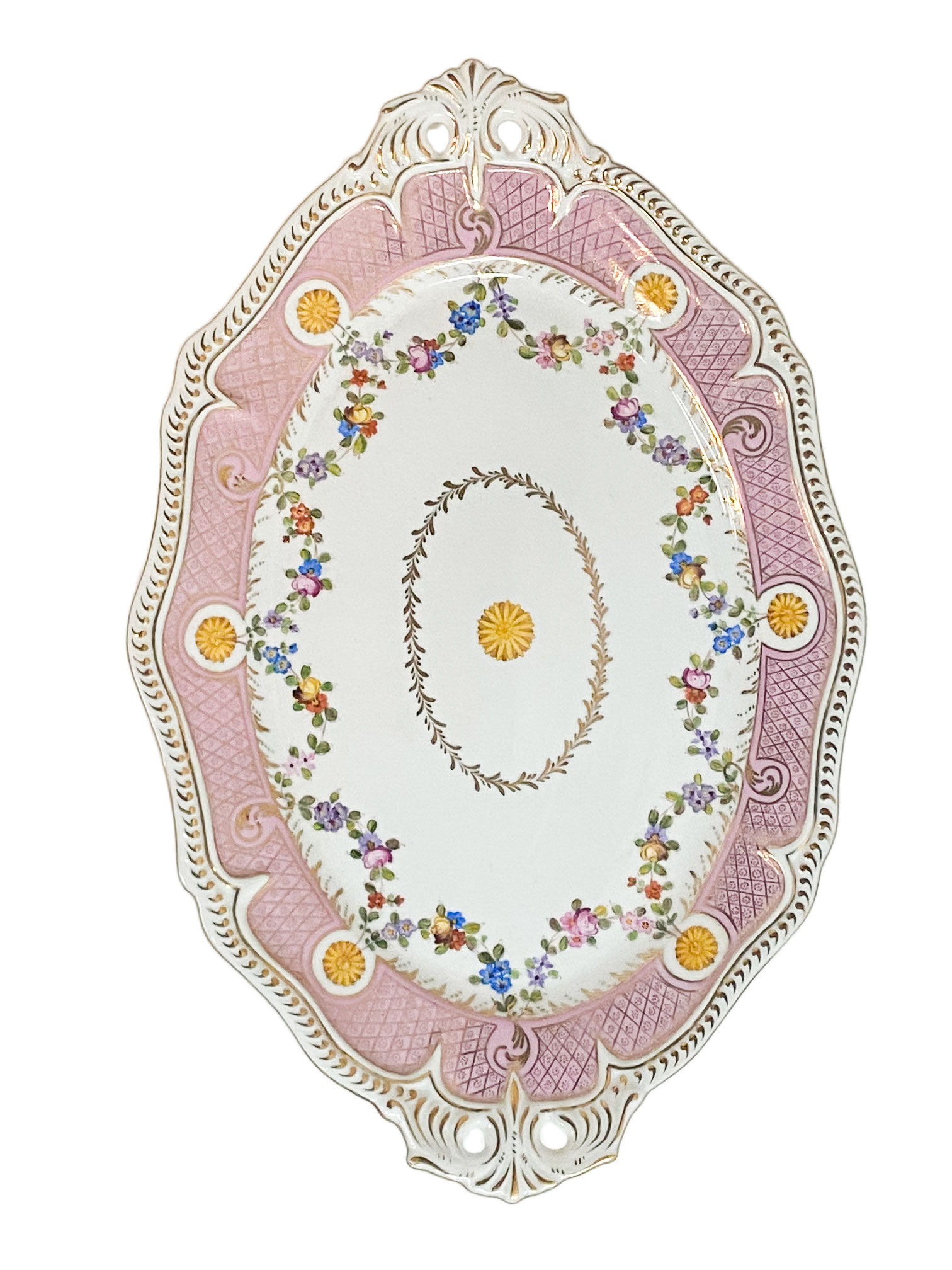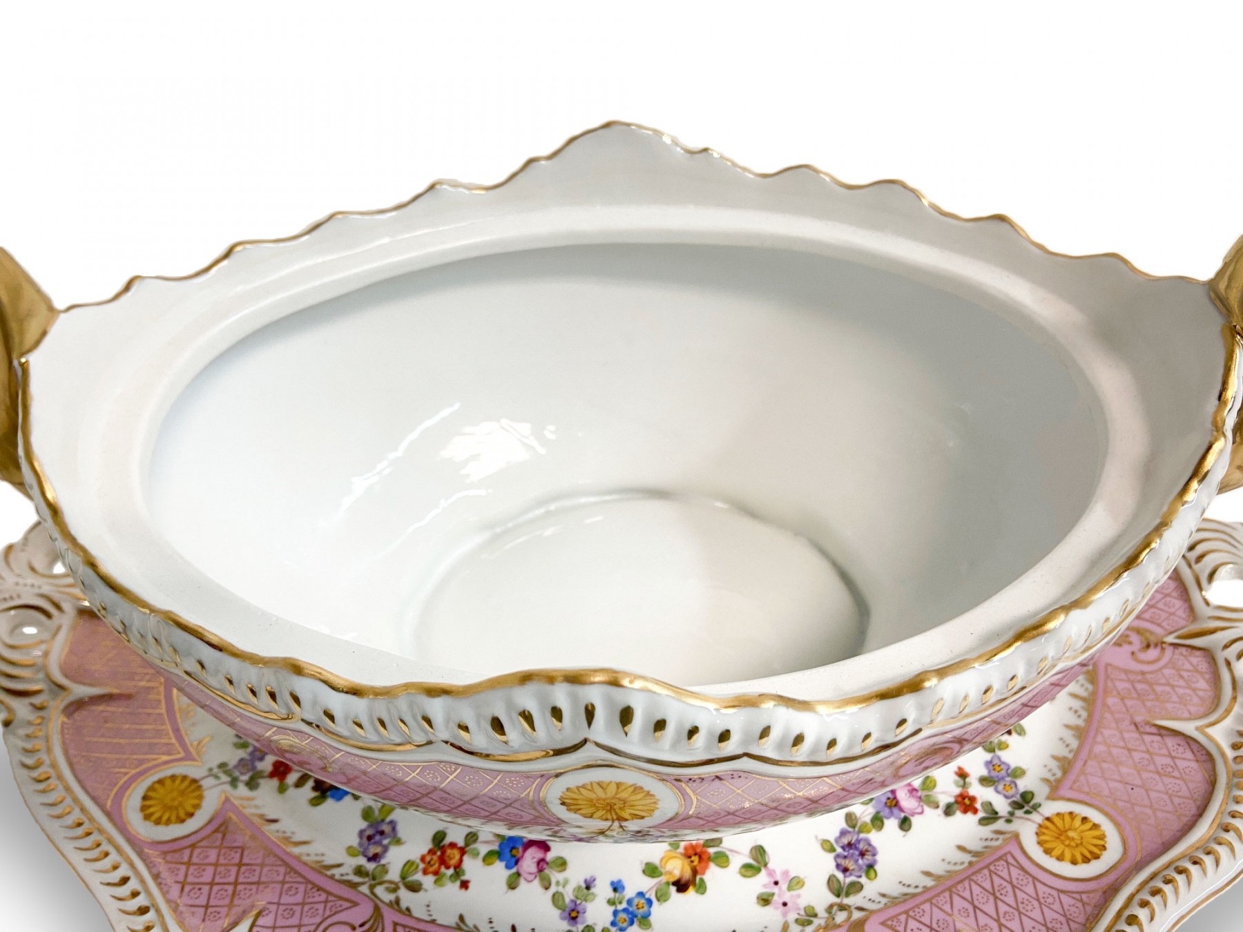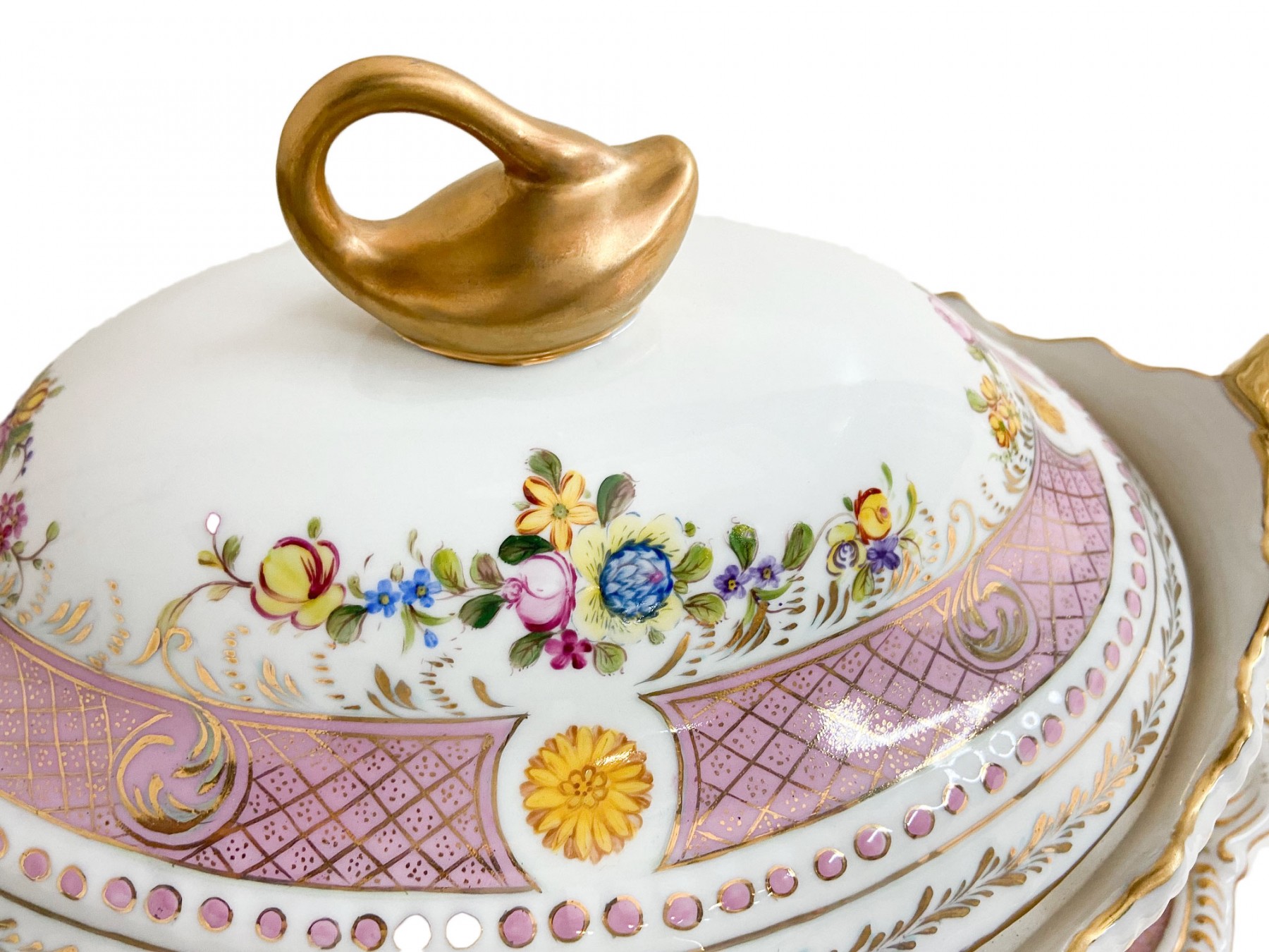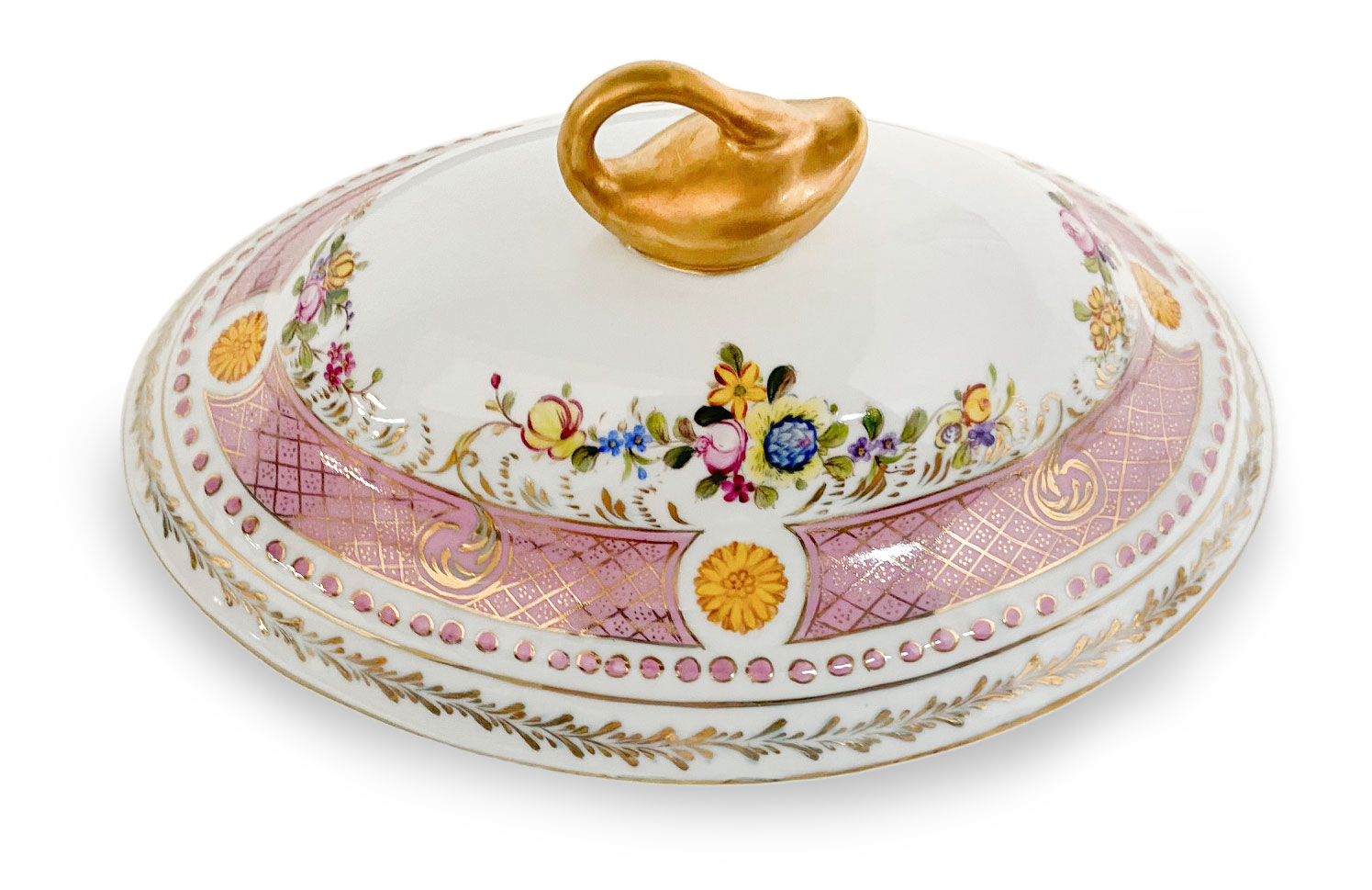 This is a stunning porcelain Tureen Set that is sure to impress with its exquisite craftsmanship and elegant design. This remarkable piece is enhanced by the intricate gold swan handles, adding a touch of regal charm and sophistication.