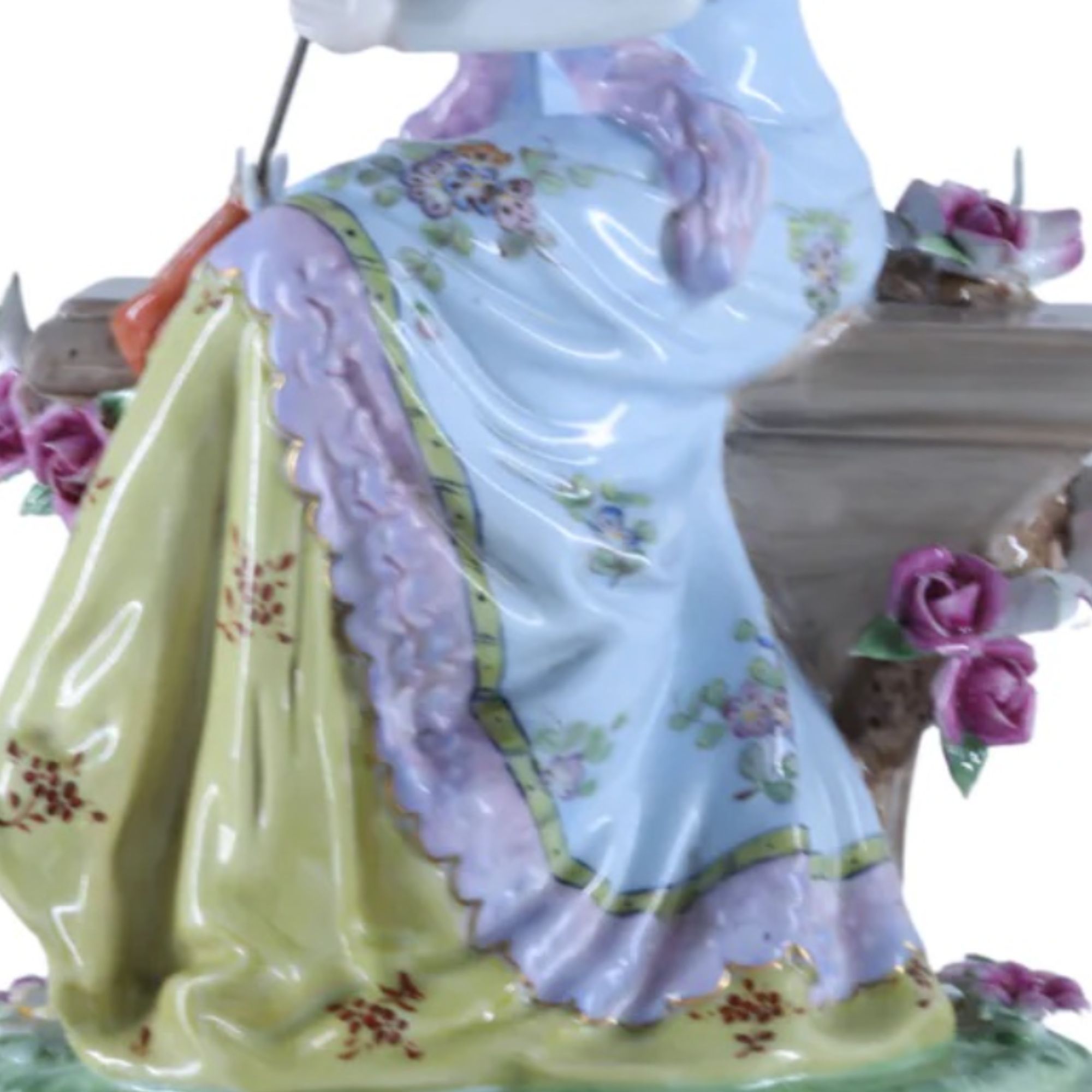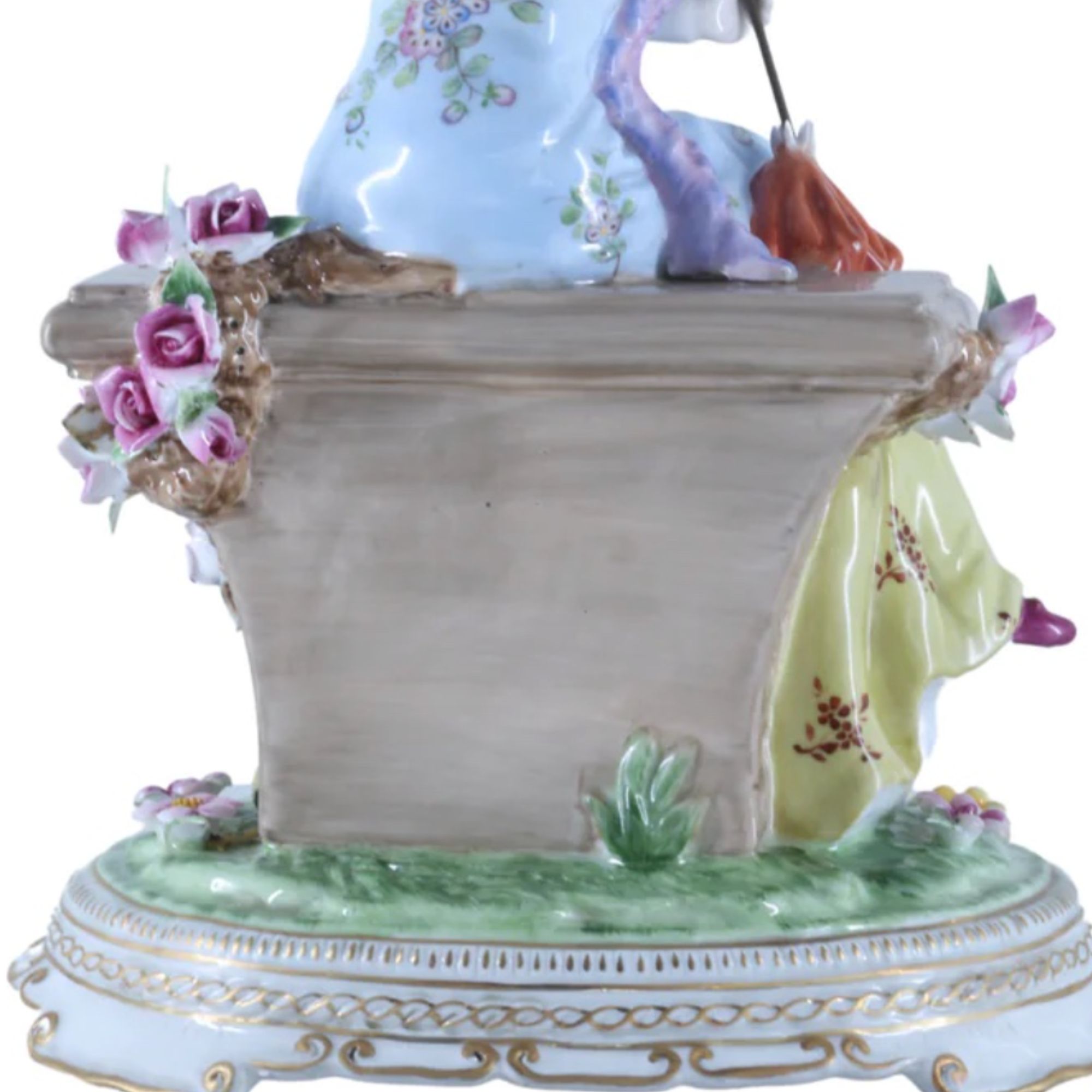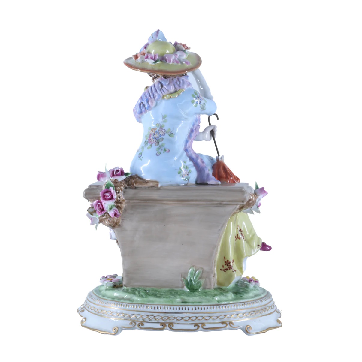 The figurine not only showcases the artist's skill but also invites viewers to step into a world of grace and tranquility. It captures the essence of an outdoor setting, where nature and humanity intertwine in a dance of harmony. This beautiful porcelain figurine is more than a mere representation; it is a gateway to a bygone era, a celebration of artistry, and a tribute to the enduring allure of classical Rococo style.
