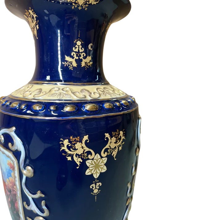 A timeless and refined piece, this vase is more than just a decorative object; it's a symbol of elegance and a testament to the skill and craftsmanship of the artisans who created it. Don't miss the opportunity to make this exceptional cobalt blue Rococo vase yours and enjoy the artistry and charm it brings to your surroundings.