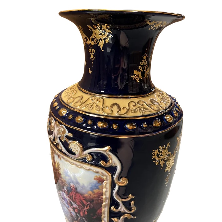 Introducing a beautiful hand-painted cobalt blue vase, a stunning embodiment of classic Rococo style, adorned with elegant gold detailing. This vase is not just a decorative piece; it's a statement of timeless elegance and refined taste.