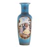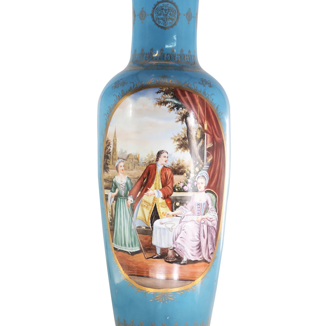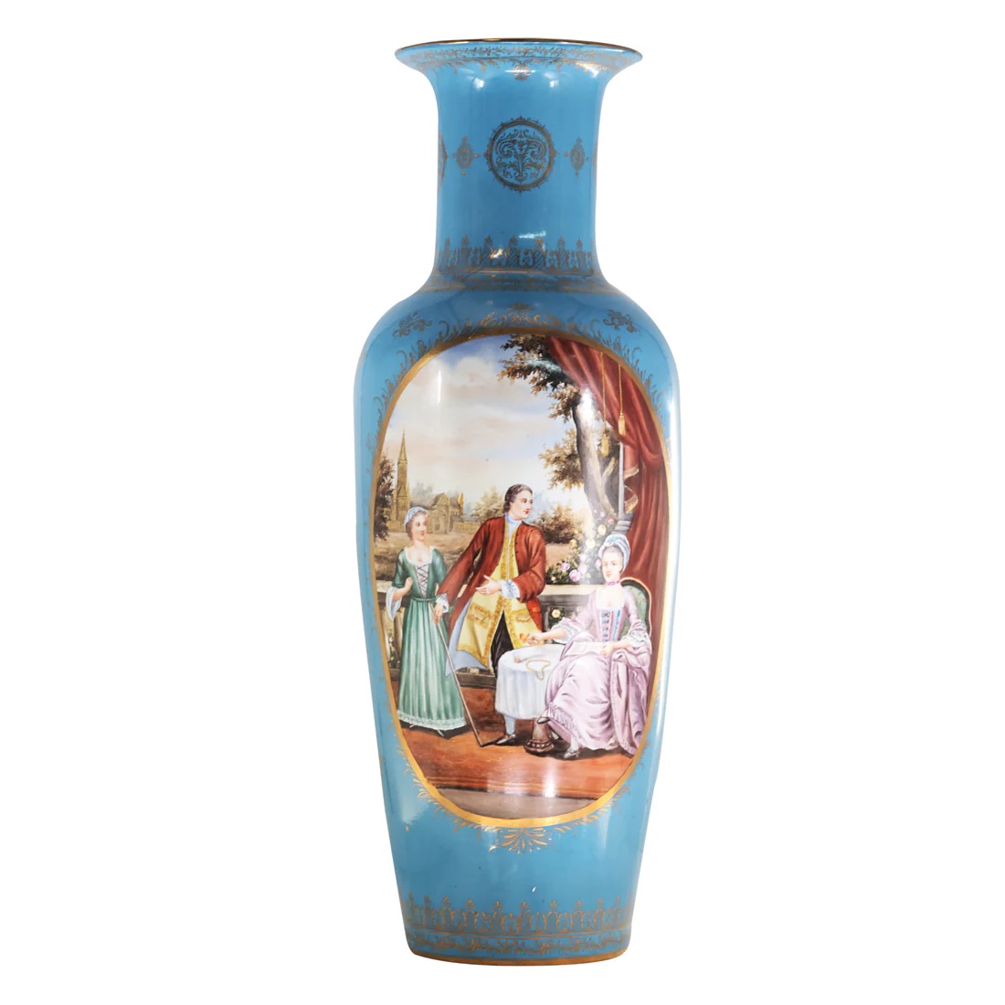 The vase's enchanting light blue hue sets a serene backdrop for the Rococo motifs that adorn its surface, depicting a society scene in a symphony of colors—shades of blue, brown, yellow, and red all hand-painted with meticulous care.