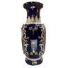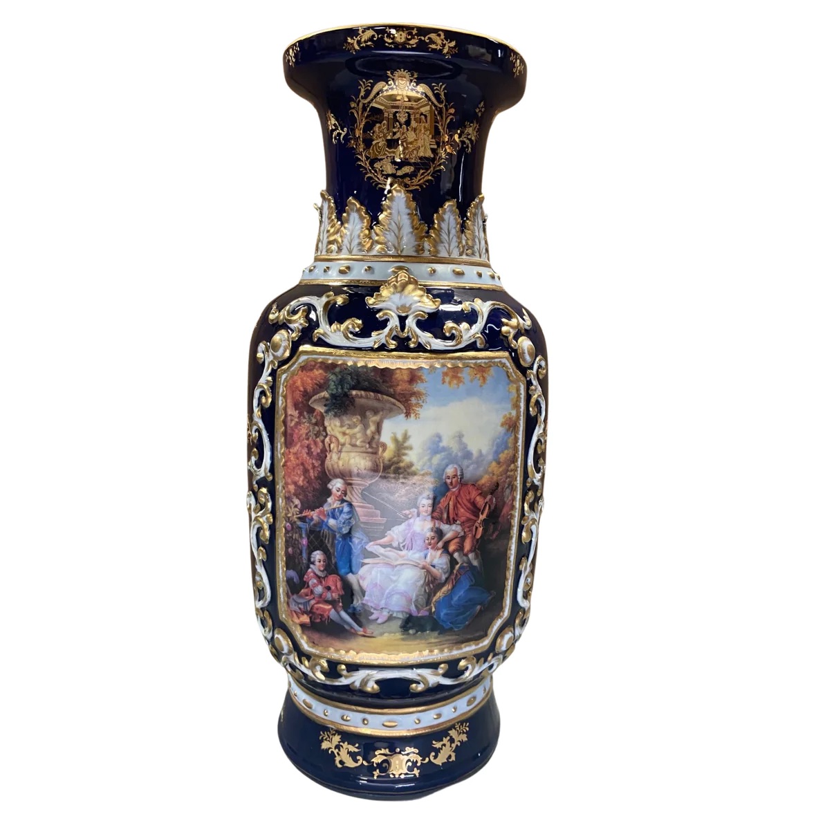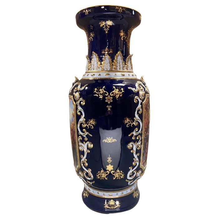 A highly ornate porcelain vase. The dark blue color of the vase is striking and sophisticated, creating a vivid backdrop for the piece’s Rococo motif. It depicts a society scene set against a natural backdrop, typical of the Rococo style. This stunning vase is the perfect addition to any room, bringing a timeless elegance that reflects your individual style and taste.