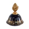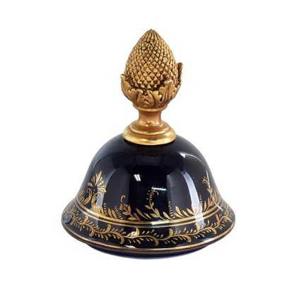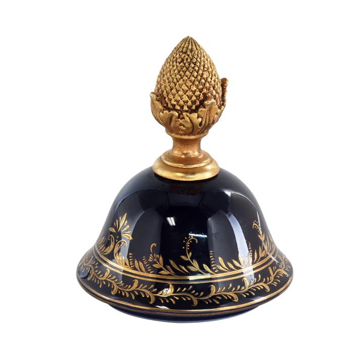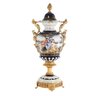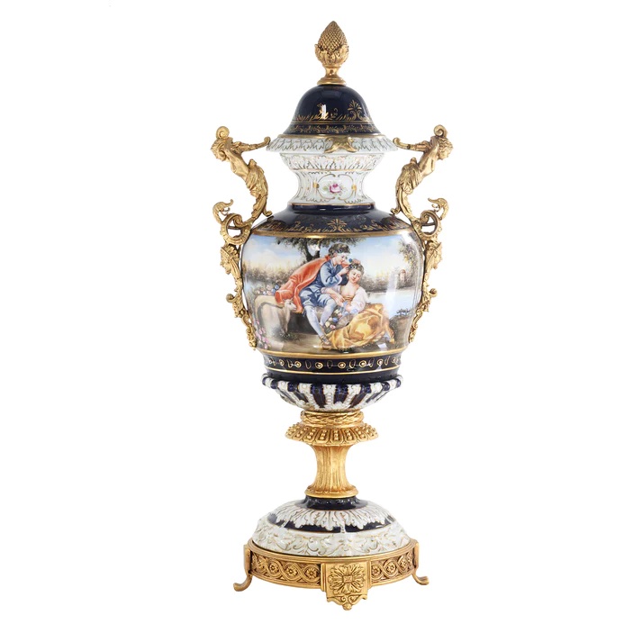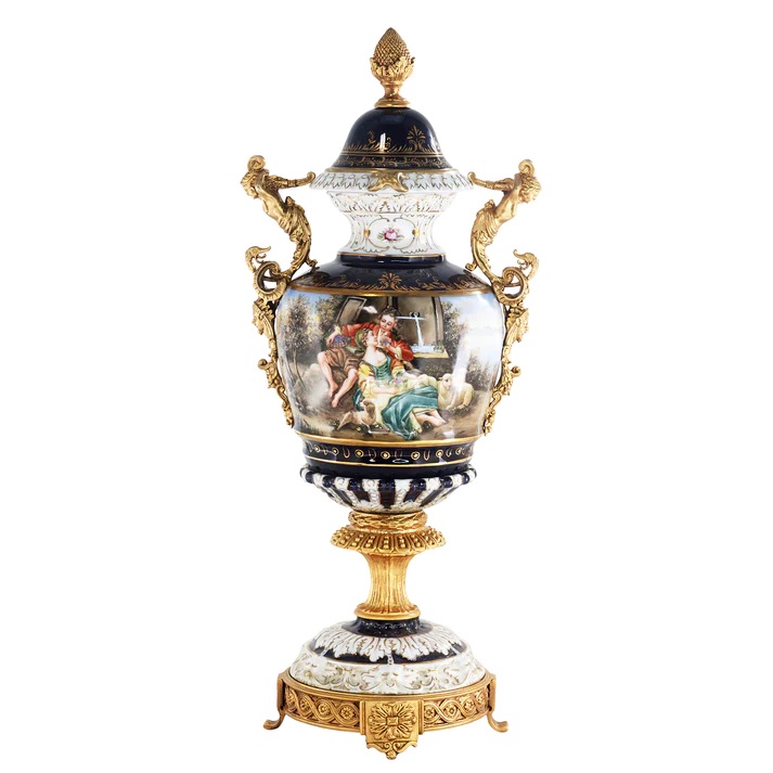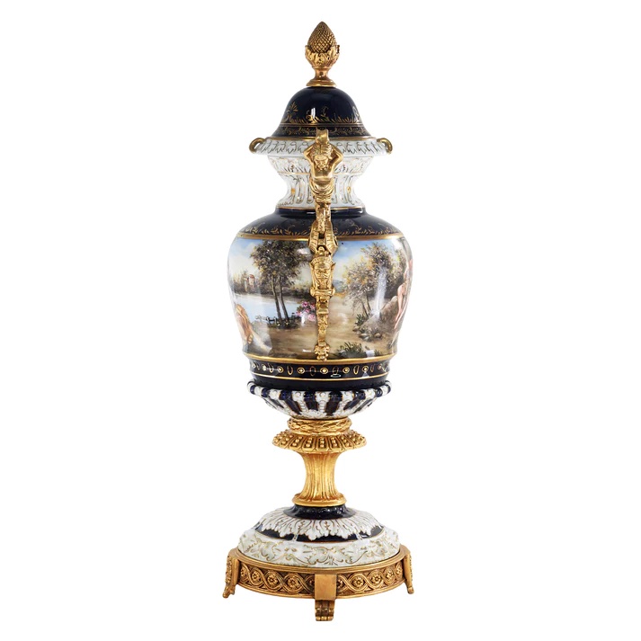 An exceptional porcelain urn. The urn's body sits on top of an ornate bronze flared stem, and a circular base. This piece is highlighted by the incredibly detailed bronze handles. The dark blue and white color of the vase is striking and sophisticated, creating a vivid backdrop for the piece’s hand-painted Rococo style motifs.