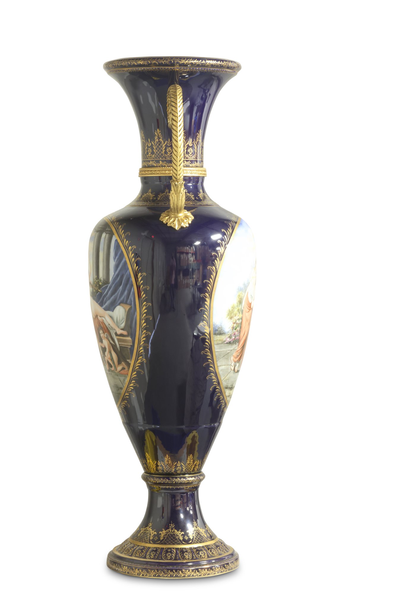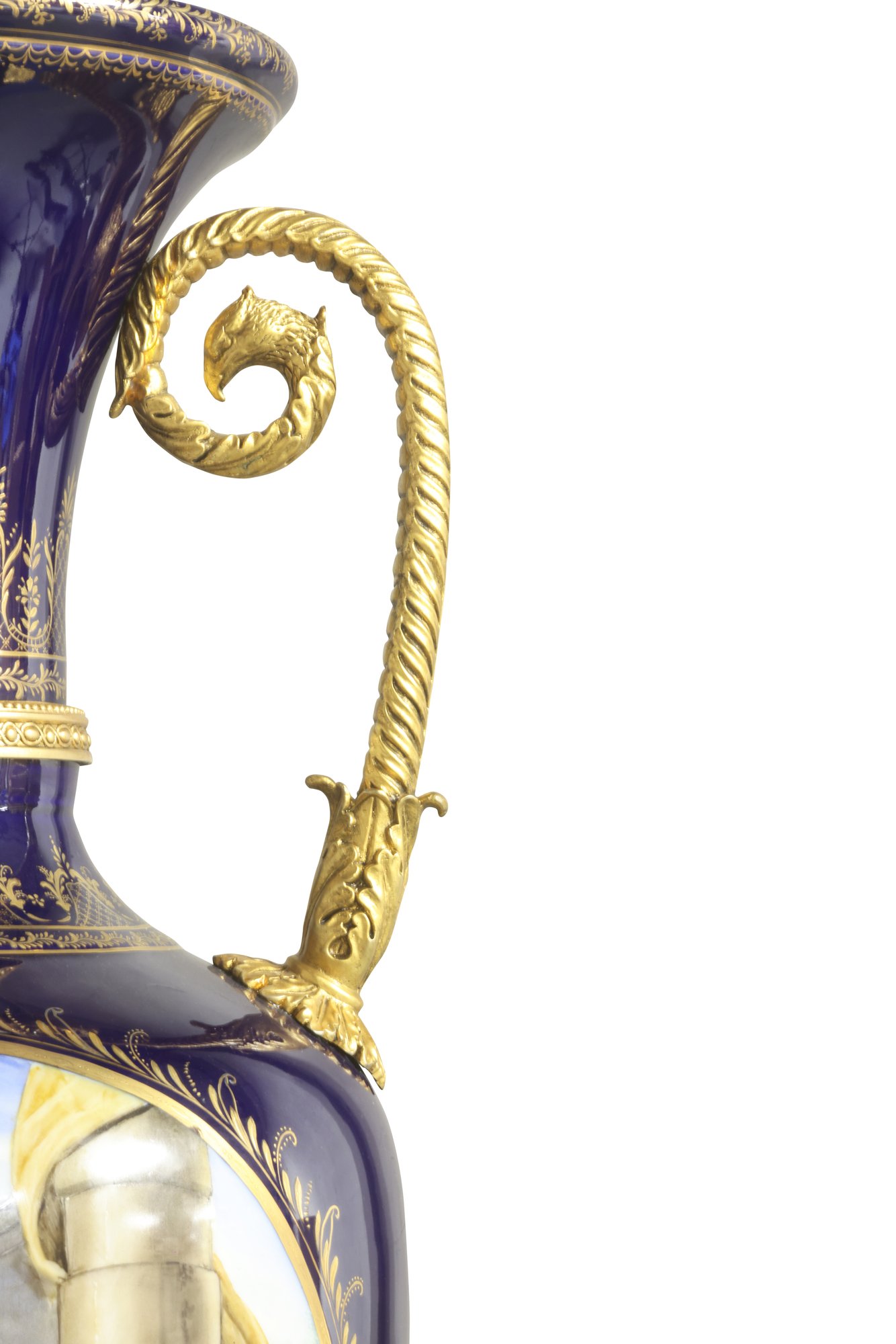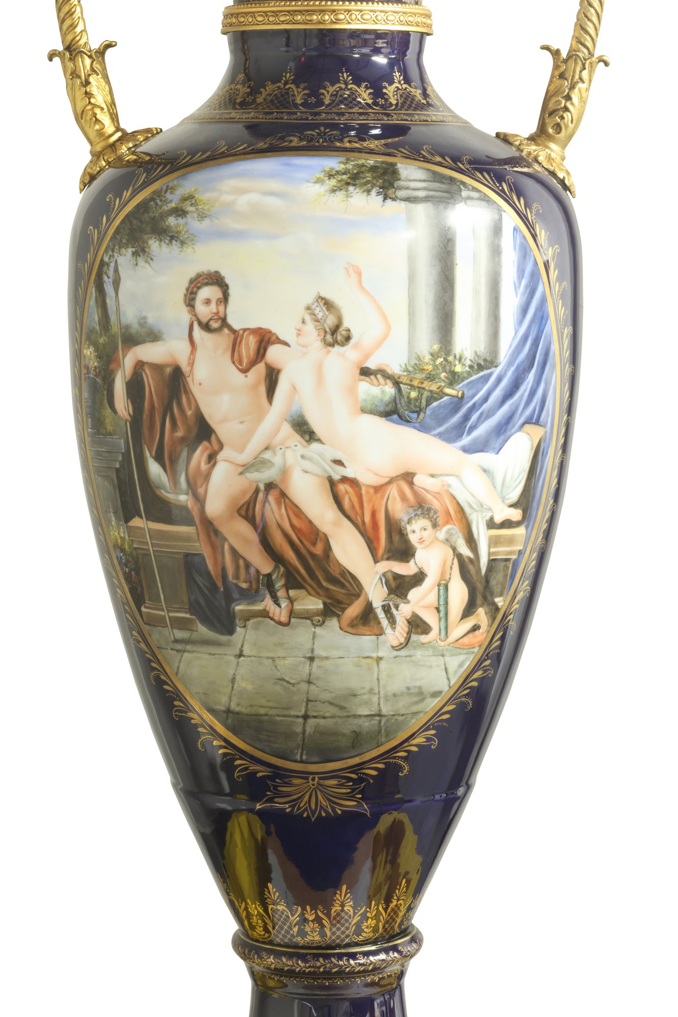 The vase's striking blue color sets the stage for the incredibly detailed natural bronze elements, creating a vivid and sophisticated backdrop. The hand-painted Rococo motif, depicting a tasteful nude scene, adds a touch of sensuality and elegance to the design.