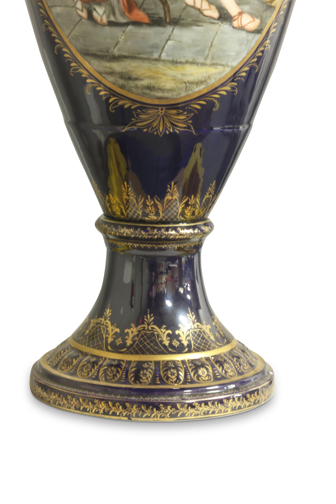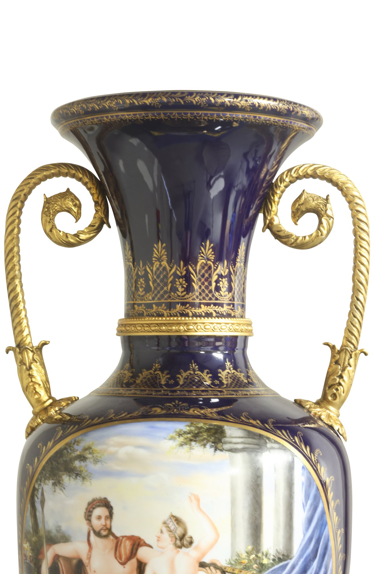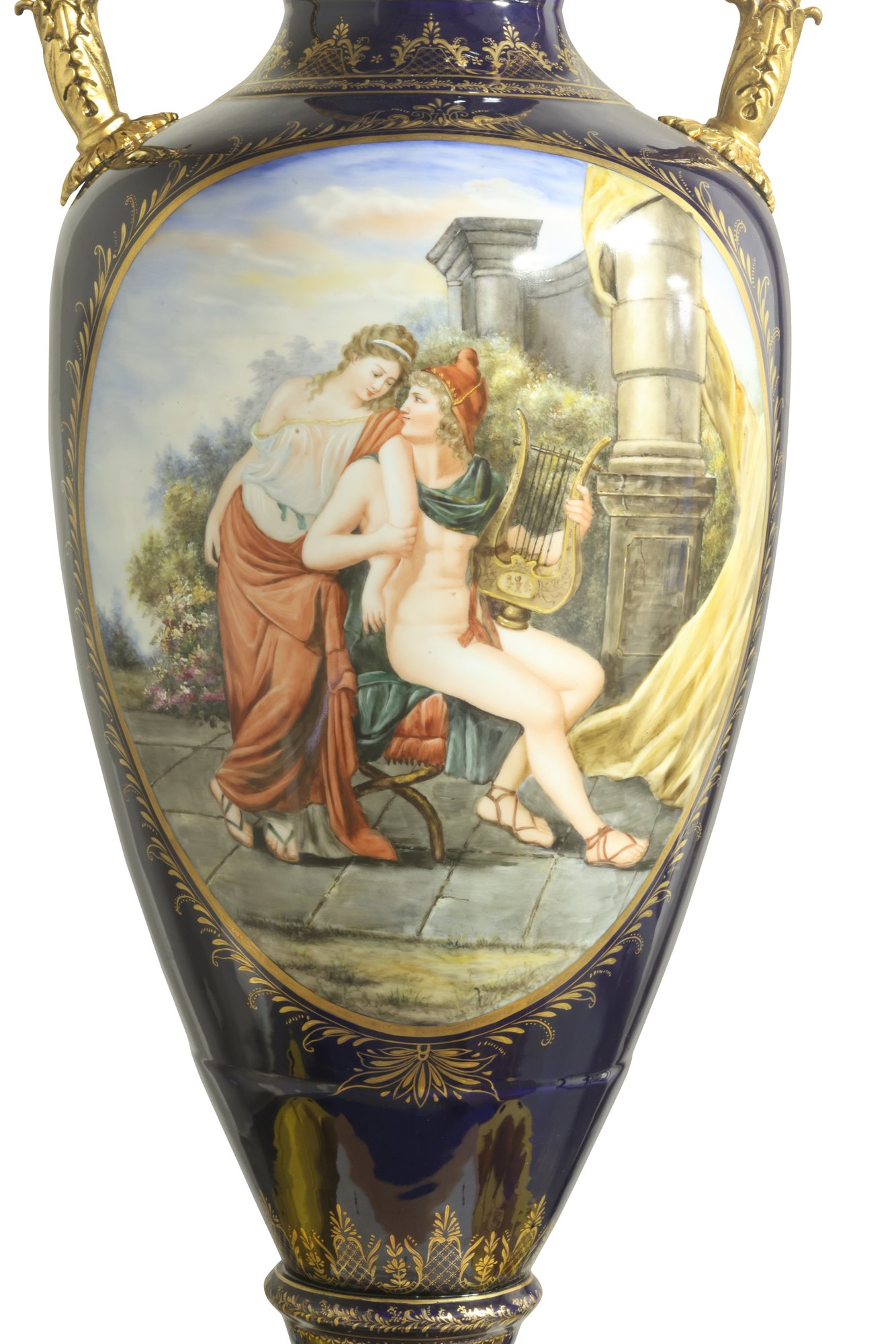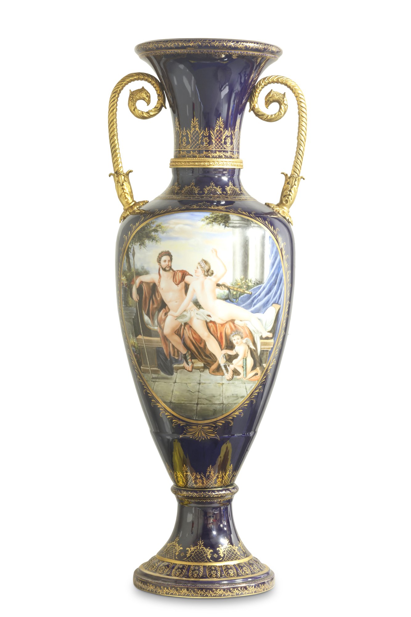 The vase's striking blue color sets the stage for the incredibly detailed natural bronze elements, creating a vivid and sophisticated backdrop. The hand-painted Rococo motif, depicting a tasteful nude scene, adds a touch of sensuality and elegance to the design.