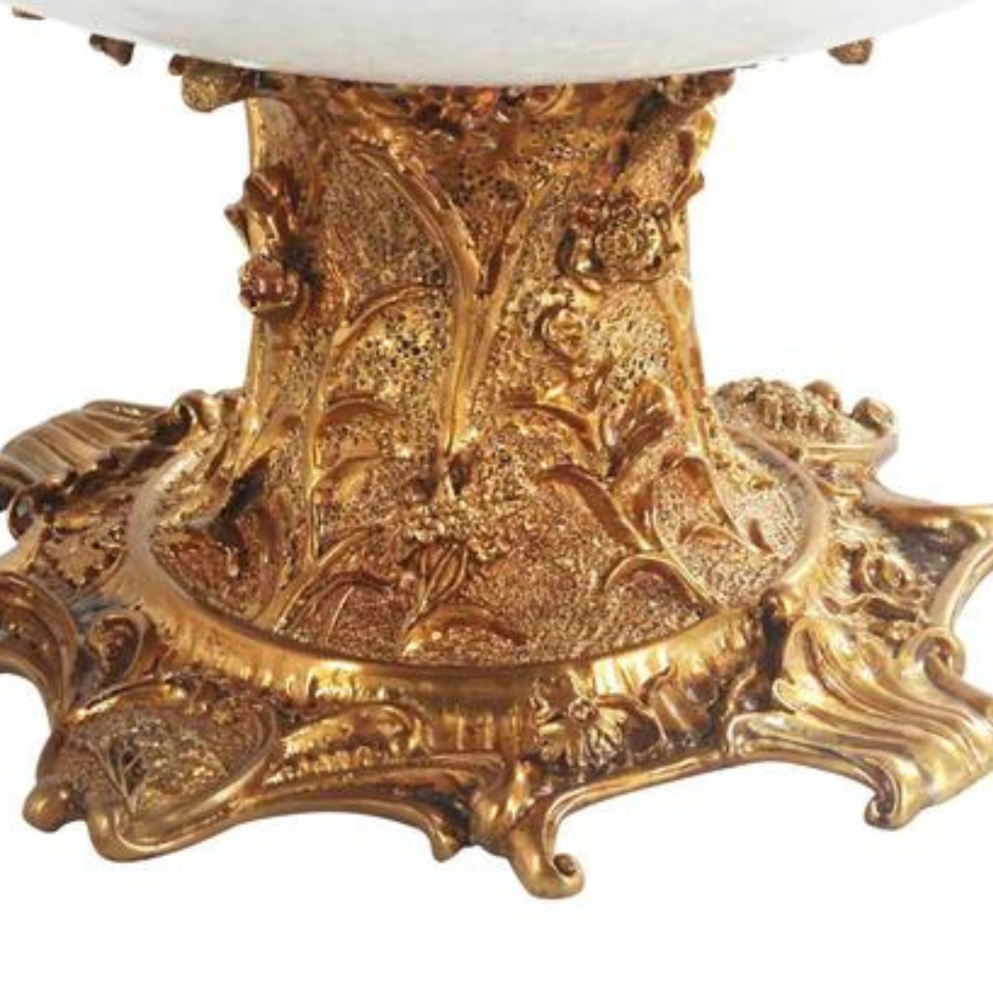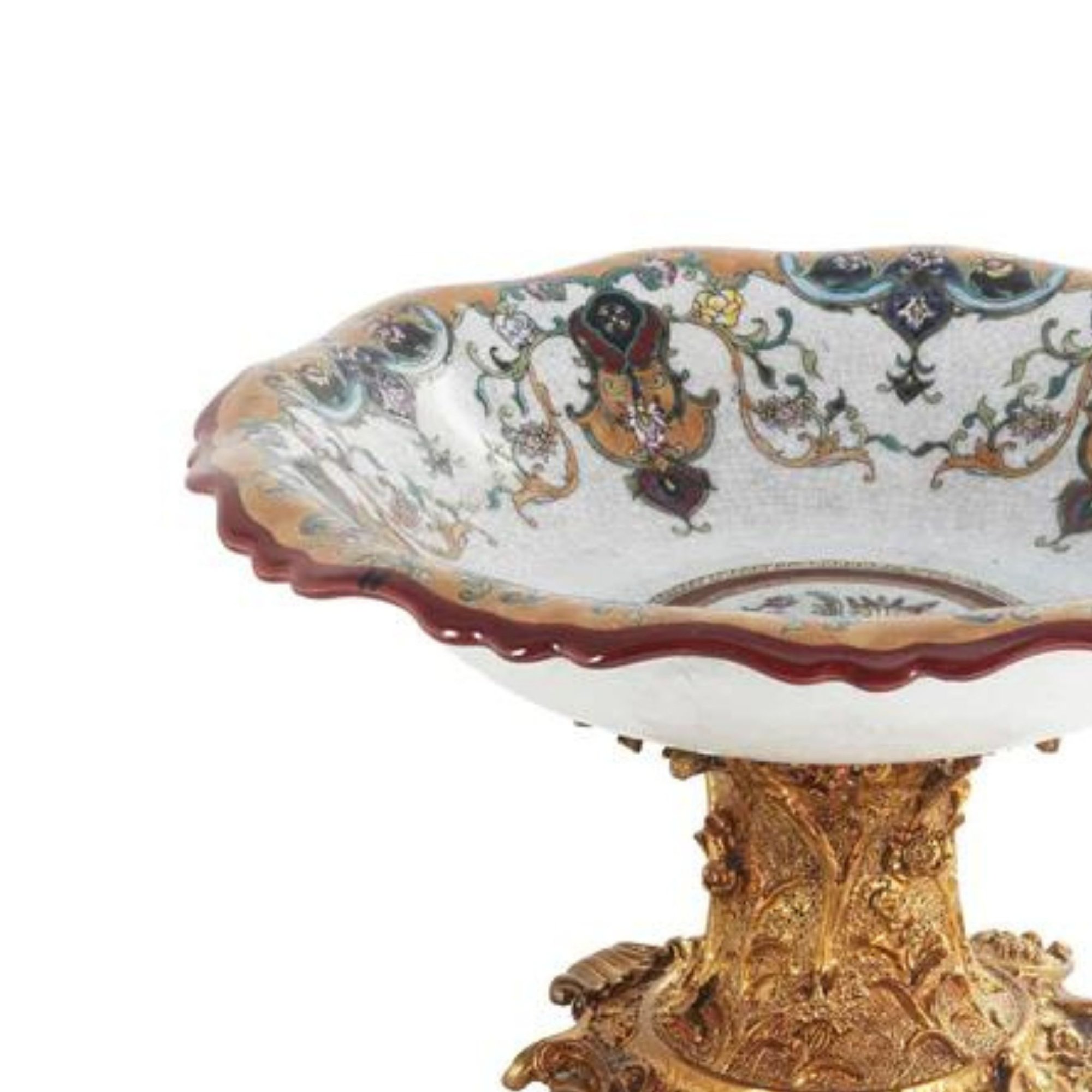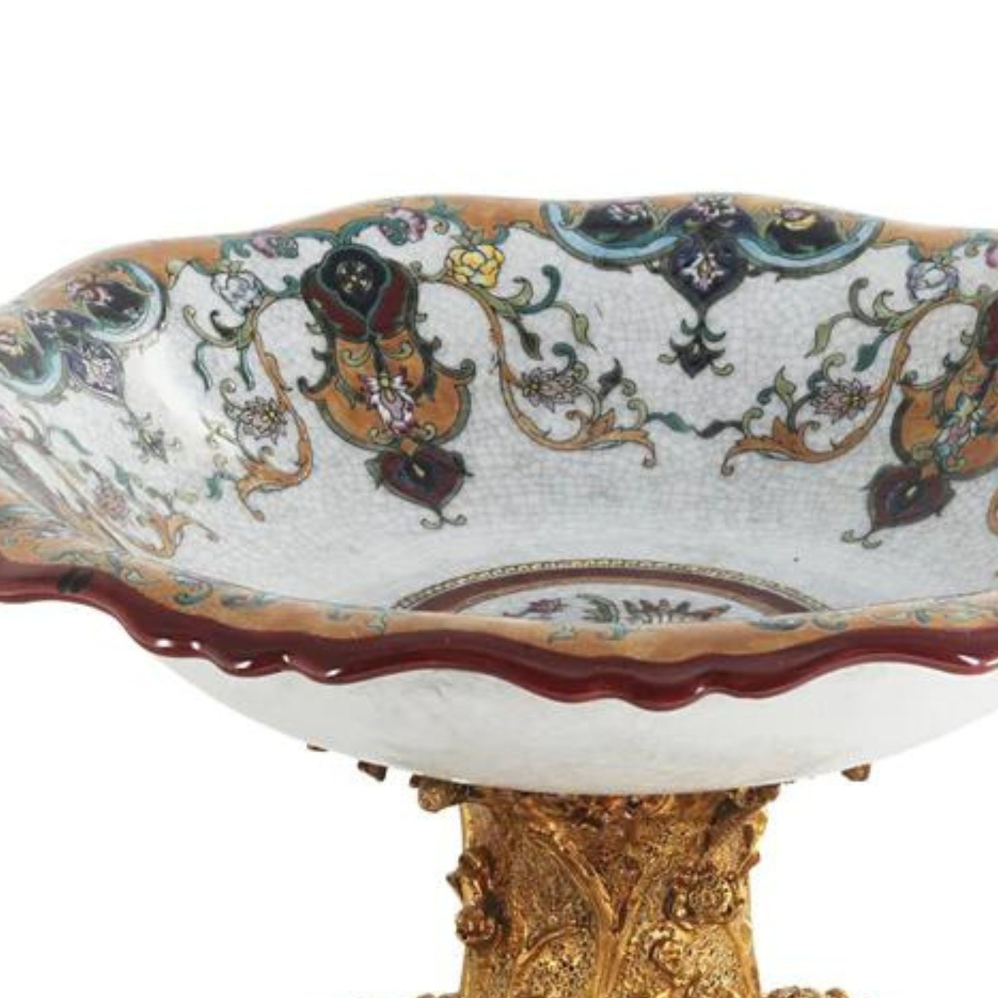 Crafted with meticulous care, the bowl's elegant porcelain design harmonizes beautifully with its sturdy bronze base, creating a striking and versatile decorative piece that transcends ordinary tableware. Its versatility knows no bounds, making it the perfect addition to any space, whether in the comfort of your home or the ambiance of your office.