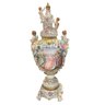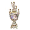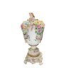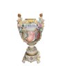 What truly sets this piece apart is the incredibly detailed three-dimensional hand-painted porcelain flowers that adorn it. The white and pastel color palette is simply gorgeous, creating a vivid backdrop for the hand-painted motifs. Each side of the vase depicts classical Rococo scenes, executed in enchanting shades of green, pink, and yellow.