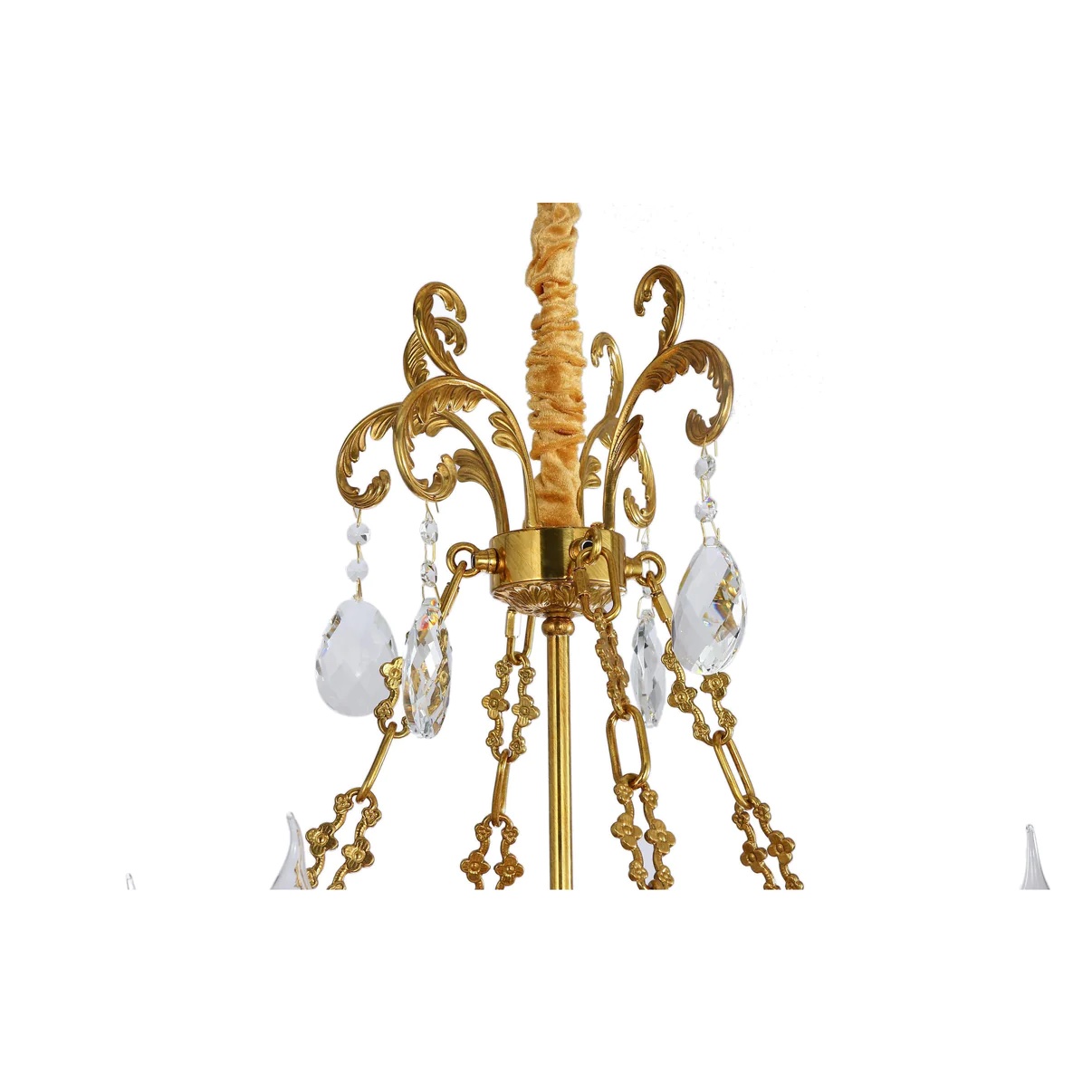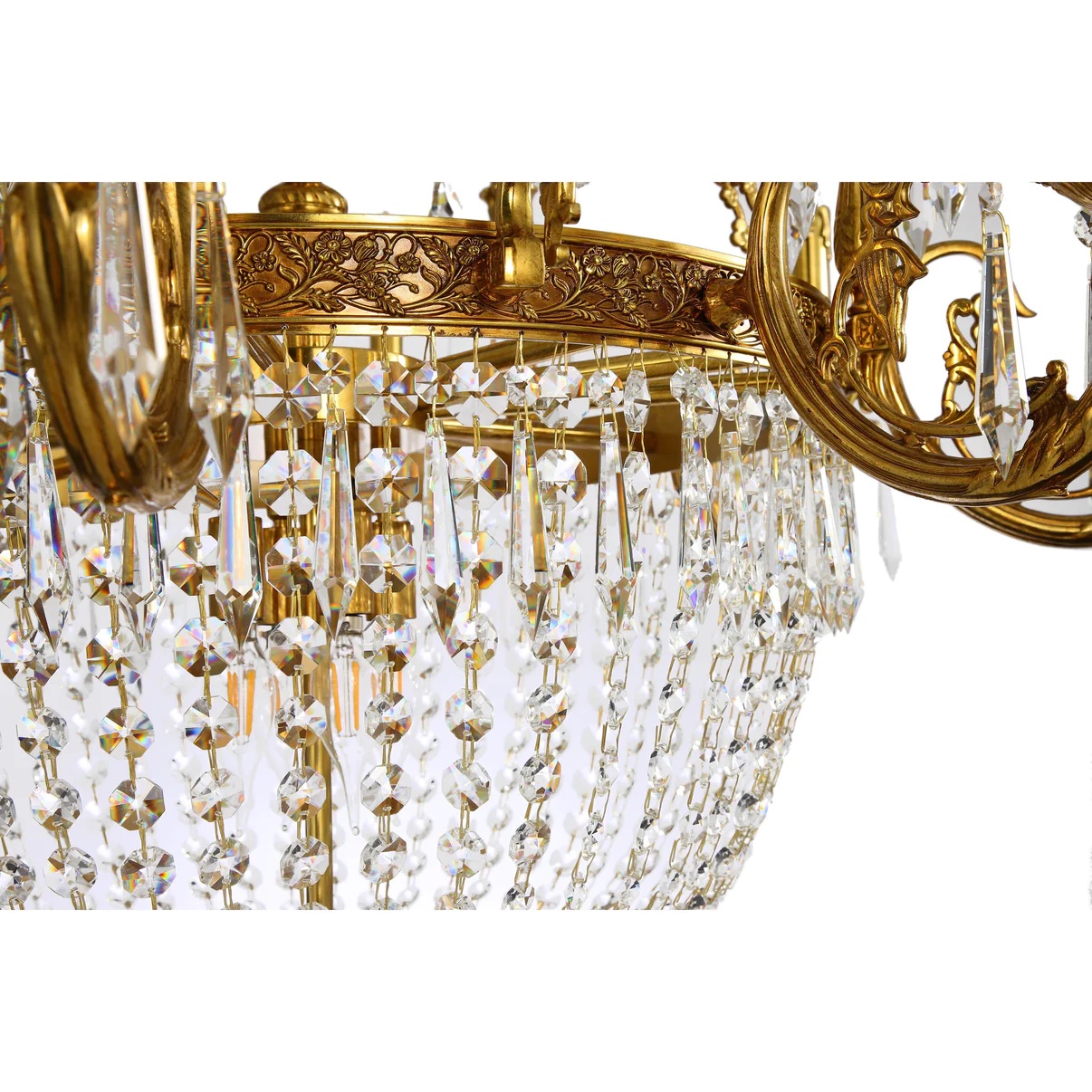 This chandelier's luxurious presence exemplifies the empire style. Each of the brass arms features flowing forms that tie in with the flower motif of the band. The candle lights sit on top of brass bobeche's with dangling crystal prisms. The crystal chains descend the chandelier and draw your eyes to the bottom bowl.
