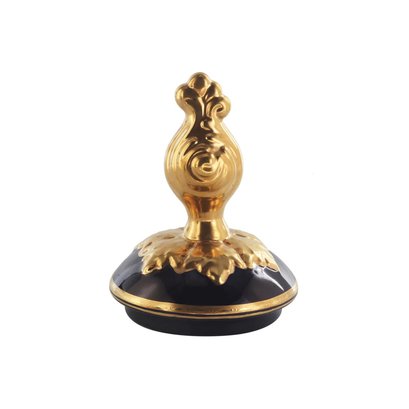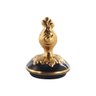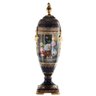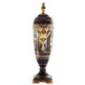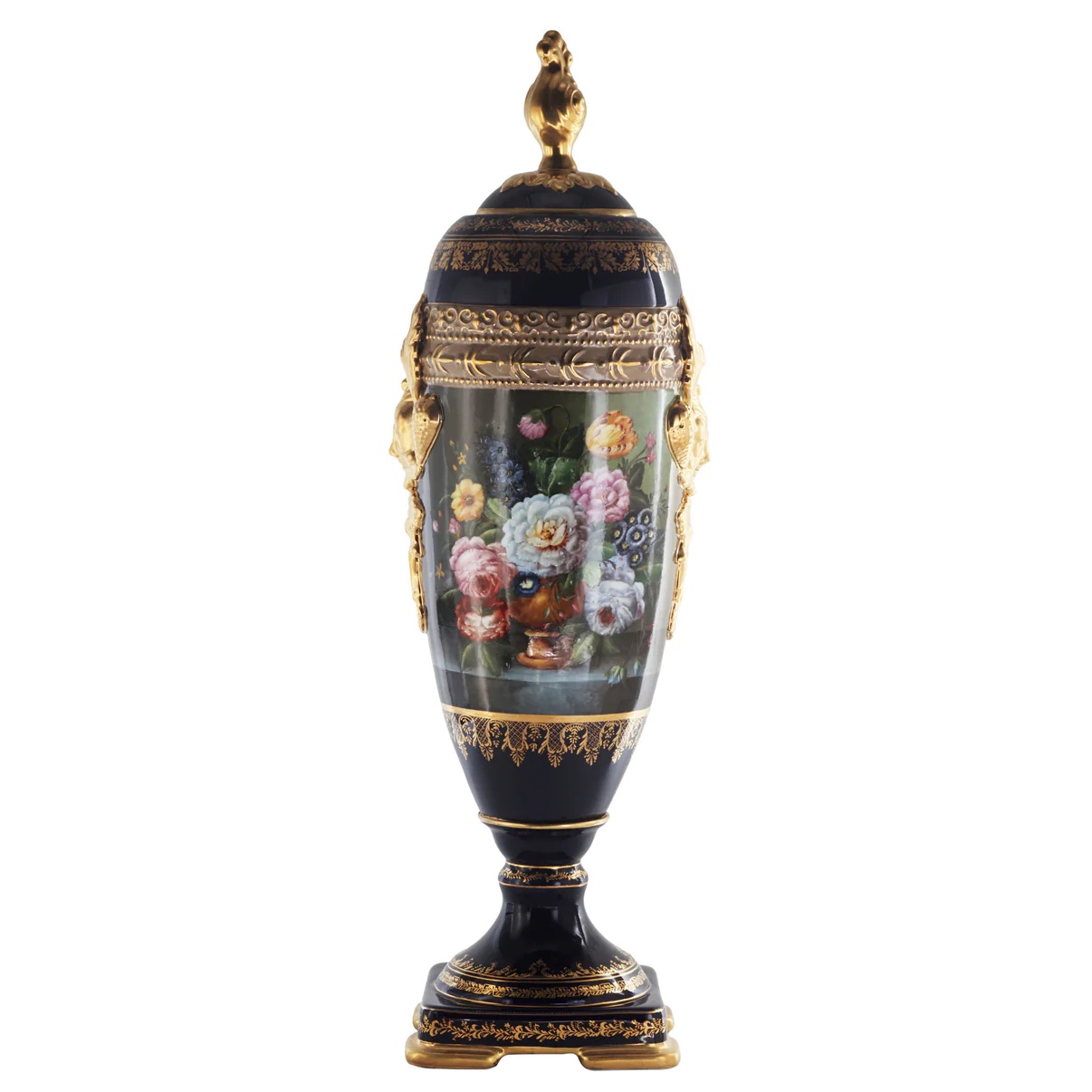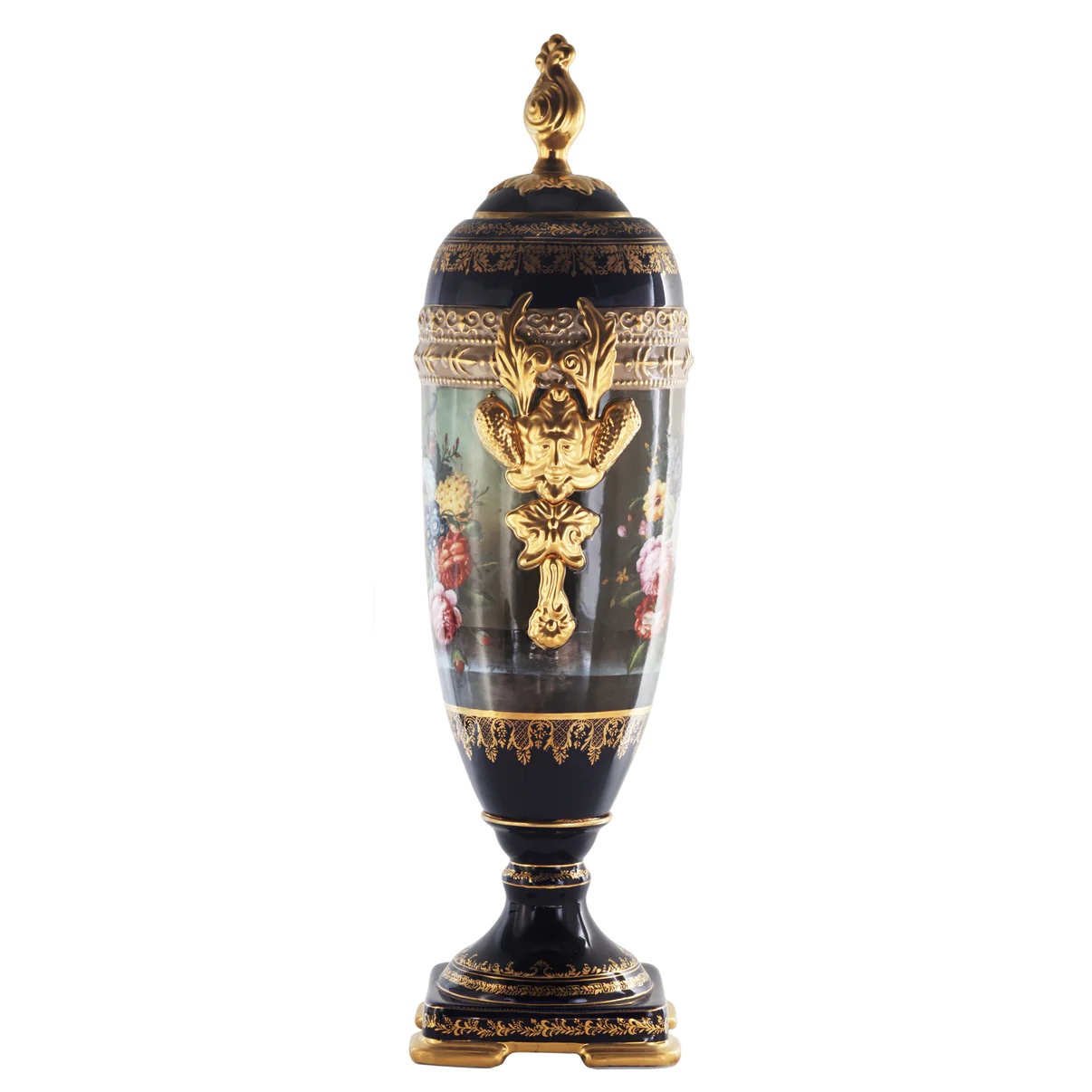 The cup's body sits on top of a flared stem, and a square base. This piece is highlighted by its incredibly detailed porcelain handles. The dark blue color of the vase is striking and sophisticated, creating a vivid backdrop for the piece’s painted Rococo motif. Each side depicts an elegant Baroque floral nature motif visible in the background.