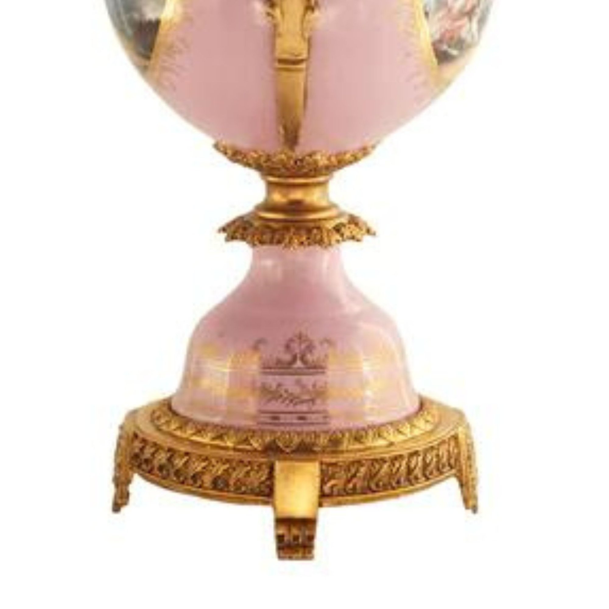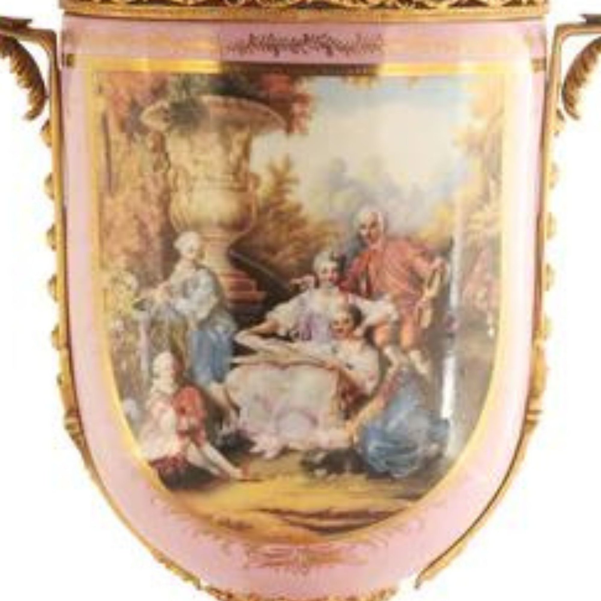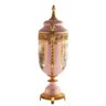 Up for auction is an immaculately hand-painted potpourri jar, a harmonious blend of artistry and craftmanship. The jar's porcelain body, painted with a rich pink hue, serves as a canvas for a stunning floral Rococo scene. It captures the essence of elegance, sitting atop an ornately detailed bronze circular base that resonates with nature's charm.