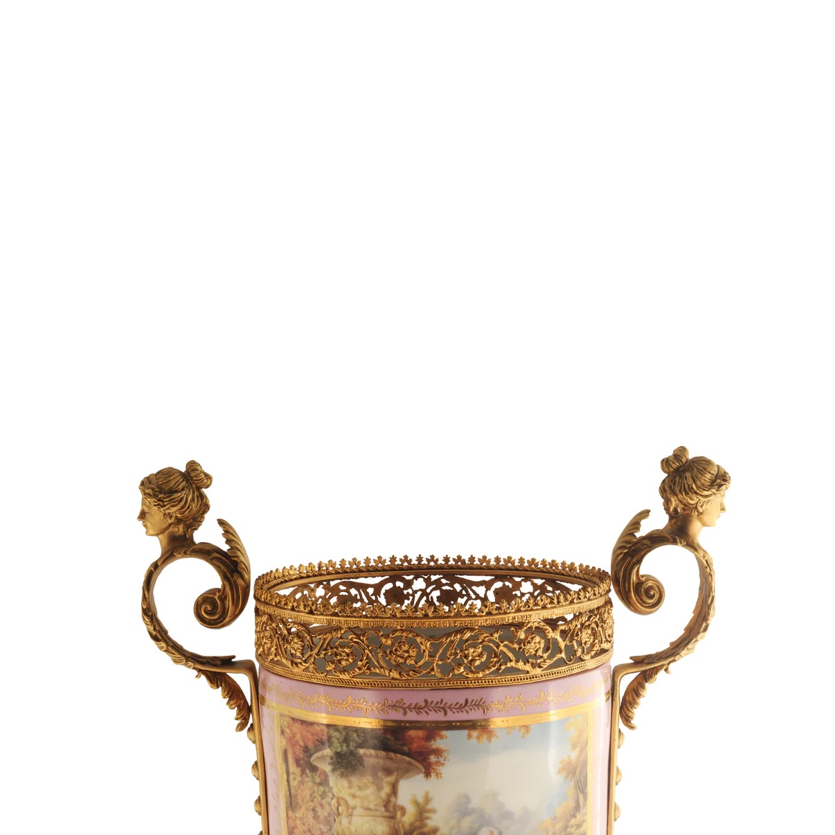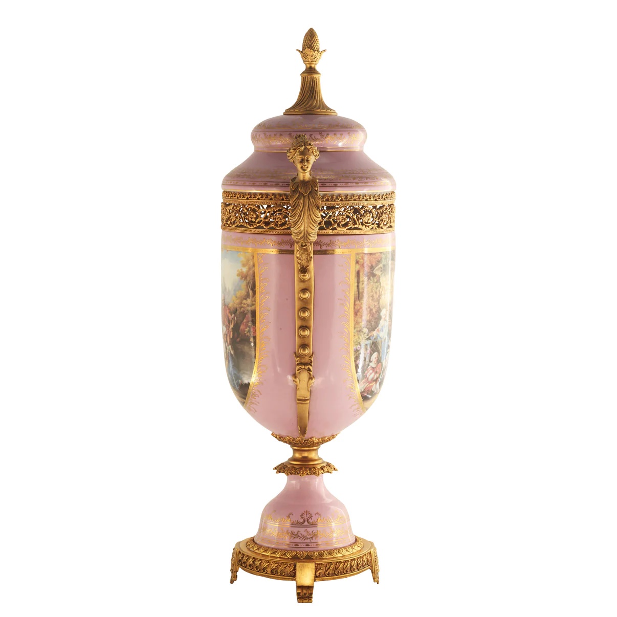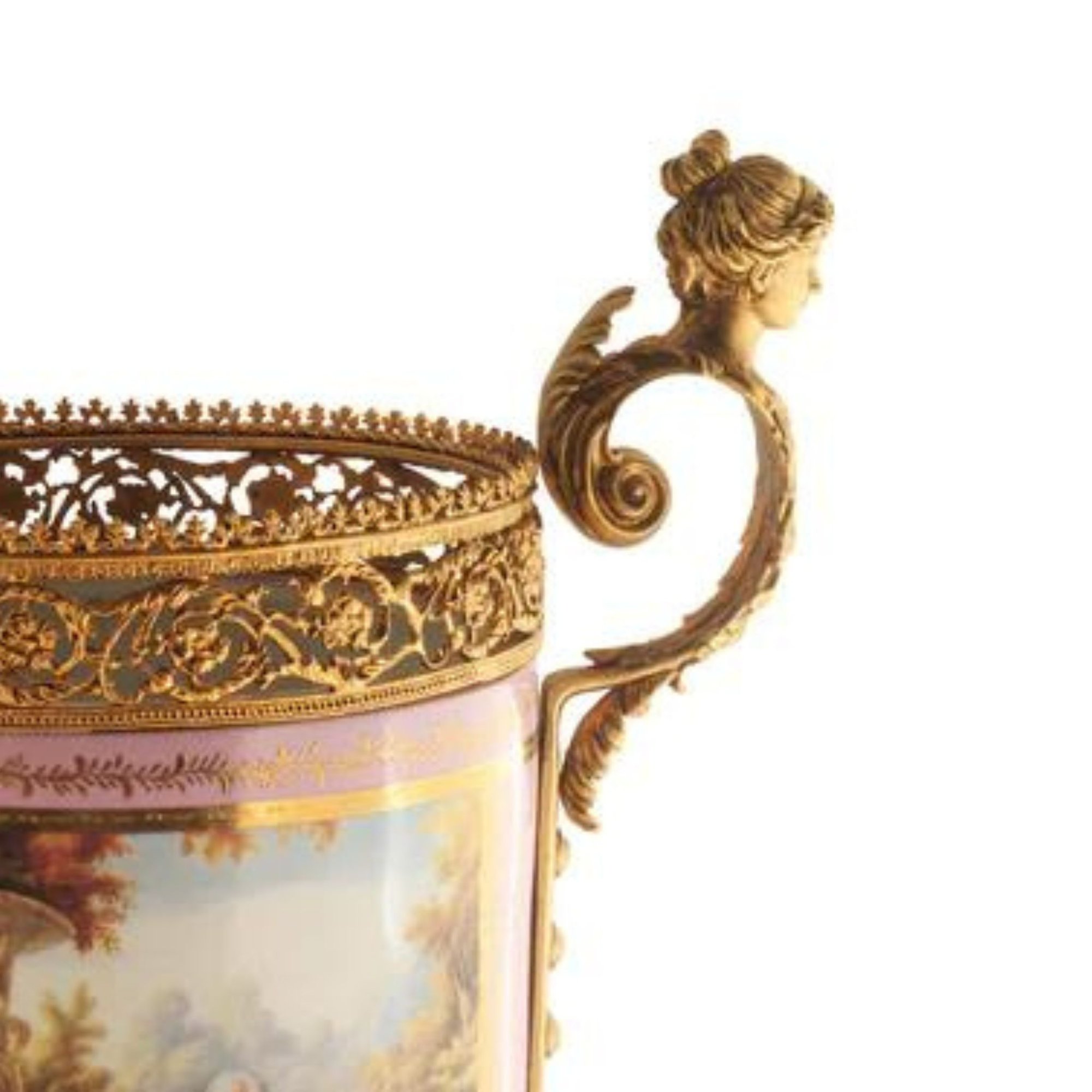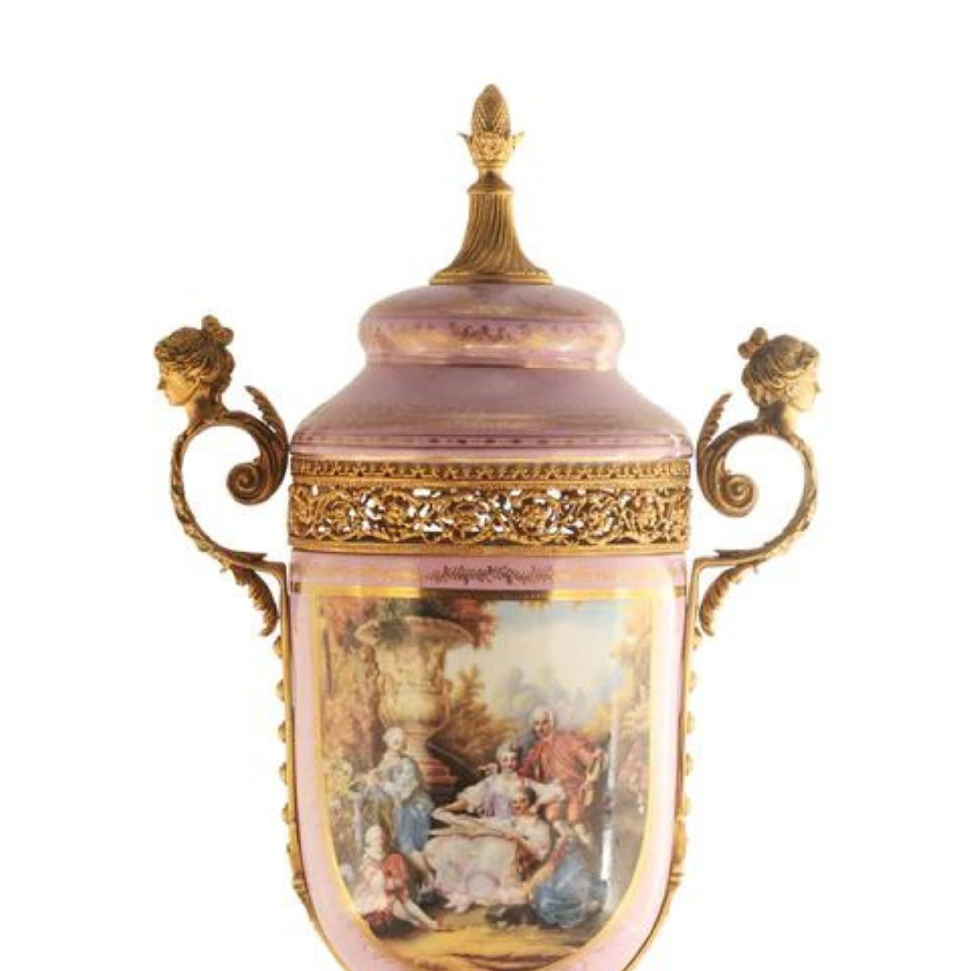 The standout feature of this piece has to be the remarkably detailed lady bust handles that gracefully adorn the jar's side. The intricate perforated bronze details encircle the jar, beautifully complemented by the glistening gold-painted lid.