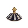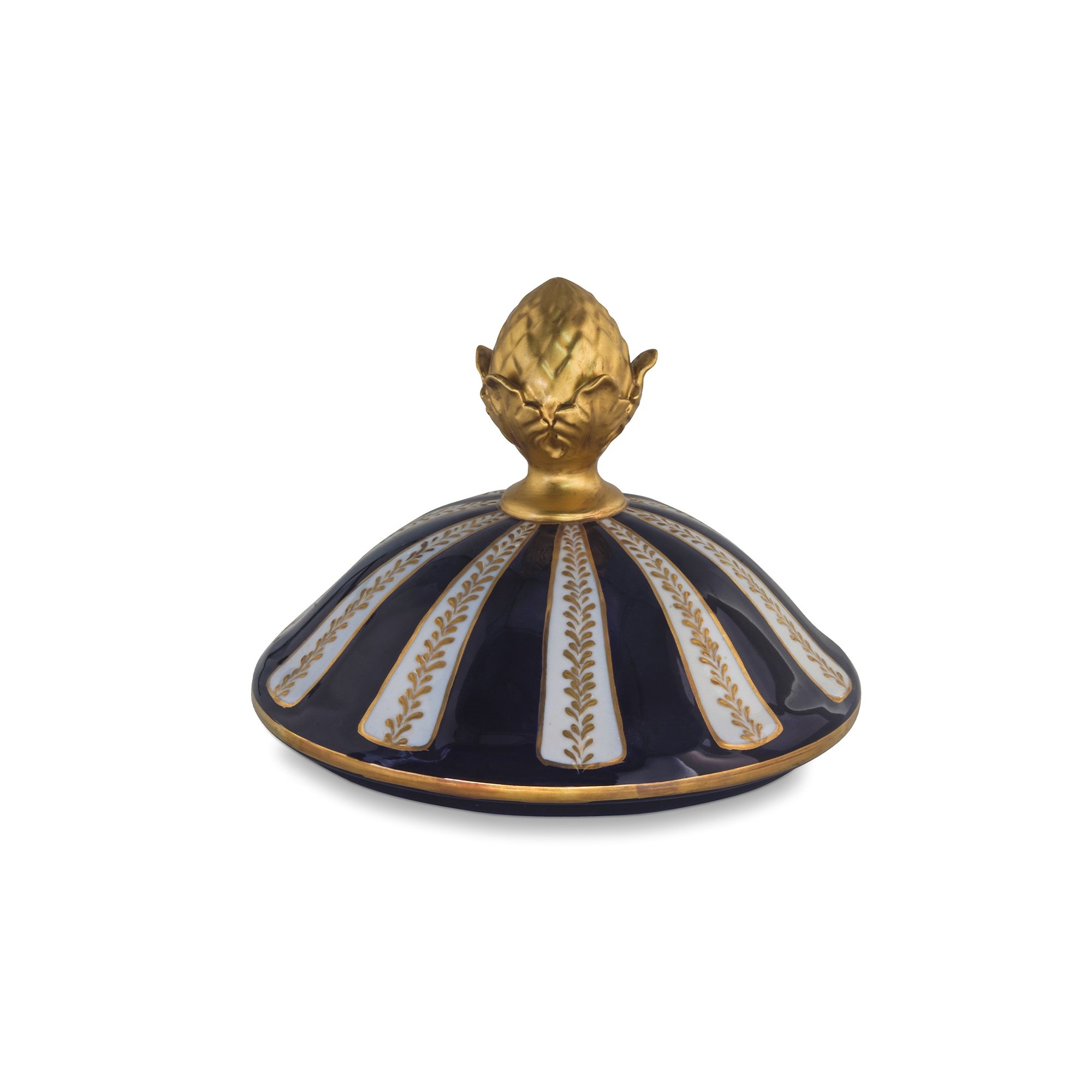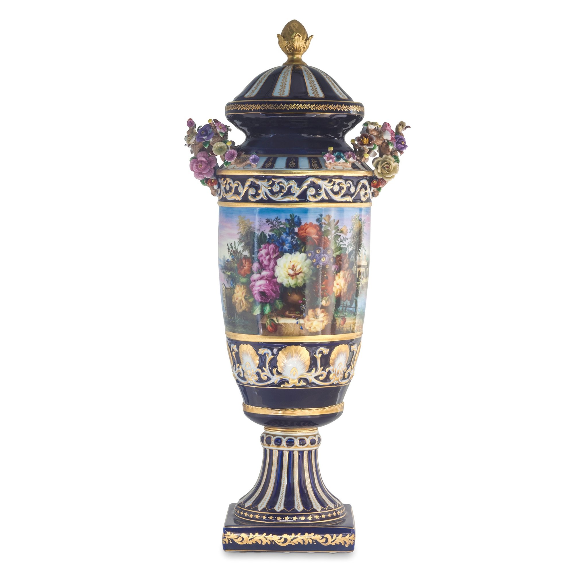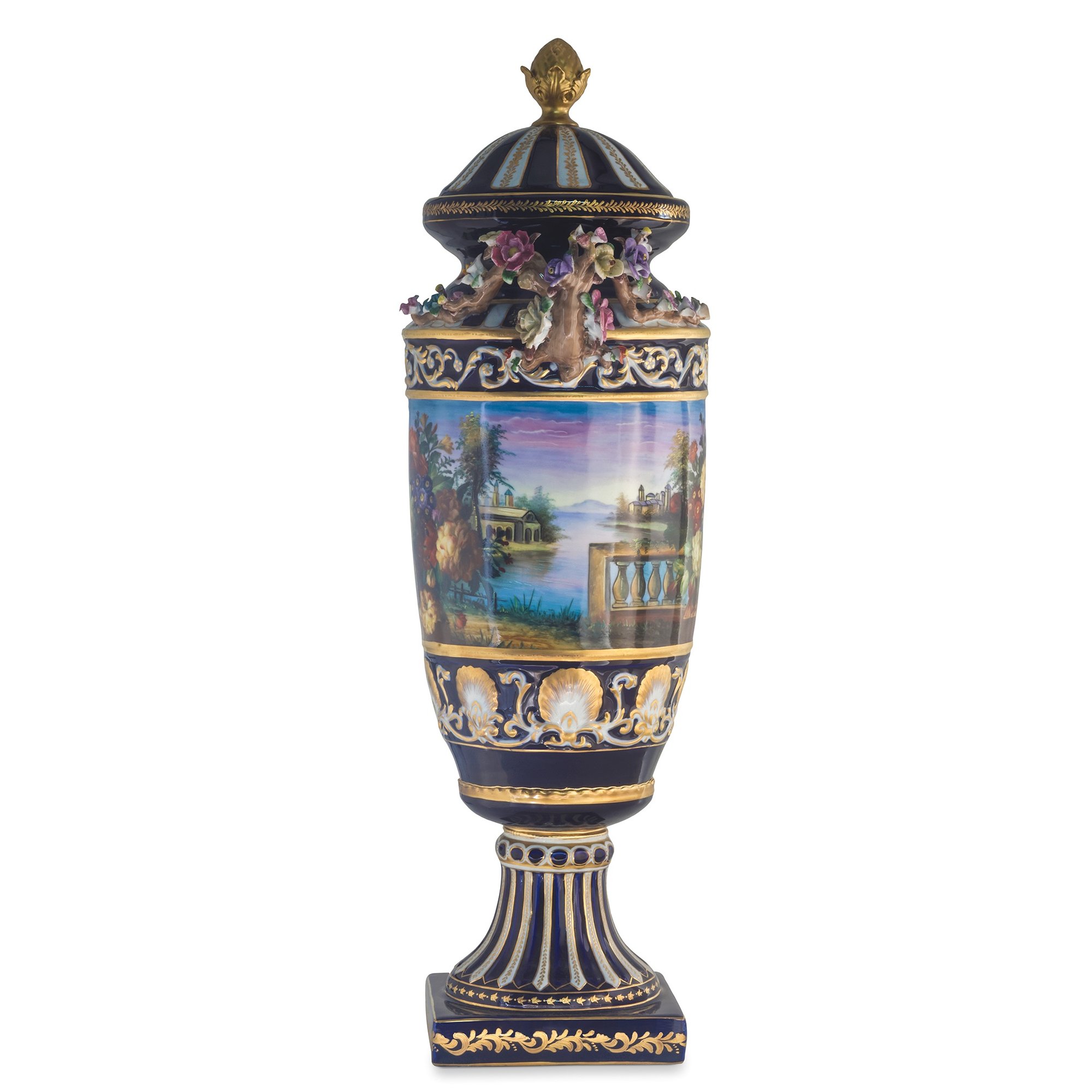 The vase's body sits on top of a flared stem, and a porcelain square base. The incredibly detailed three-dimensional porcelain flowers highlight this piece. The dark blue color of the vase is gorgeous. The piece's hand-painted motif. Each side depicts classical Rococo scenes. The vase is executed in shades of green, pink, and yellow. It's entirely painted by hand and composed of porcelain. Adorned by three dimensional porcelain flowers throughout the handles. Such vivid detail from the lid all the way down to the base.