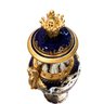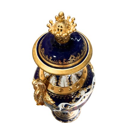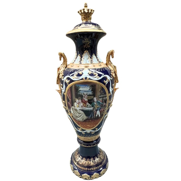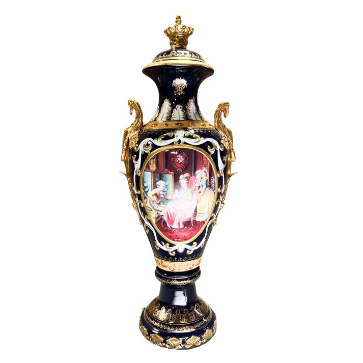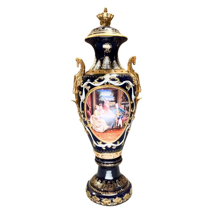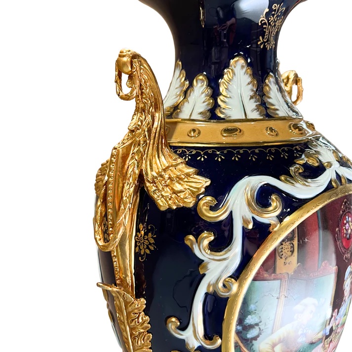 The dark blue color of the vase is nothing short of striking and sophisticated, creating a vivid backdrop for the hand-painted motif that graces its surface. On each side, classical French style society scenes come to life, featuring individuals in period clothing interacting with each other. Executed in shades of green, red, and yellow, these scenes transport you to a bygone era.