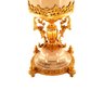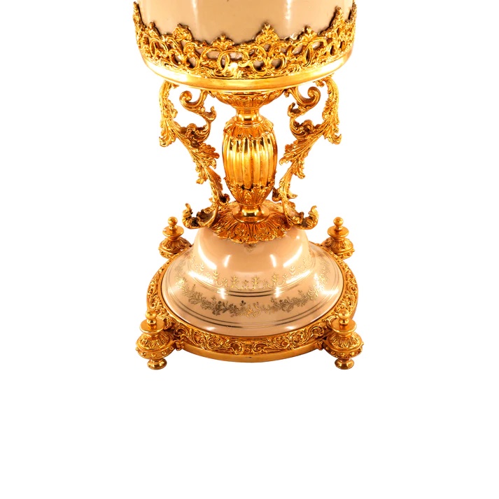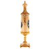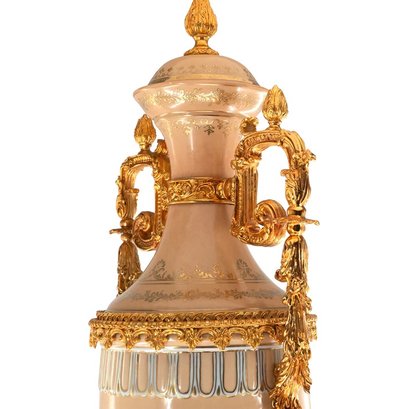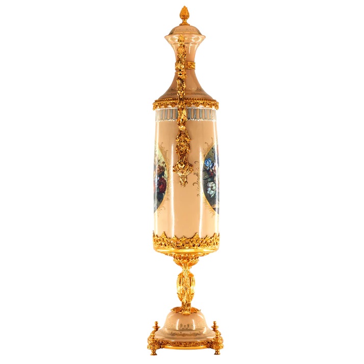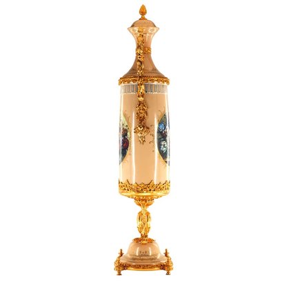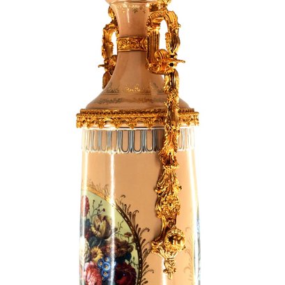 Up for auction is an exceptional porcelain vase. The vase’s body sits on top of a flared stem, and a bronze circle base. This piece is highlighted by the incredibly detailed bronze handles. The beige color of the vase is warm and elegant, creating a vivid backdrop for the piece’s hand painted motif. Depicting a still life scene, the vase shows an array of flowers, executed in shades of red, yellow, and blue. It’s completely painted by hand and composed of porcelain with bronze details. The vase measures 41 inches in height and is truly striking.