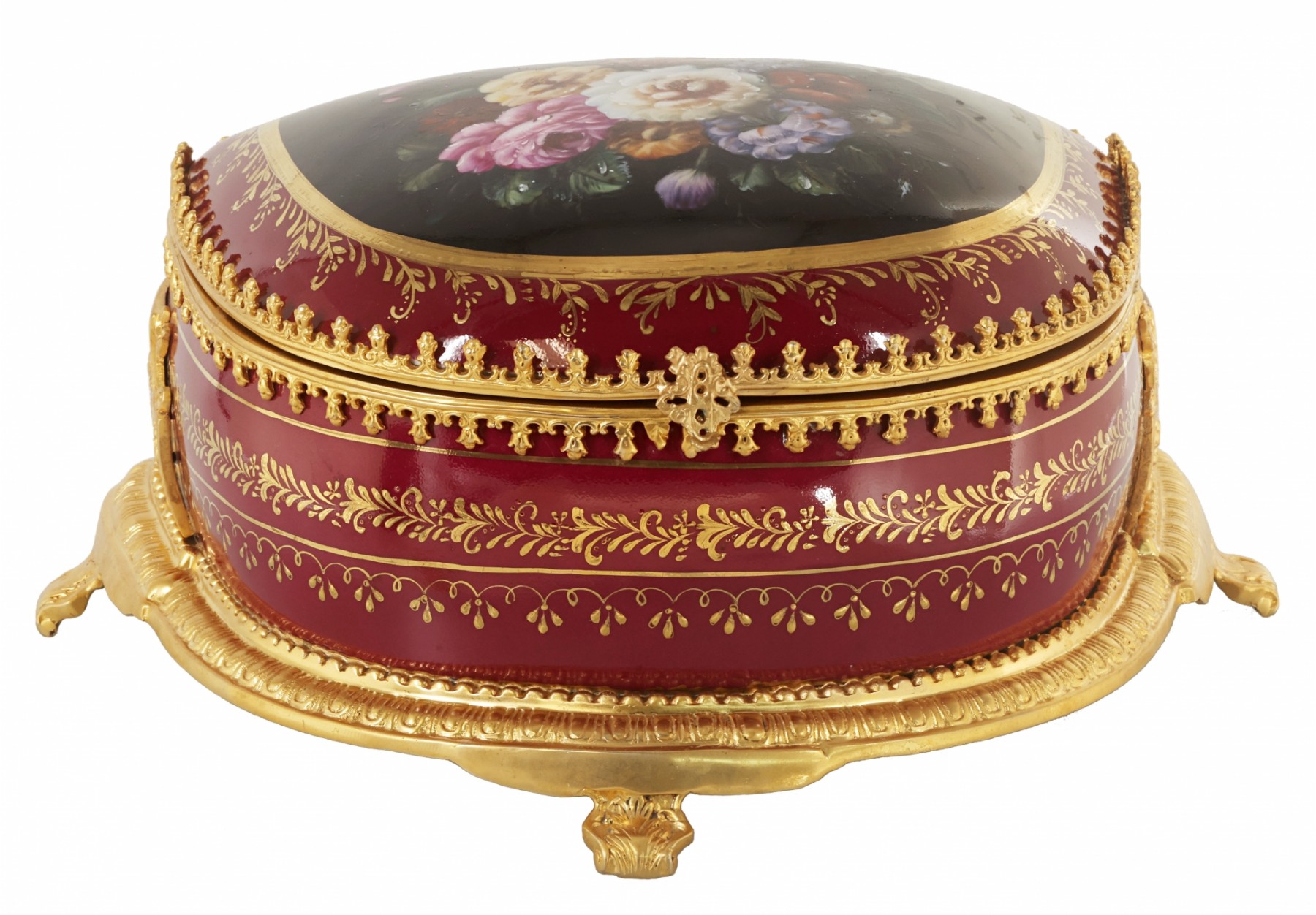 Up for auction is a hand painted porcelain jewlery box with lid. The bronze base highlights the hand painted natural motif of the box. Done in a quintessential Rococo style, the red of the jar makes the perfect backdrop for the floral elements and gold highlights. It has never been used and measures 12 inches in height.