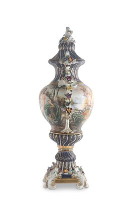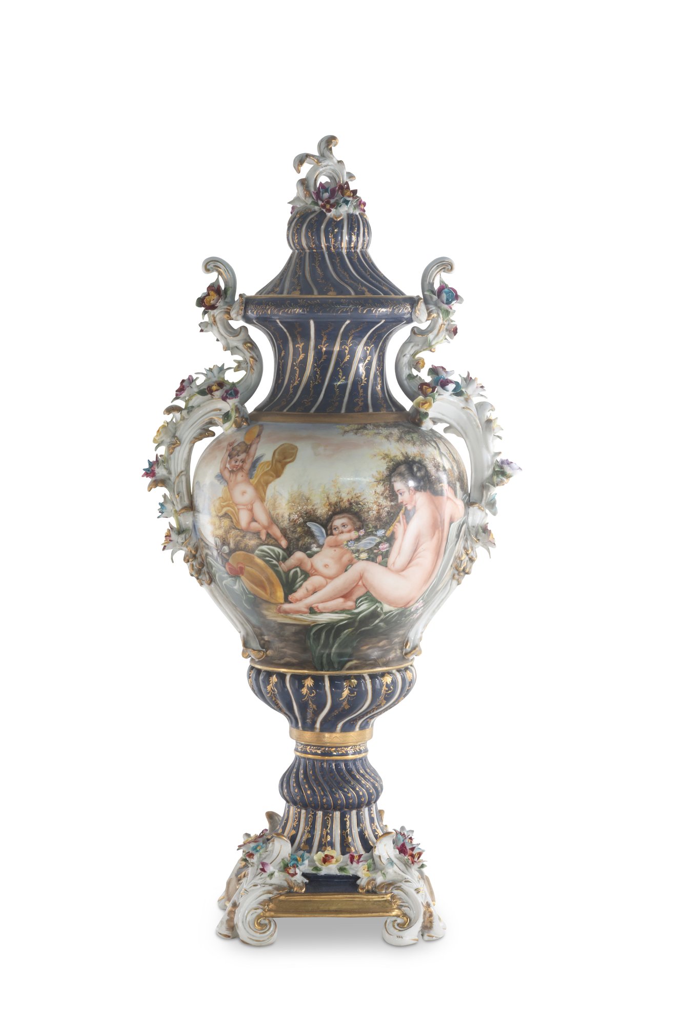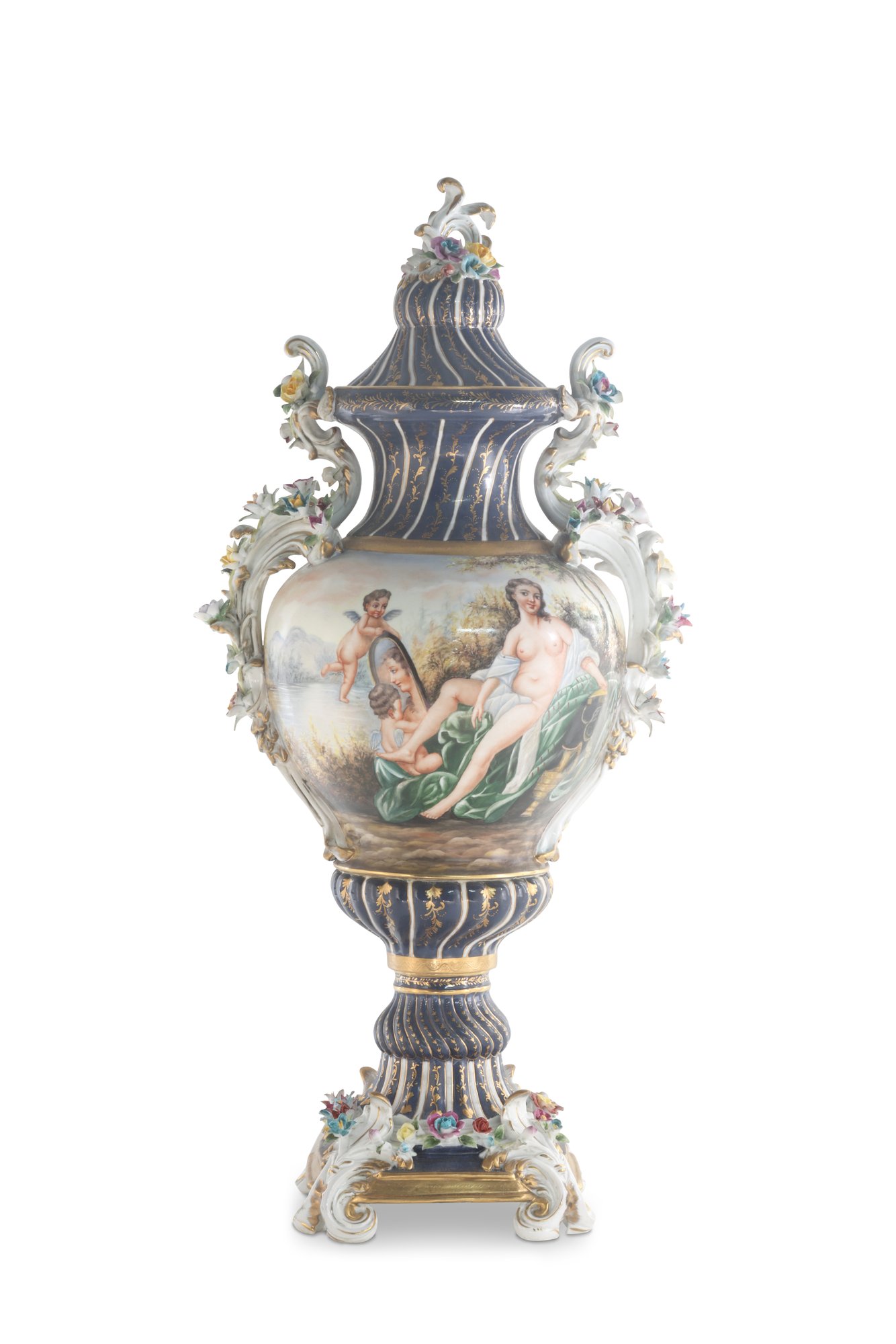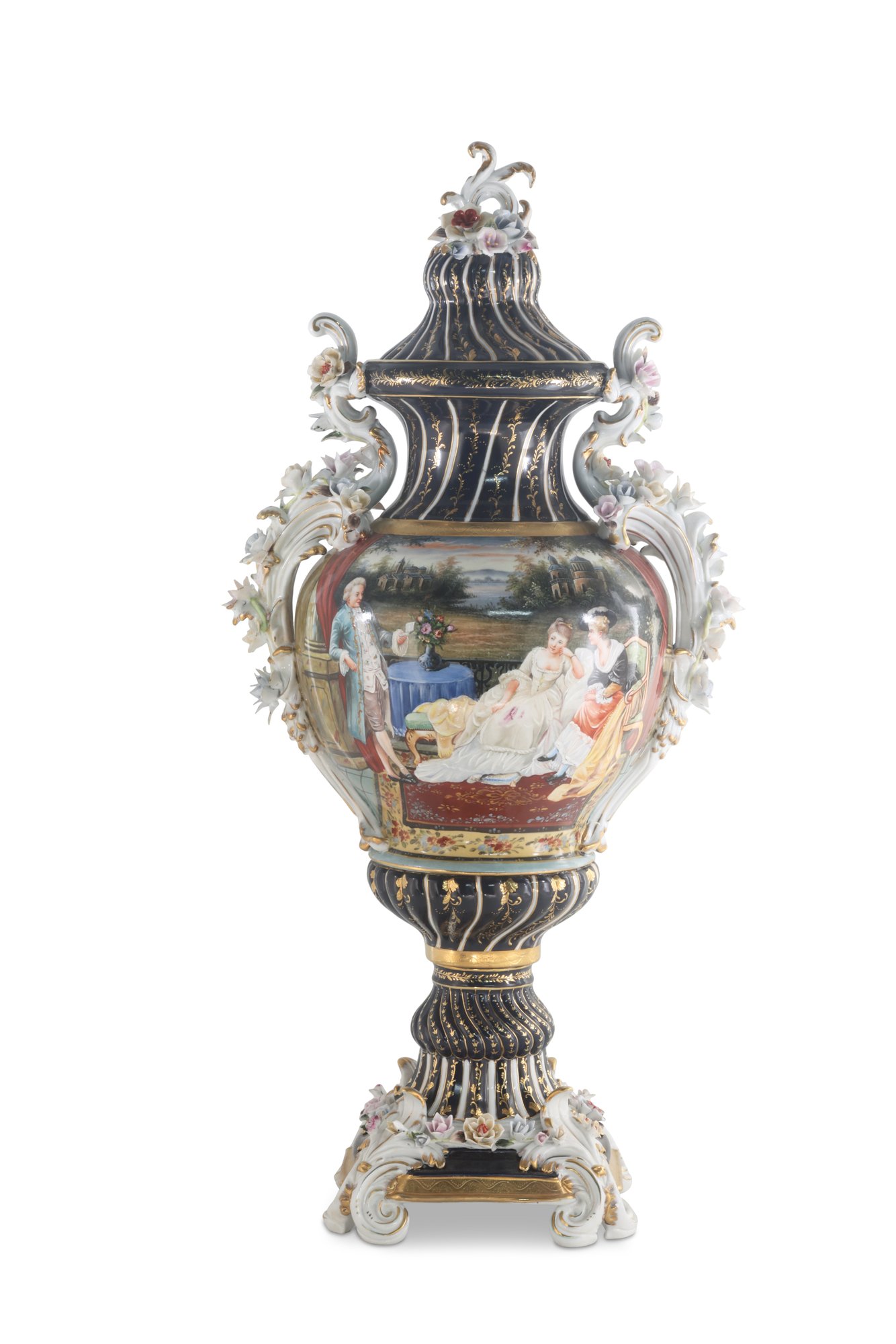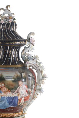 The vase's body sits on top of a flared stem, and a porcelain square base. The incredibly detailed three-dimensional porcelain flowers highlight this piece. The dark blue and white color of the vase is gorgeous. The piece's hand-painted motif. Each side depicts classical Rococo scenes. The vase is executed in shades of green, pink, and yellow. It's entirely painted by hand and composed of porcelain. Adorned by three dimensional porcelain flowers throughout the handles and base. Such vivid detail from the lid all the way down to the base.