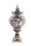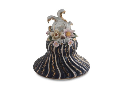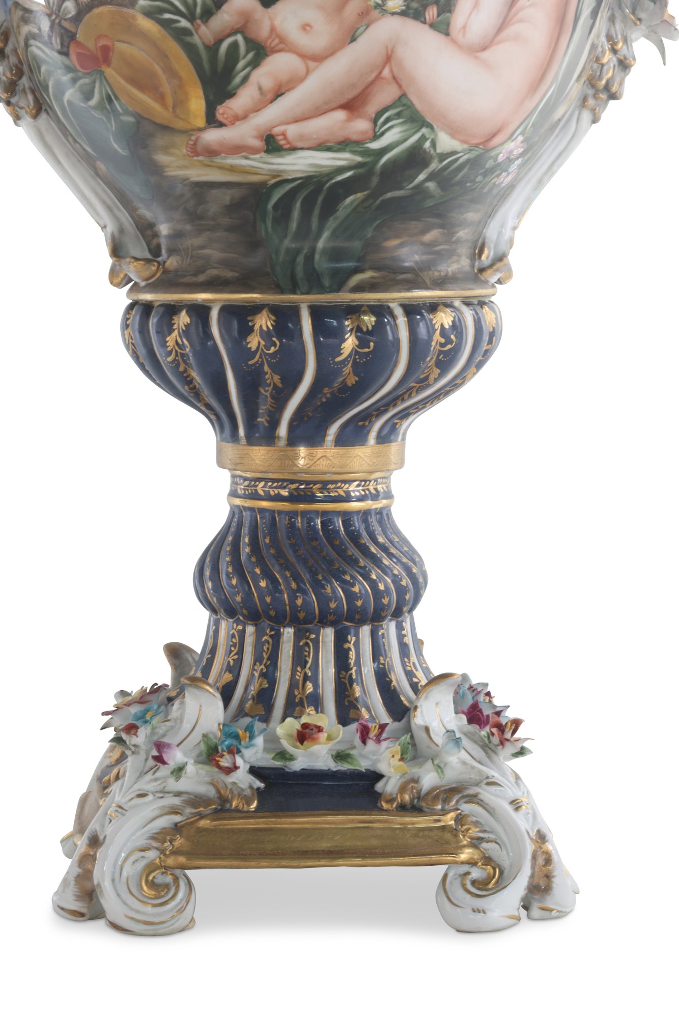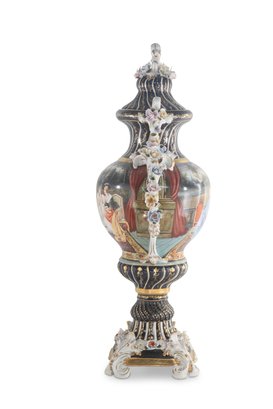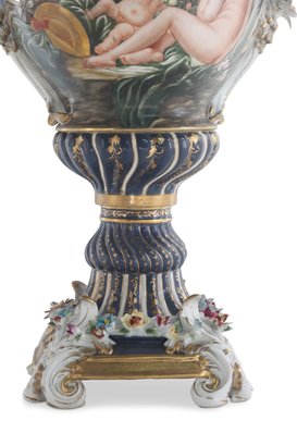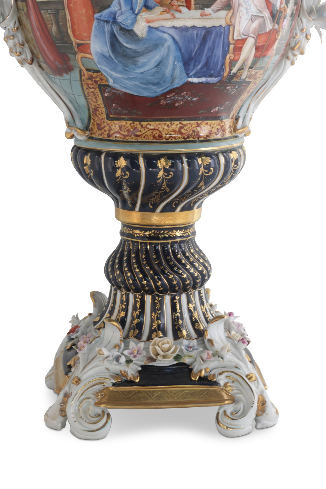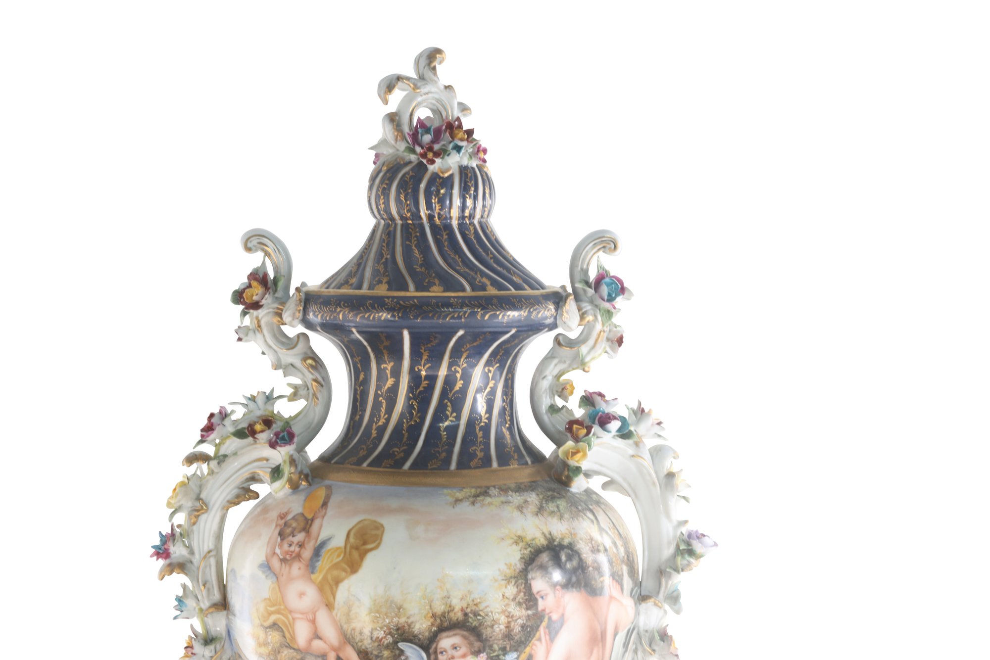The vase's body sits on top of a flared stem, and a porcelain square base. The incredibly detailed three-dimensional porcelain flowers highlight this piece. The dark blue and white color of the vase is gorgeous. The piece's hand-painted motif. Each side depicts classical Rococo scenes. The vase is executed in shades of green, pink, and yellow. It's entirely painted by hand and composed of porcelain. Adorned by three dimensional porcelain flowers throughout the handles and base. Such vivid detail from the lid all the way down to the base.