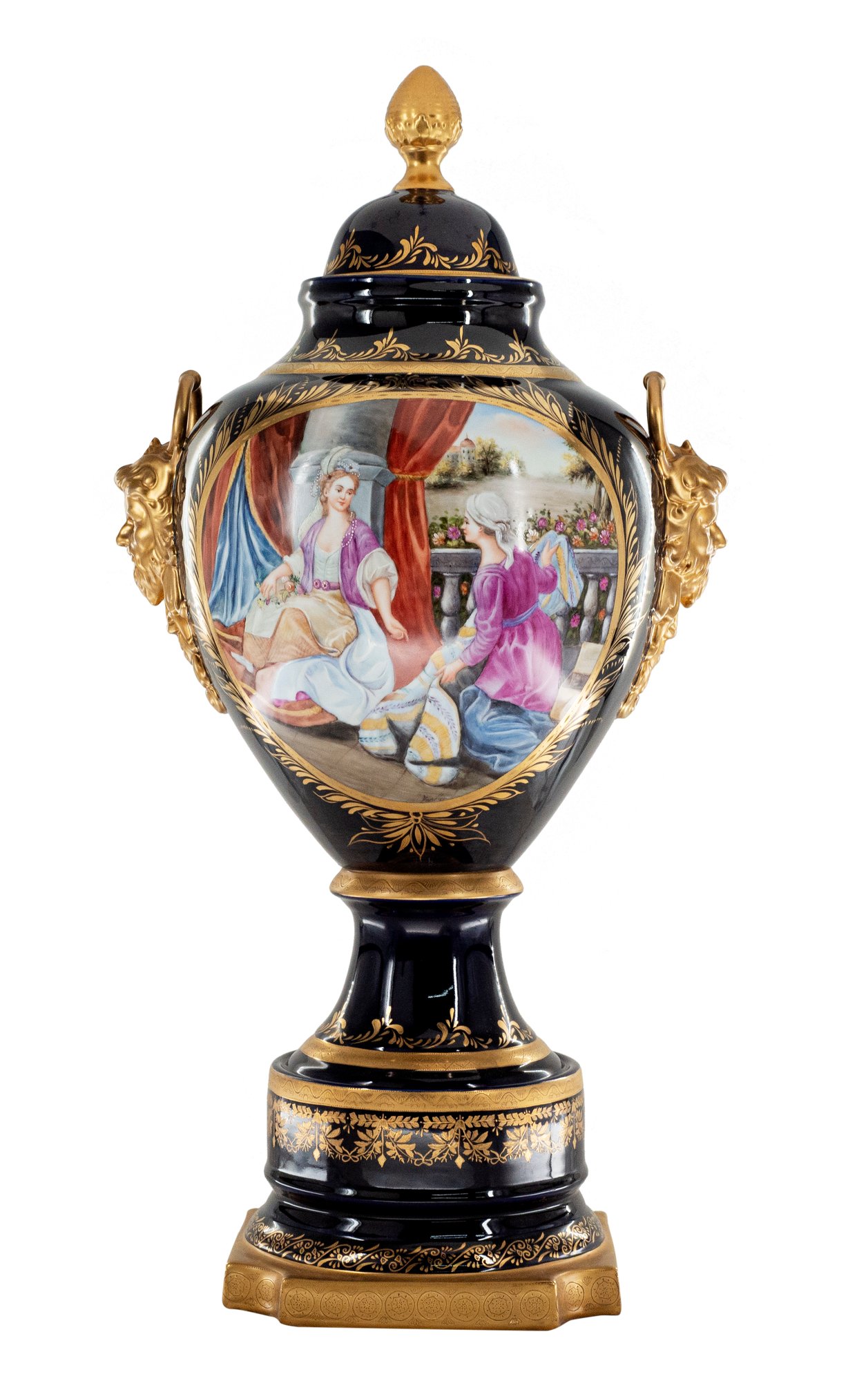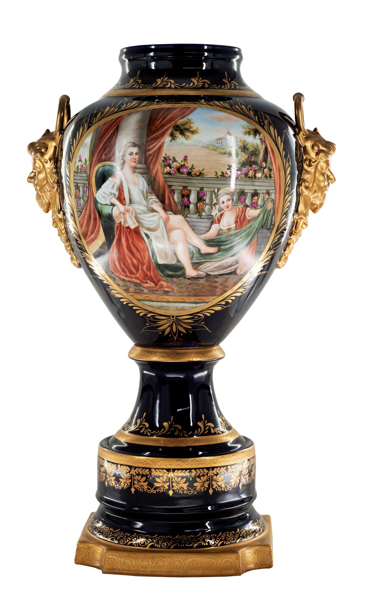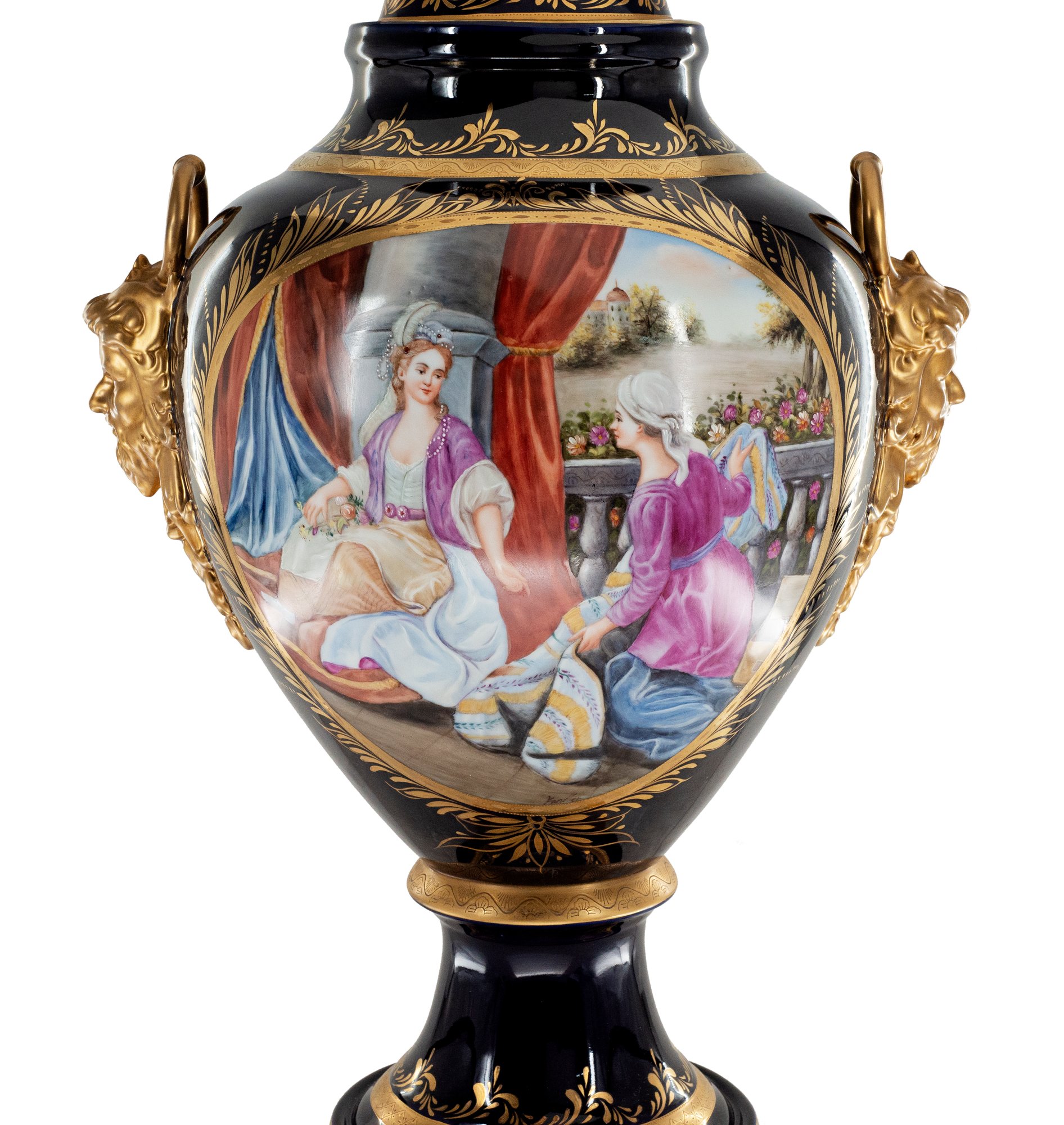 Up for auction is classic porcelain vase. The vase’s body sits on top of a flared stem, and a circular base. This piece is highlighted by the incredibly detailed mythological handles as well as the bronze element on the lid. The dark color of the vase is striking and sophisticated, creating a vivid backdrop for the piece’s Rococo motif. This vase depicts a gorgeous society scene set against nature in shades of pink, purple, and blue. It’s completely painted by hand and composed of porcelain and bronze. The vase has never been used and measures 31 inches in height.