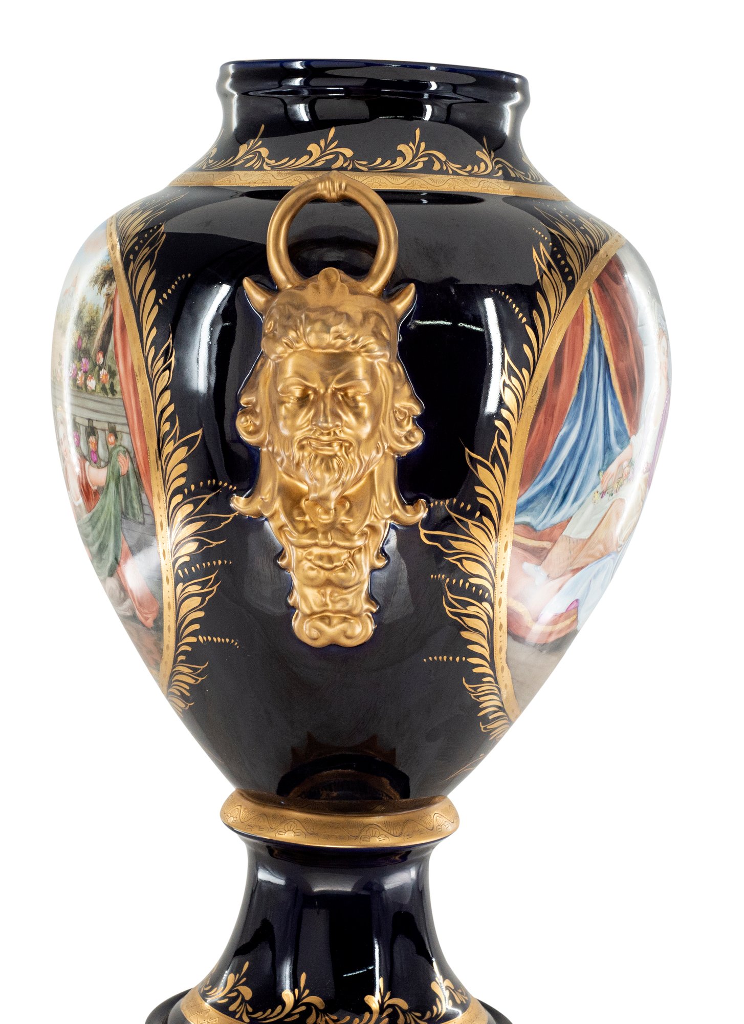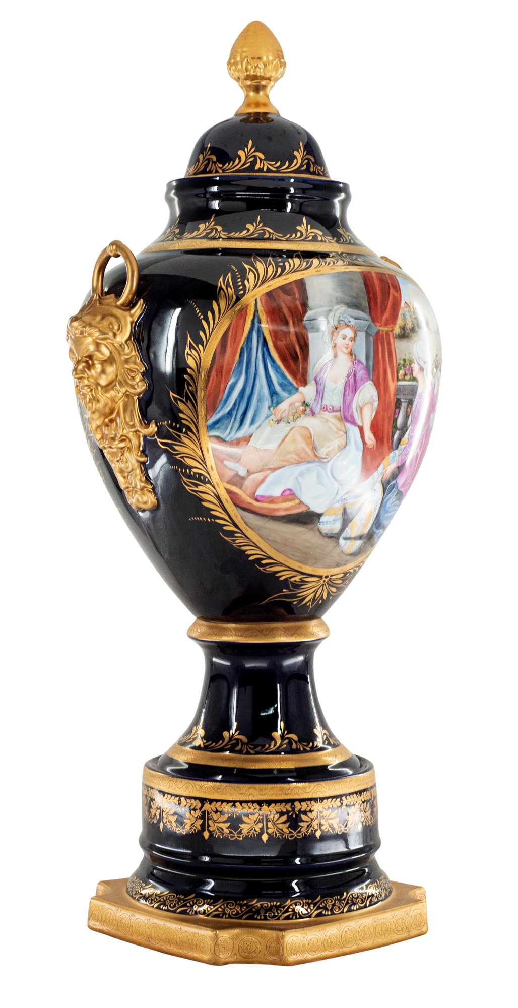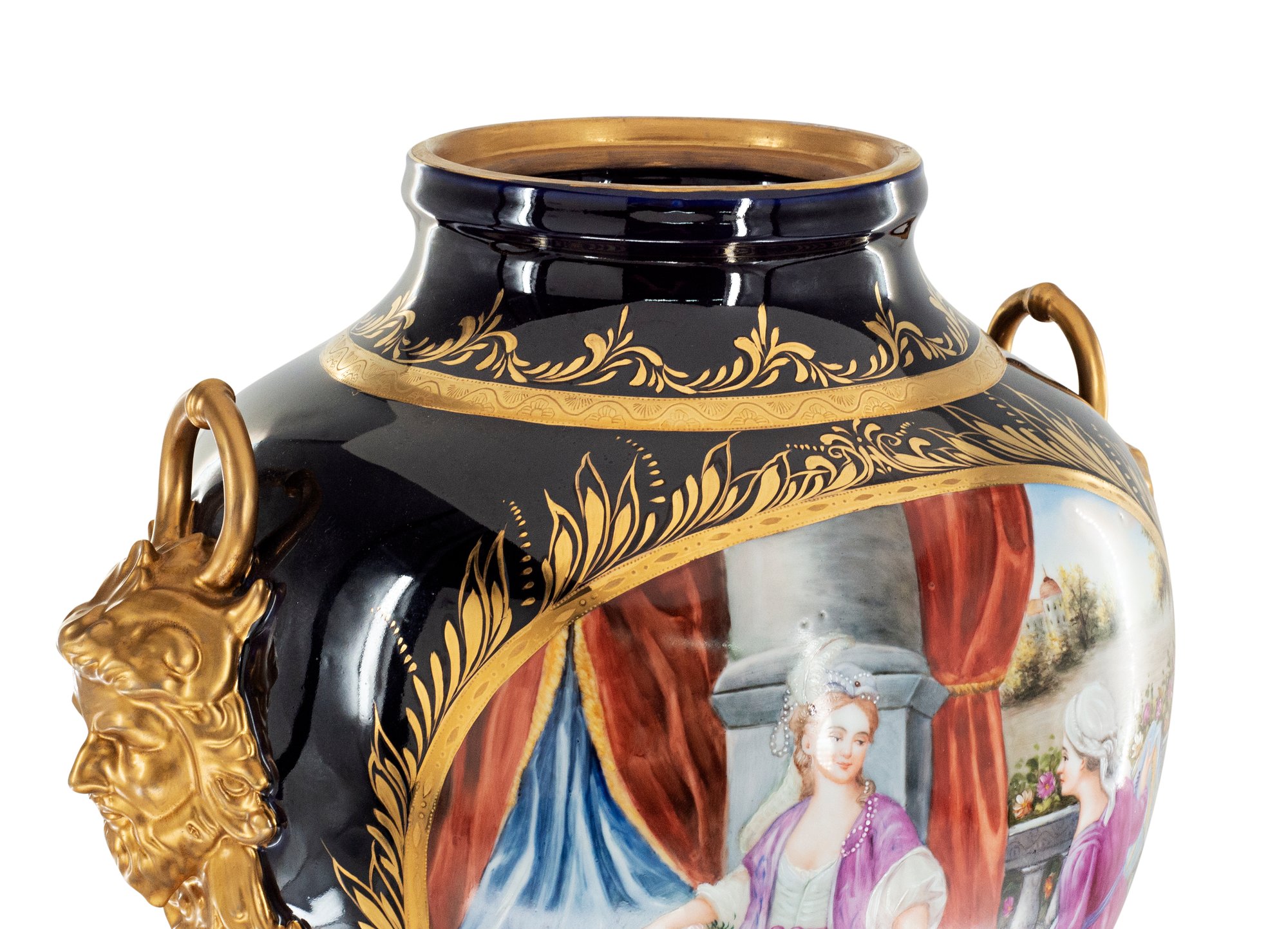 Up for auction is classic porcelain vase. The vase’s body sits on top of a flared stem, and a circular base. This piece is highlighted by the incredibly detailed mythological handles as well as the bronze element on the lid. The dark color of the vase is striking and sophisticated, creating a vivid backdrop for the piece’s Rococo motif. This vase depicts a gorgeous society scene set against nature in shades of pink, purple, and blue. It’s completely painted by hand and composed of porcelain and bronze. The vase has never been used and measures 31 inches in height.