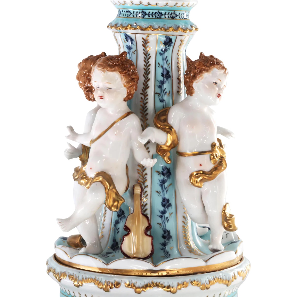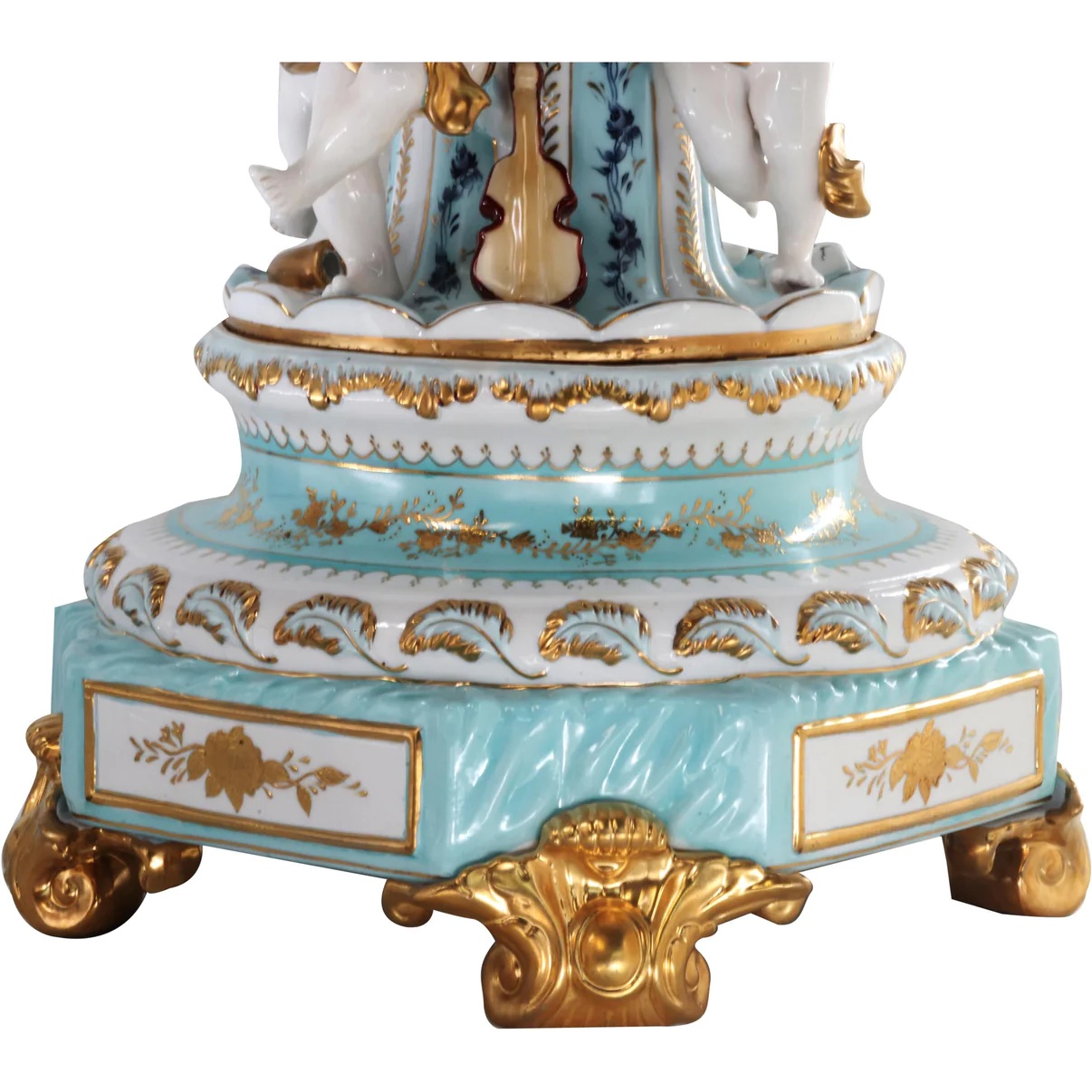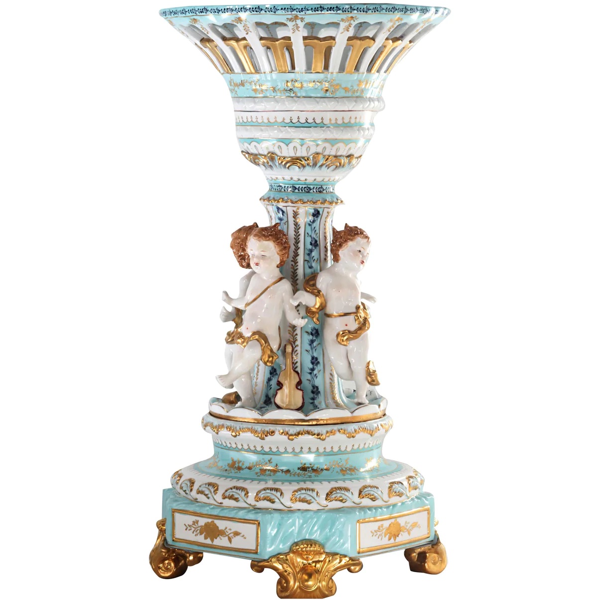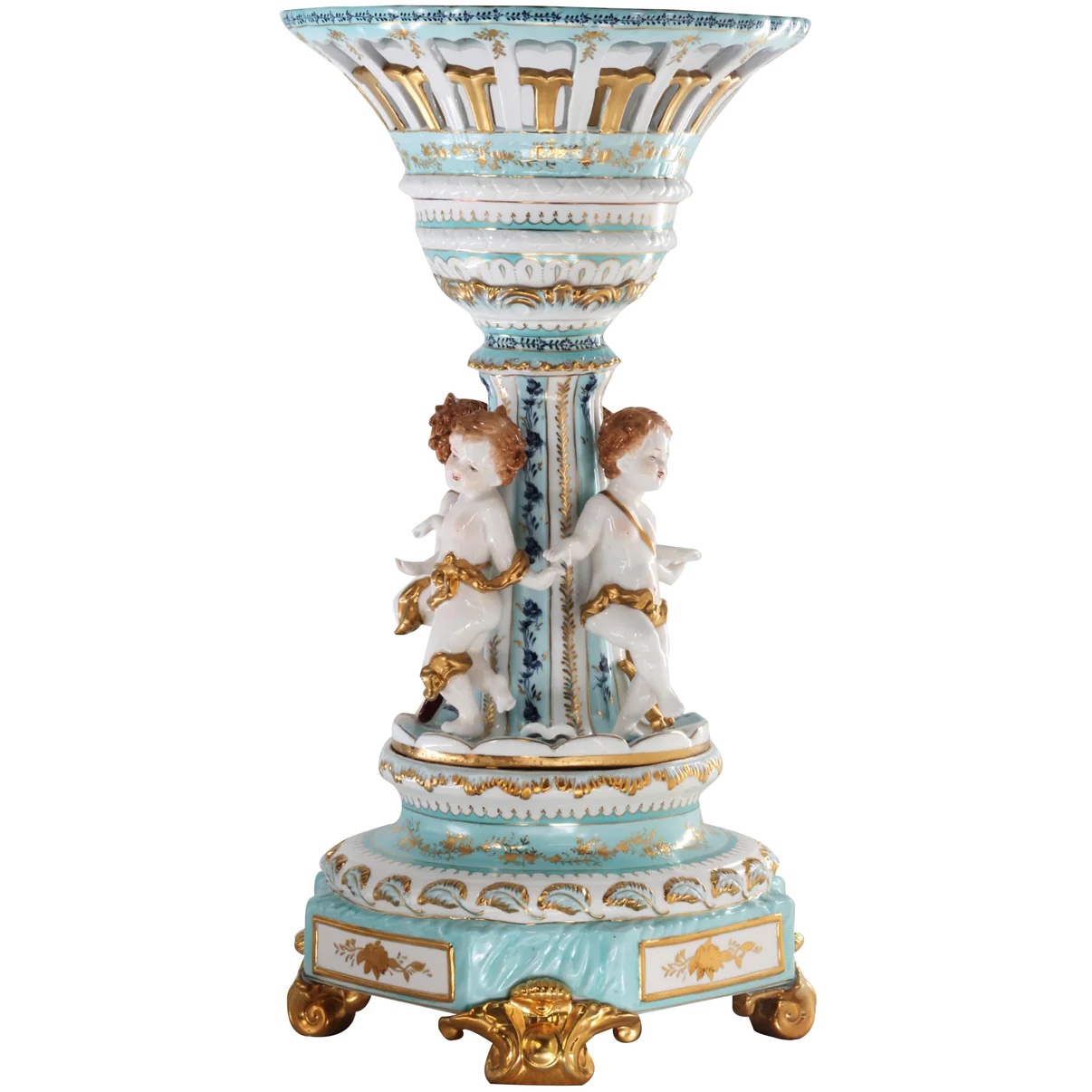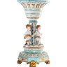 The hand-painted bowl’s body sits on top of an incredibly intricate Rococo style scene incorporating porcelain figures of cherubs. The teal color of the bowl is striking and sophisticated, creating a vivid backdrop for the piece’s floral motif. It is an exquisite piece of art, sure to become a conversation piece in any home.