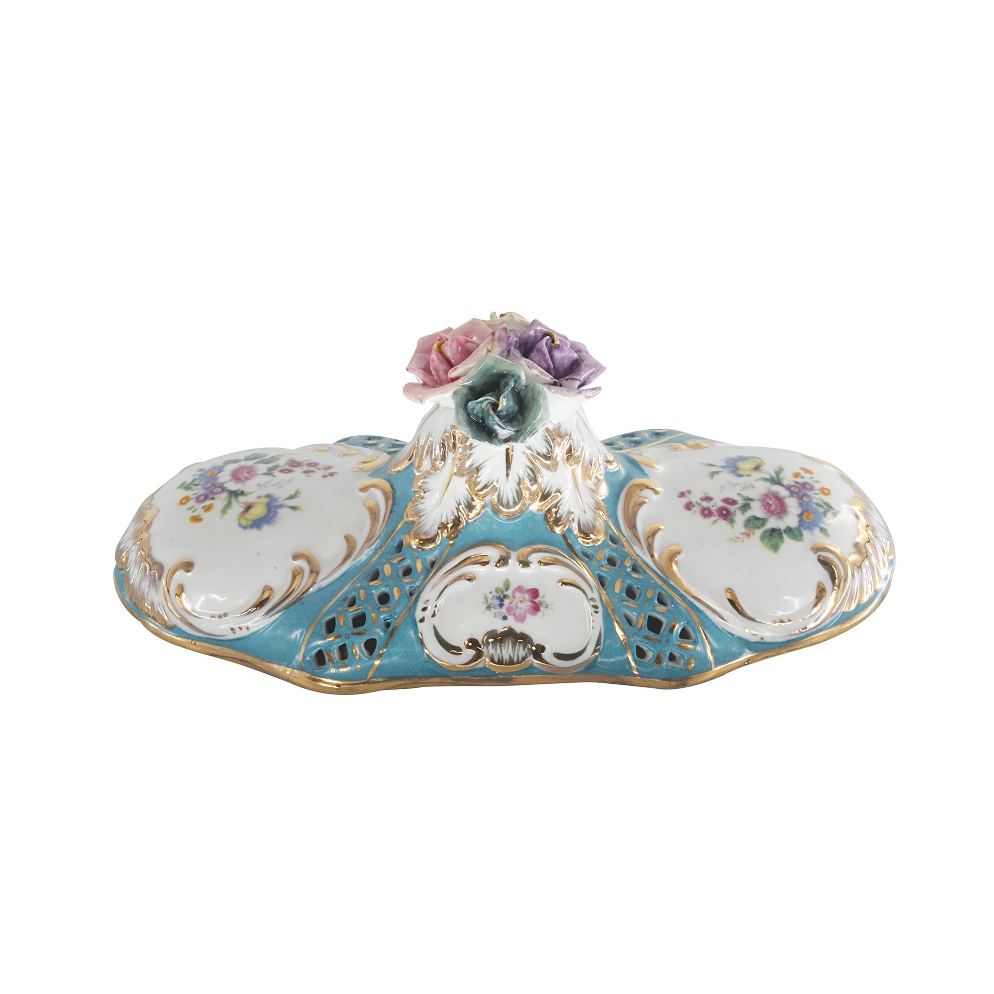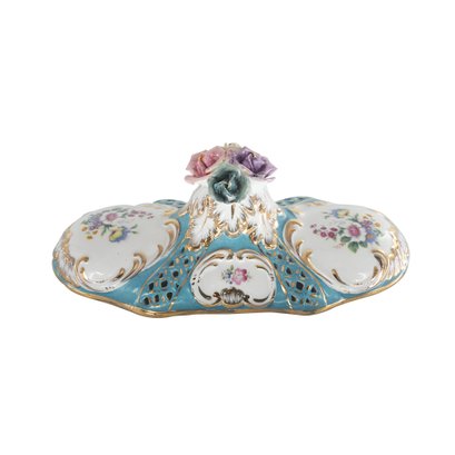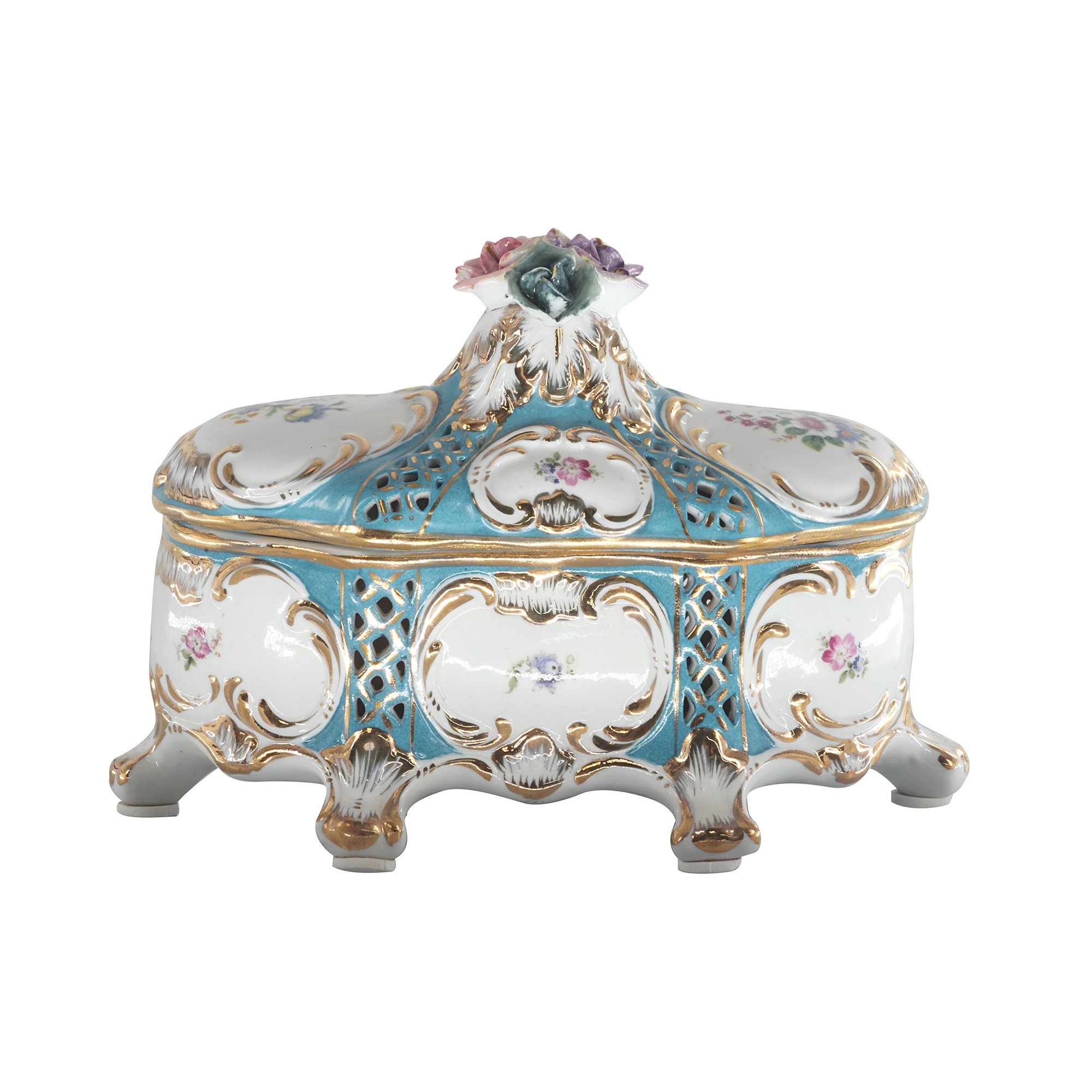 Introducing a timeless treasure, the Hand-painted Porcelain Flower Jar With Lid. Exuding the classic charm of the Rococo style, this hand-painted jar is a paragon of artisanal craftsmanship. Set against a serene light blue backdrop, the floral motif comes alive, evoking a sense of refined elegance. It's not merely a piece of decor but a work of art that adds character and grace to any shelf or tabletop. The intricate details and the thoughtfully chosen color palette make it an ideal statement piece, perfect for those with an appreciation for beauty and artistry. Elevate any room's aesthetic with this exquisite accent decor, a testament to timeless elegance.