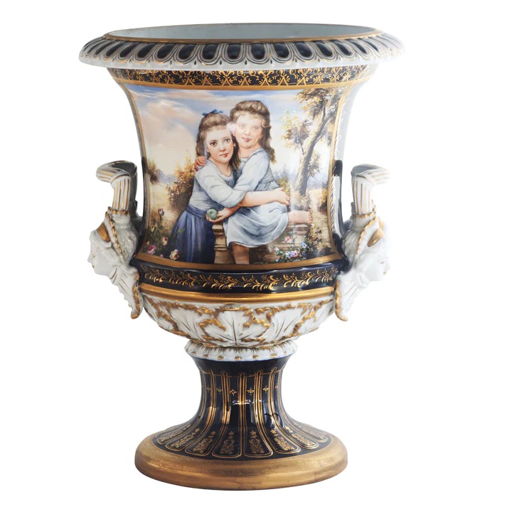 A beautiful porcelain krater shaped pot. The pot's body sits on top of an ornate circular base, and is highlighted by its incredibly detailed handles. The dark blue and white color of the vase is soft and playful, creating a vivid backdrop for the piece's hand painted Rococo motif. Depicting a different scene on each side, it shows society figures in period clothing interacting with each other. The backgrounds depict natural landscapes and incorporate architectural details.