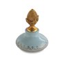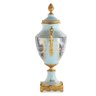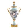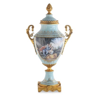 This exceptional porcelain covered urn stands as a testament to artistry and craftsmanship. Its body rests gracefully atop an ornate bronze flared stem, while a square base ensures stability and visual appeal. What truly sets this vase apart are the incredibly detailed bronze floral handles, a true marvel of intricate craftsmanship.